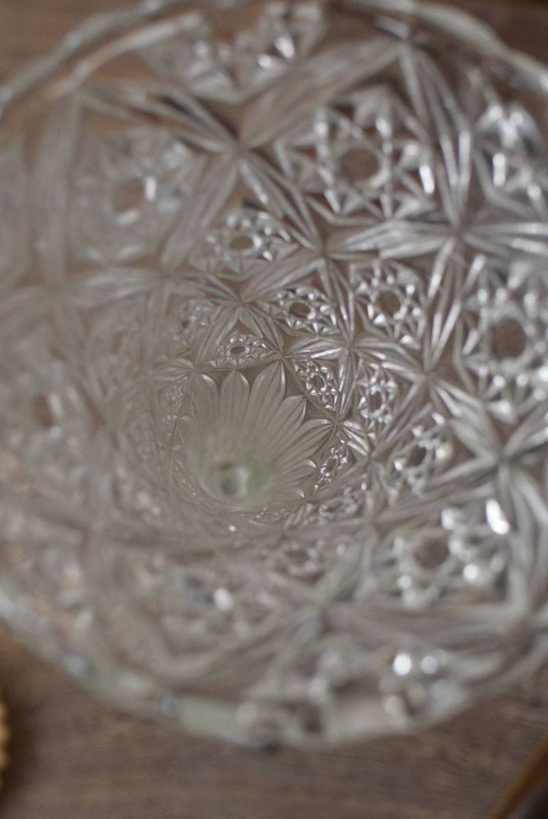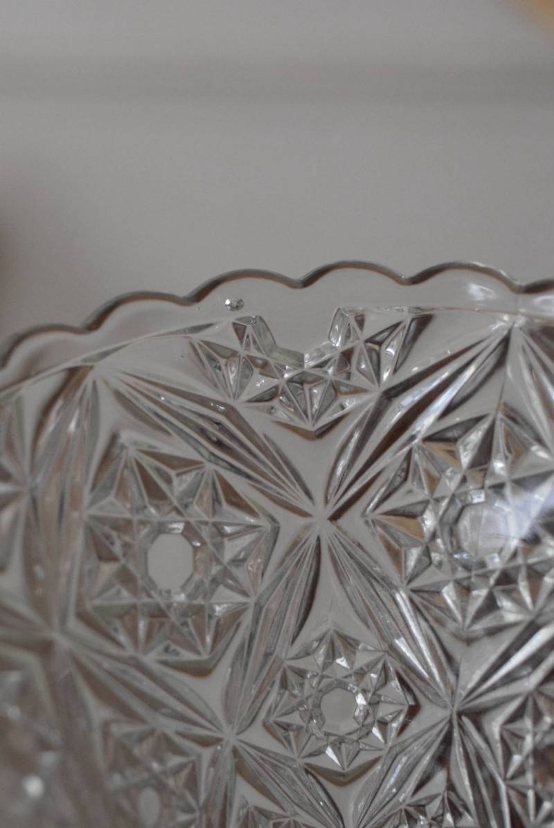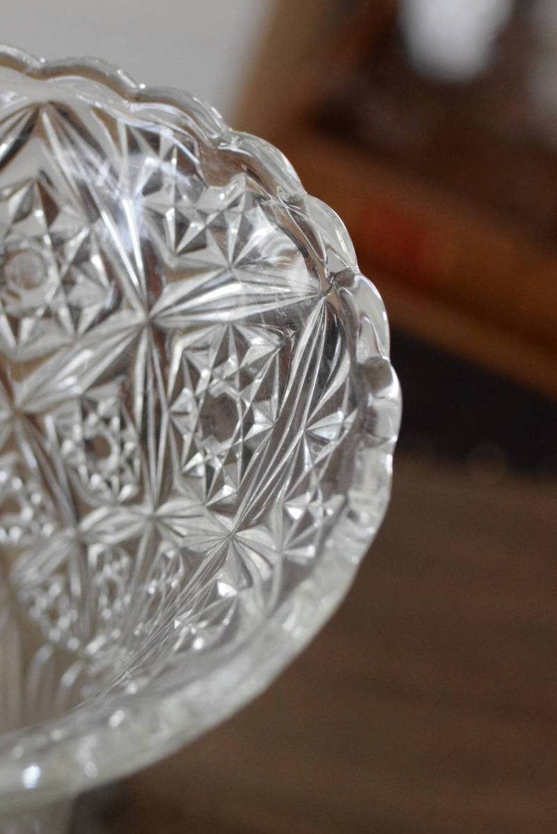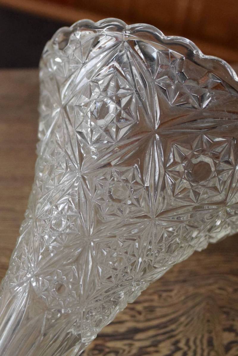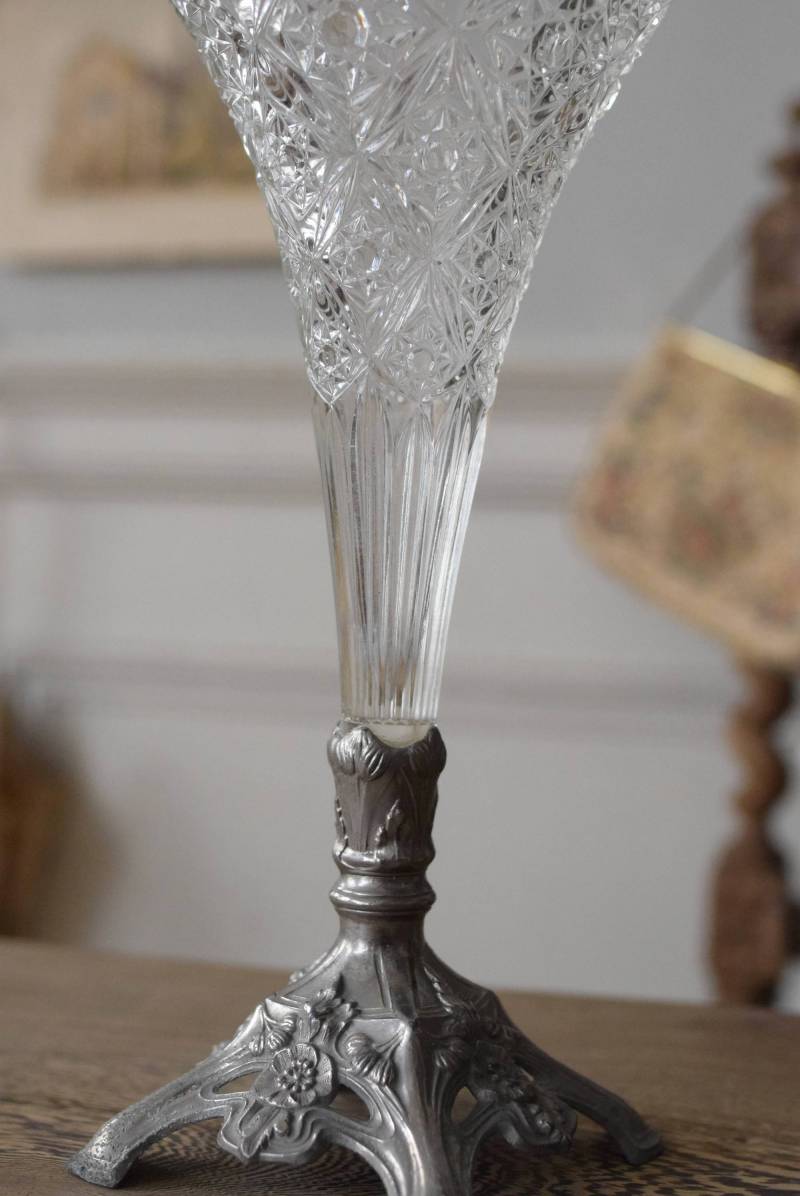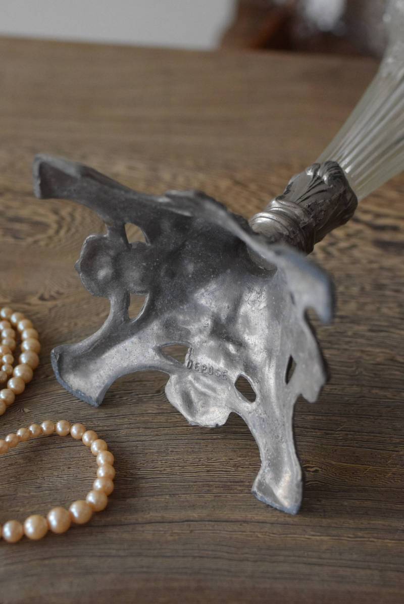 しとやかに咲いた花のようなフランスのフラワーベース。 キュッとくびれた土台からすらりと伸びたガラス部分には小花や雪の結晶を思わせるような,美しいカットが贅沢に施され、キラキラとした反射を見せてくれます。土台も同じく植物の息吹を感じさせるデザインで、繊細でありながらも、しっかりと踏ん張っているような姿が微笑ましいですね。 適度な高さがあるので、お花を飾っていない時もバランスよくディスプレイできます。もう一点同じデザインのものがあるので(フラワーベース.20B)ペアでのご使用もおすすめです。 直径 約12.5cm H 約27.5cm 土台 10.5×10.5cm