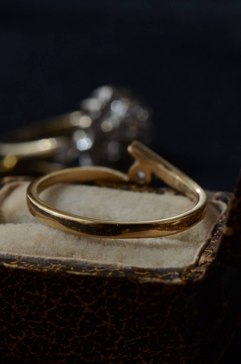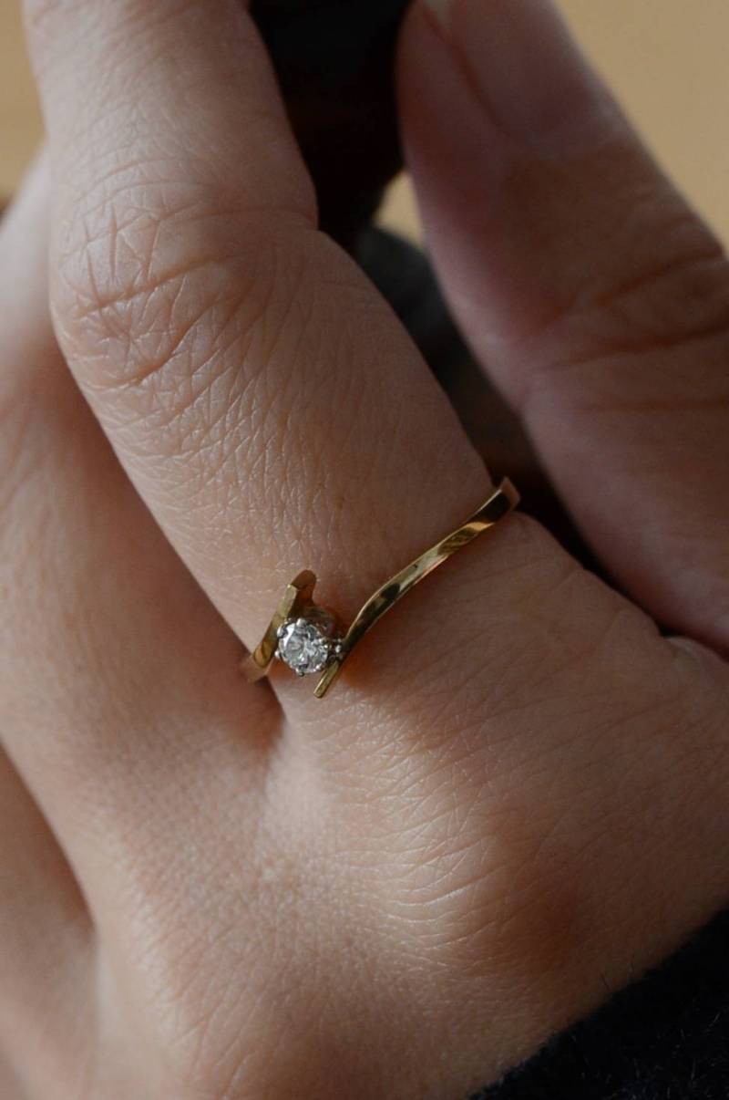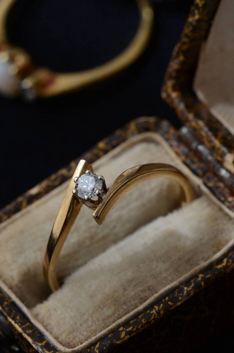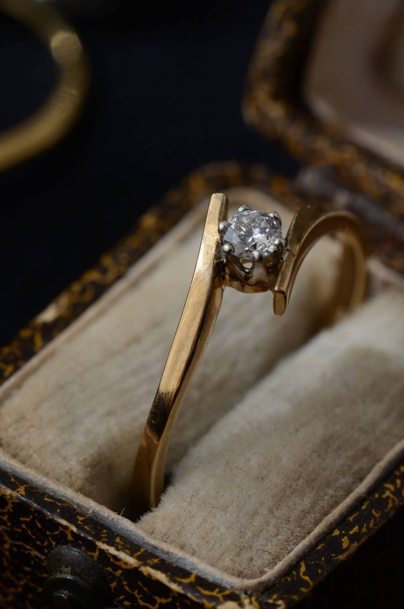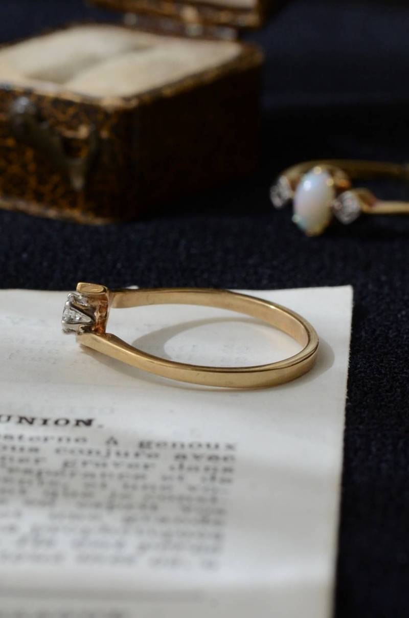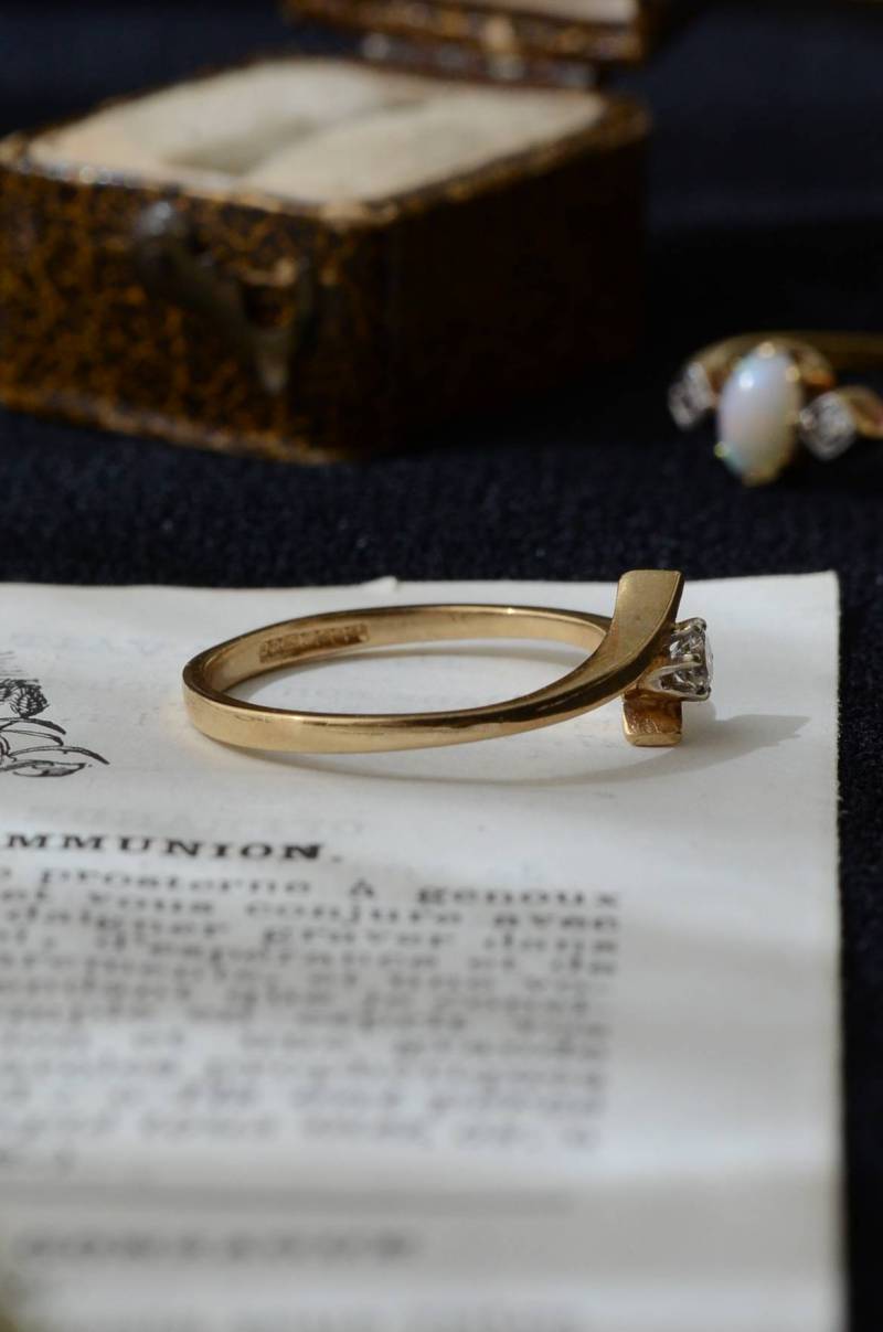 イギリスのヴィンテージリング。 幅のあるウェーブラインに1粒のダイヤモンドをそっと挟み込んだようなデザインで、優しげな雰囲気とエッジの効いたクールさを兼ね備わっています。無駄のないシンプルながらも流れるような独特な曲線使いが程よい存在感を放ってくれ、華奢なラインが引き立つデザインです。 裏面にはバーミンガム製、9カラットゴールドを示す刻印があります。写真に写っているBOXは付属しません。 サイズ 約16号弱(日本規格で計測) 幅約0.8cm