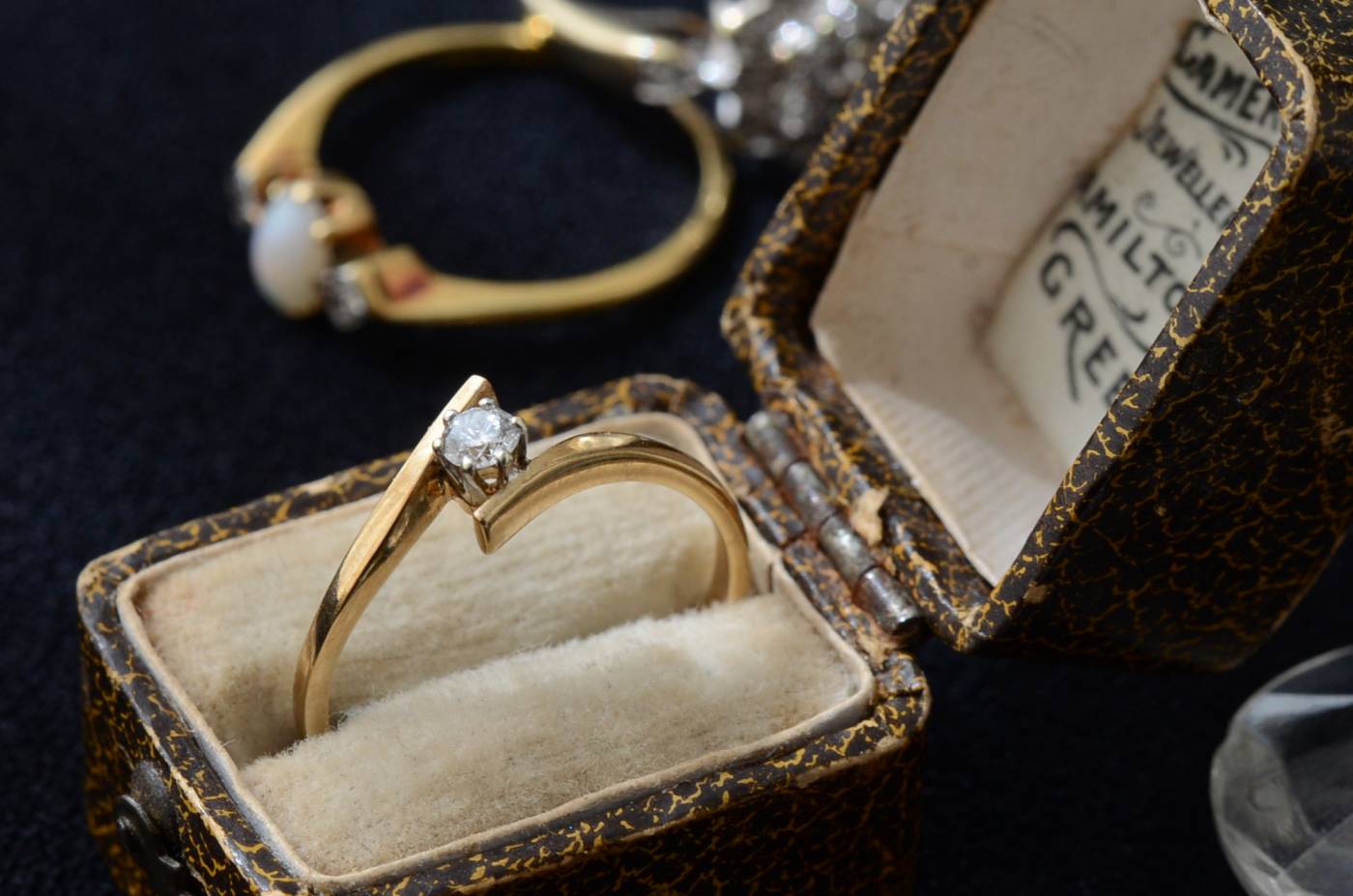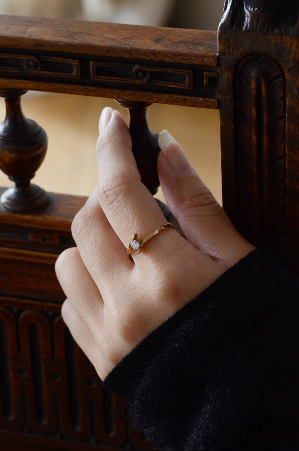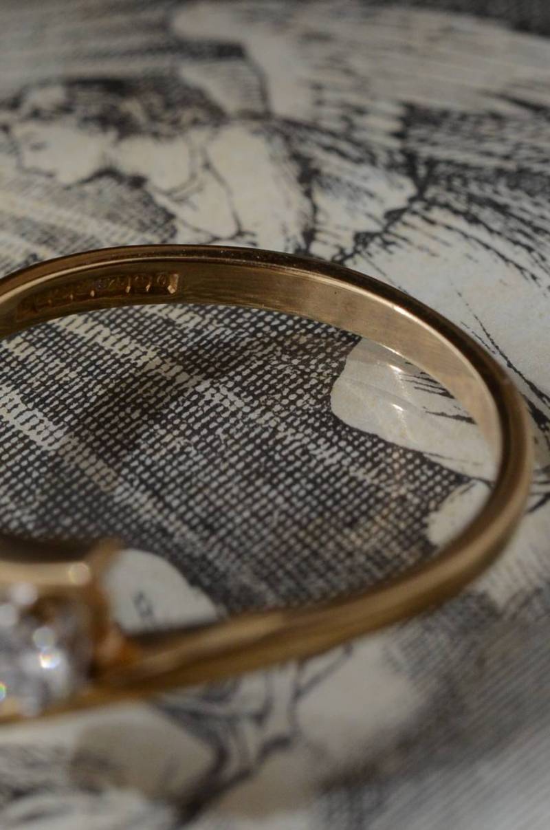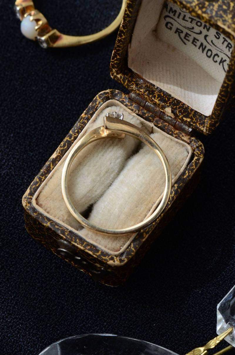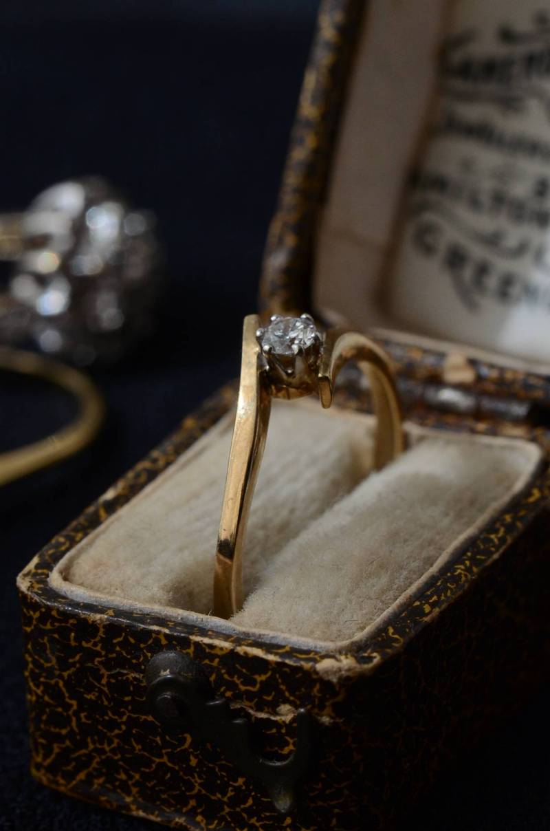 イギリスのヴィンテージリング。 幅のあるウェーブラインに1粒のダイヤモンドをそっと挟み込んだようなデザインで、優しげな雰囲気とエッジの効いたクールさを兼ね備わっています。無駄のないシンプルながらも流れるような独特な曲線使いが程よい存在感を放ってくれ、華奢なラインが引き立つデザインです。 裏面にはバーミンガム製、9カラットゴールドを示す刻印があります。写真に写っているBOXは付属しません。 サイズ 約16号弱(日本規格で計測) 幅約0.8cm