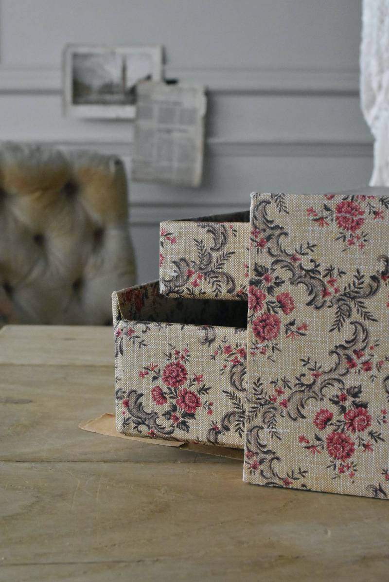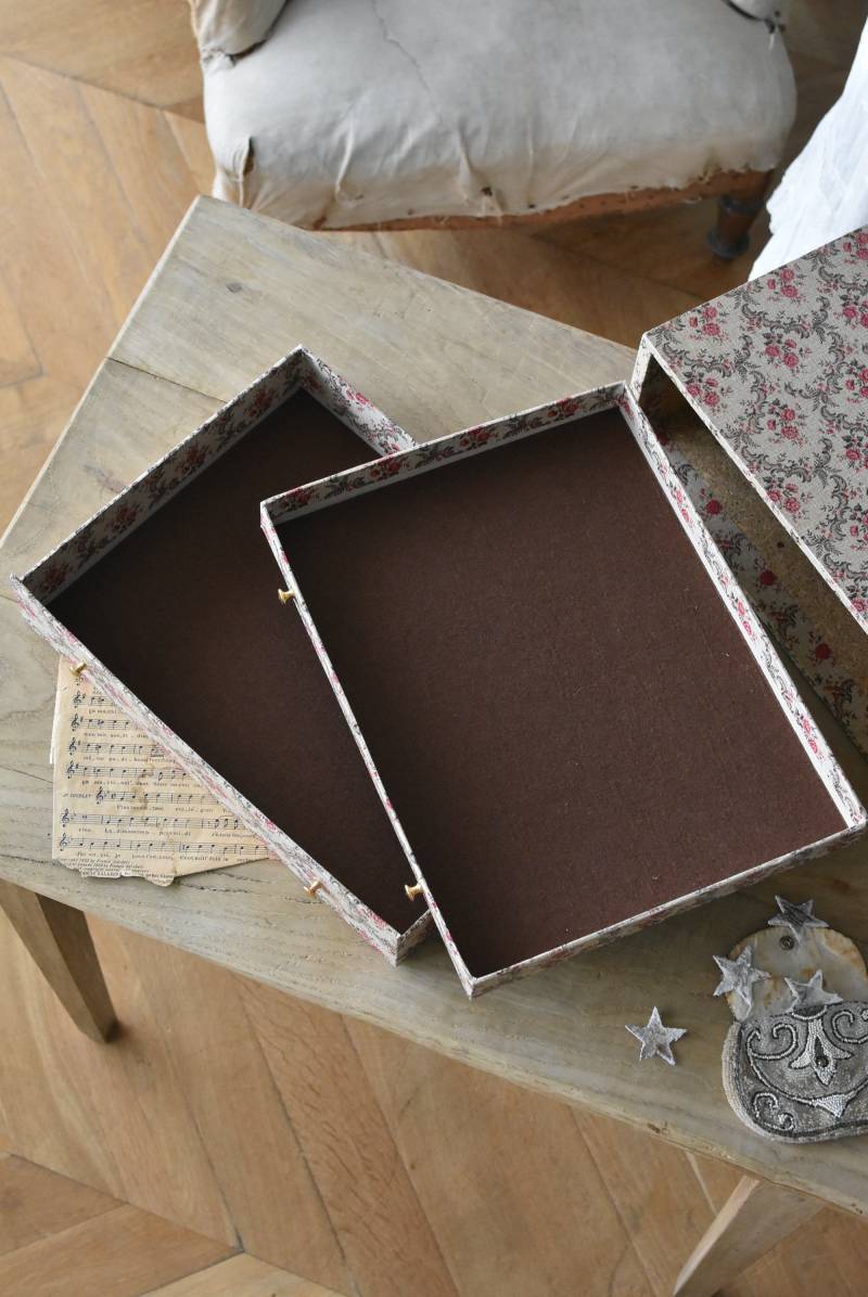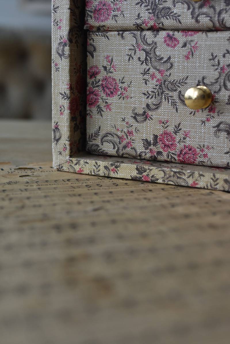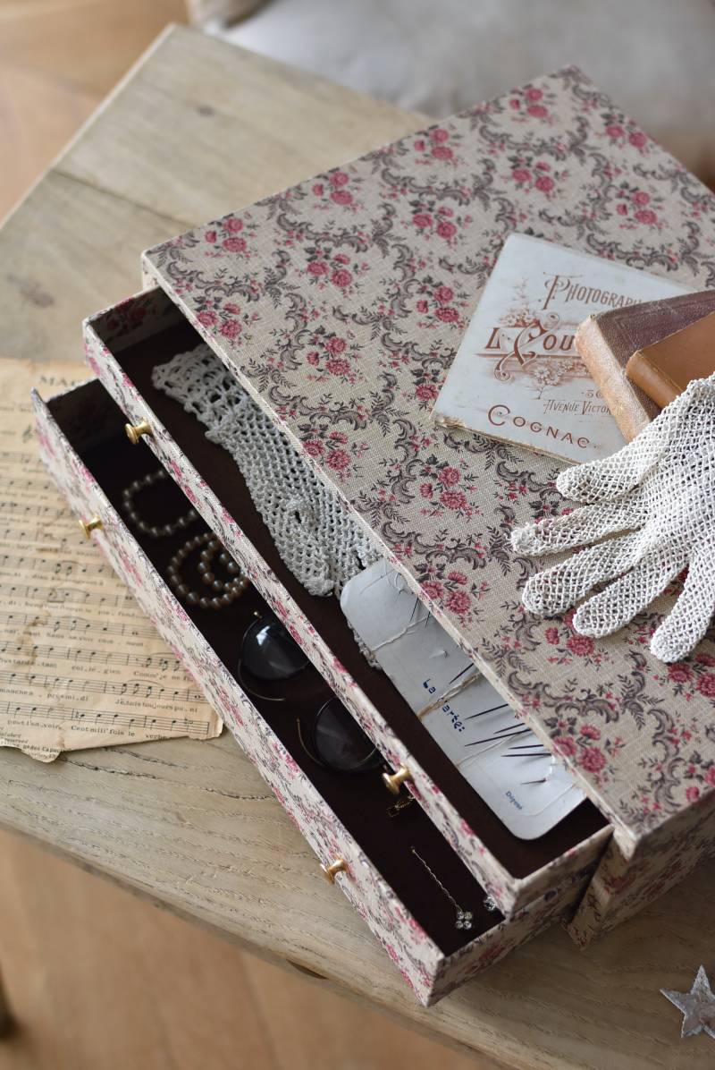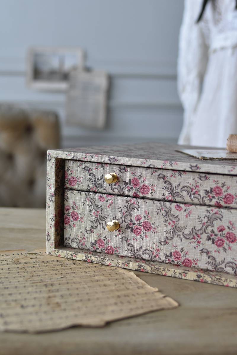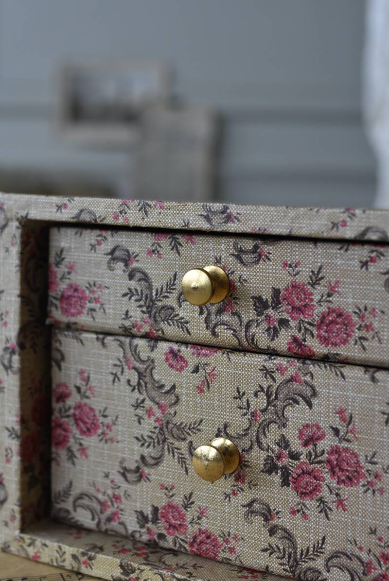 フランスのカルトナージュ2段チェスト。 カルトナージュ(Cartonnage)とは、厚紙で作られたボックスに布や紙を貼って美しく仕上げられるフランスの伝統工芸の一つ。柔らかなベージュにベリーカラーのお花がパターン模様として印字されたペーパーがボディ・引き出し側面・底面にまで丁寧にあしらわれた、可憐でちょっぴりクラシカルな印象のデザインです。深さの異なる2つの引き出しにはゴールドカラーの小さな取手が付けられており、ちょっとしたアクセントに。 引き出し内側にはブラウンカラーのフェルトが貼られており、アクセサリーなどを入れるジュエリーボックスとしても活躍してくれるアイテムです。 W 約40.5cm D 約30.5cm H 約13cm 引き出し内寸 W約37cm×D約28cm×深さ(上)約3.2cm/(下)約5.2cm