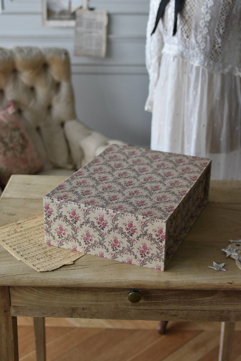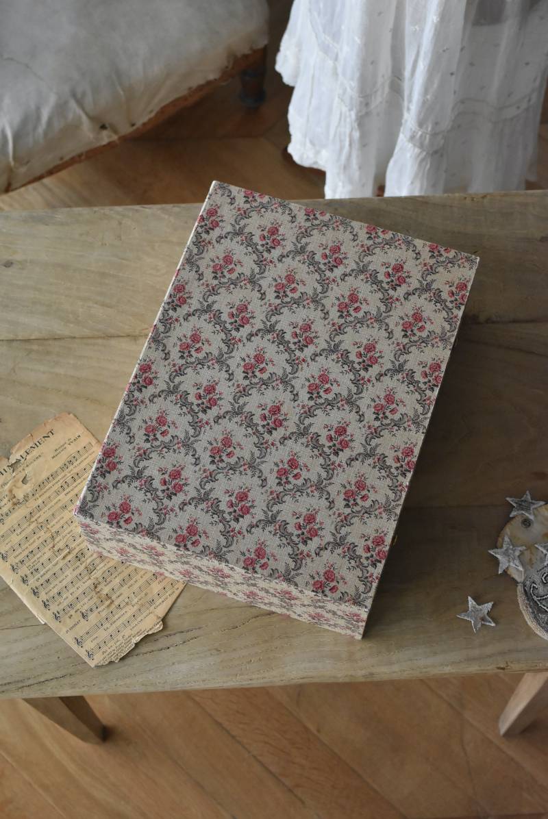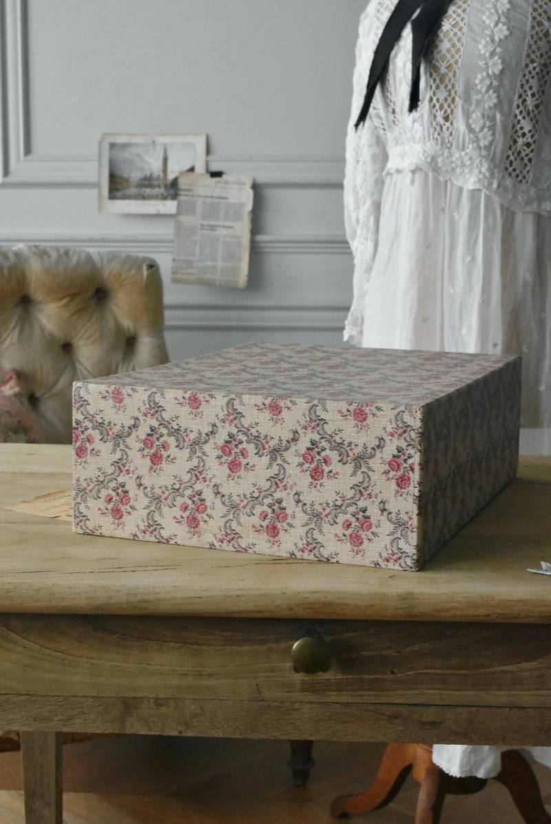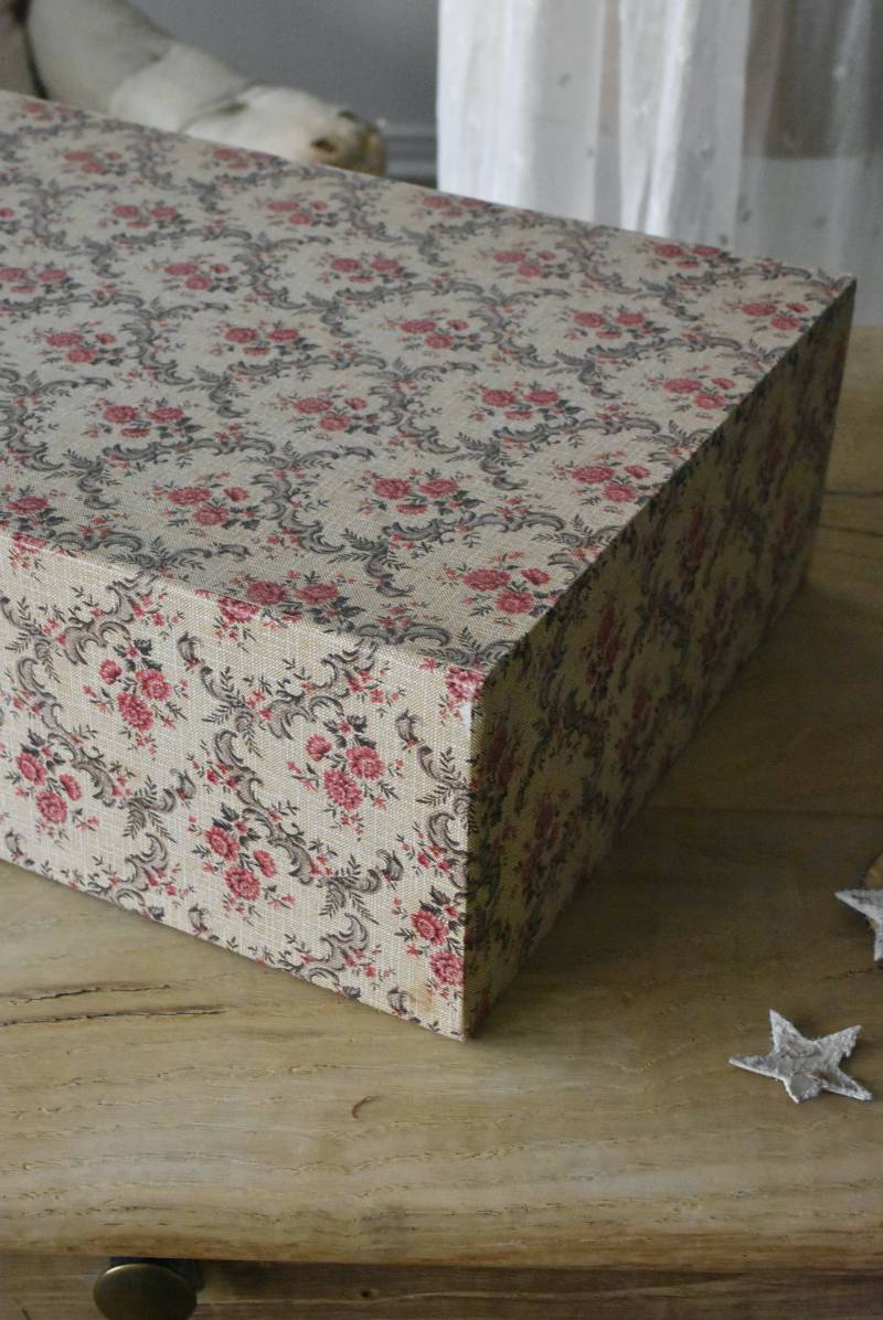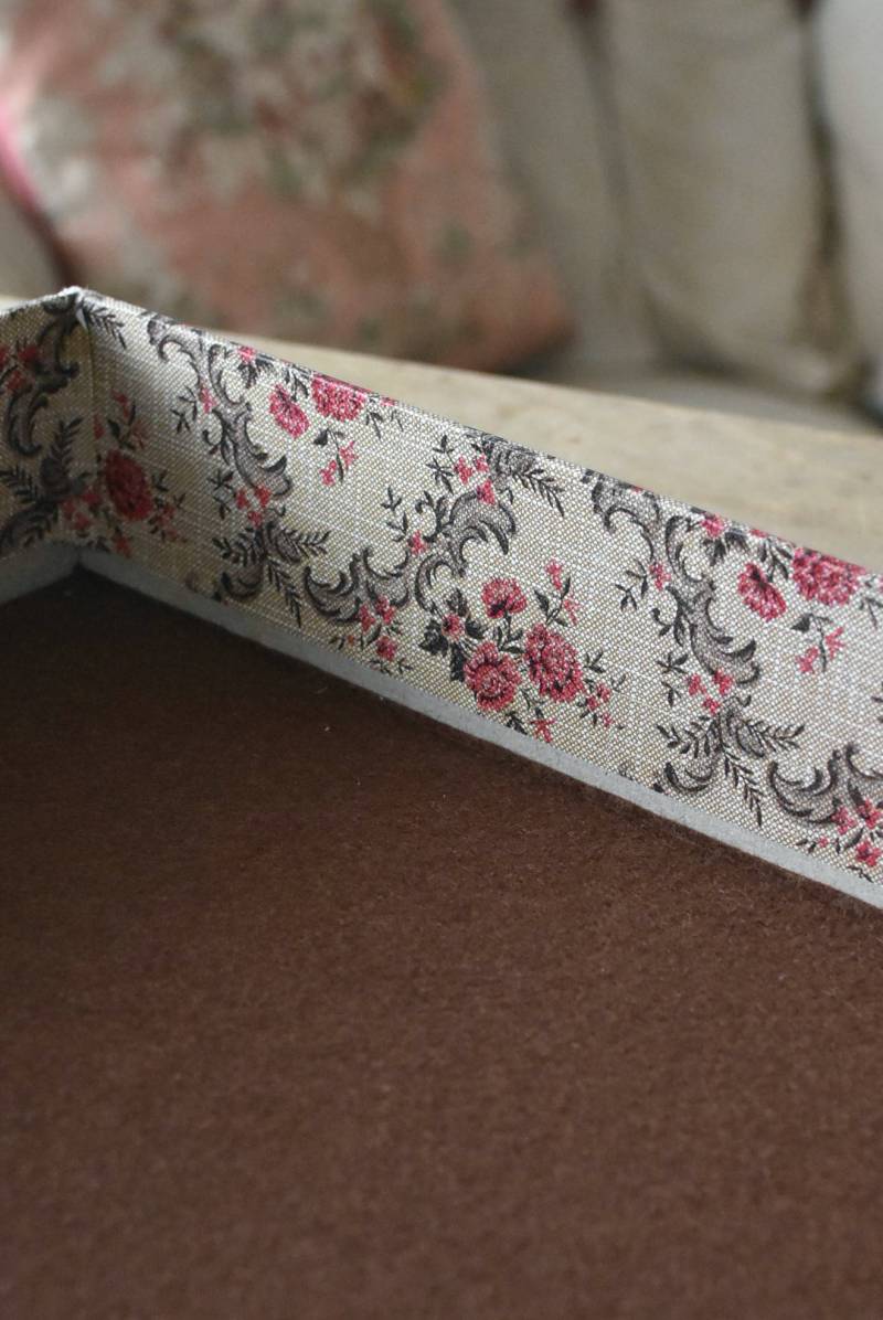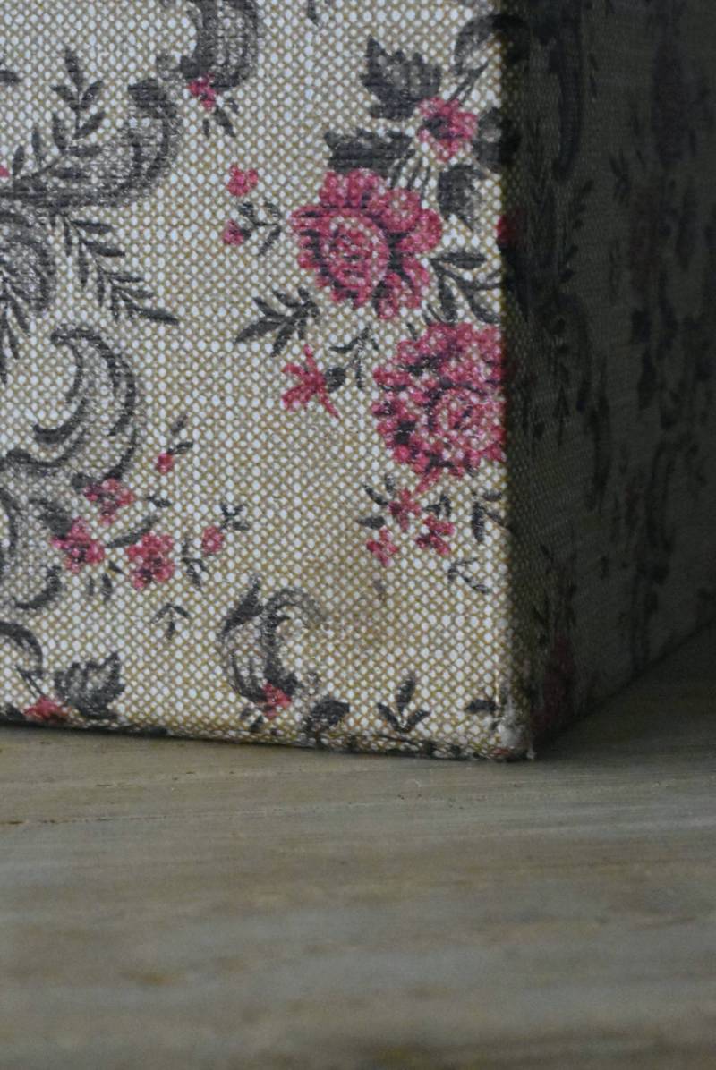 フランスのカルトナージュ2段チェスト。 カルトナージュ(Cartonnage)とは、厚紙で作られたボックスに布や紙を貼って美しく仕上げられるフランスの伝統工芸の一つ。柔らかなベージュにベリーカラーのお花がパターン模様として印字されたペーパーがボディ・引き出し側面・底面にまで丁寧にあしらわれた、可憐でちょっぴりクラシカルな印象のデザインです。深さの異なる2つの引き出しにはゴールドカラーの小さな取手が付けられており、ちょっとしたアクセントに。 引き出し内側にはブラウンカラーのフェルトが貼られており、アクセサリーなどを入れるジュエリーボックスとしても活躍してくれるアイテムです。 W 約40.5cm D 約30.5cm H 約13cm 引き出し内寸 W約37cm×D約28cm×深さ(上)約3.2cm/(下)約5.2cm