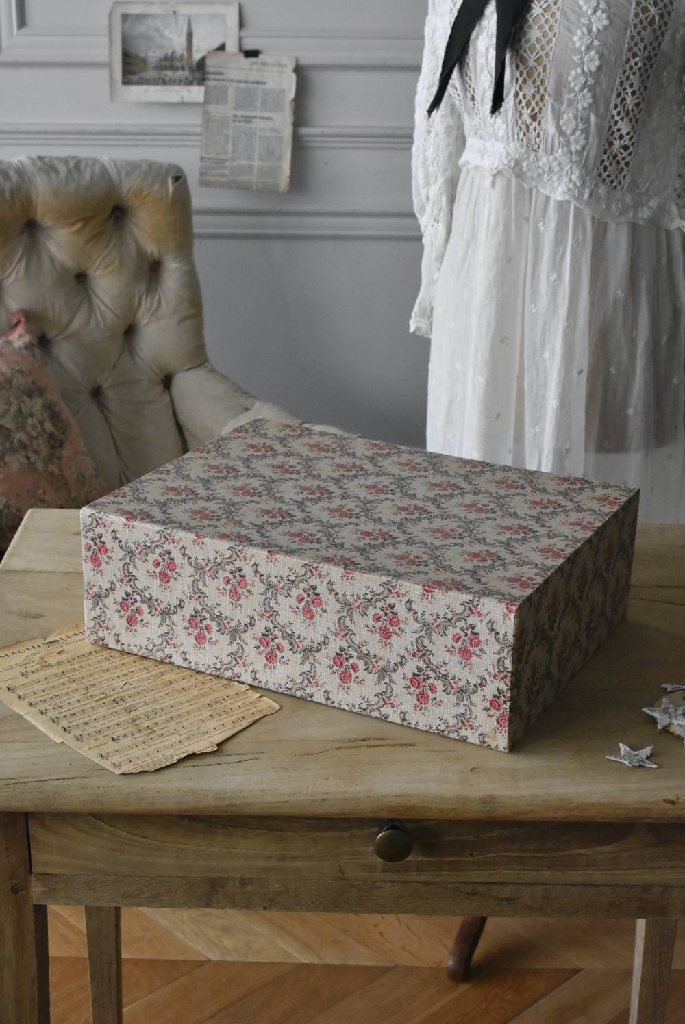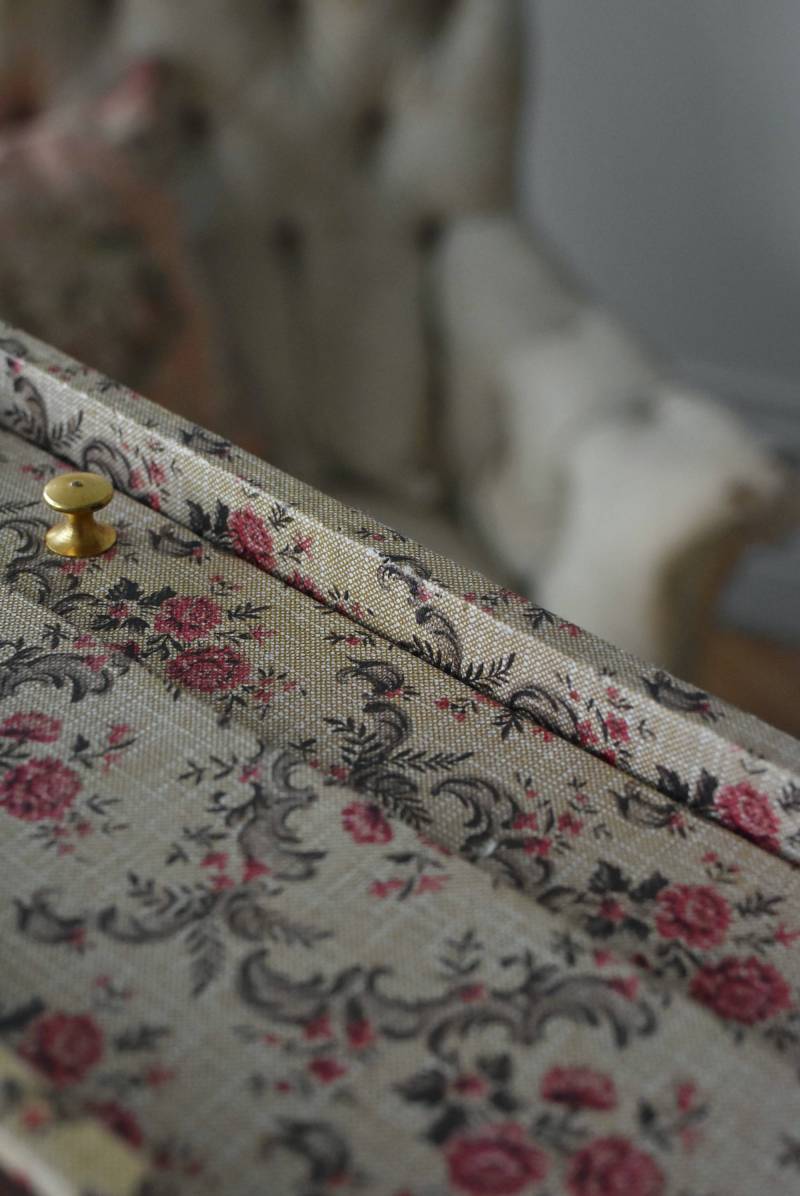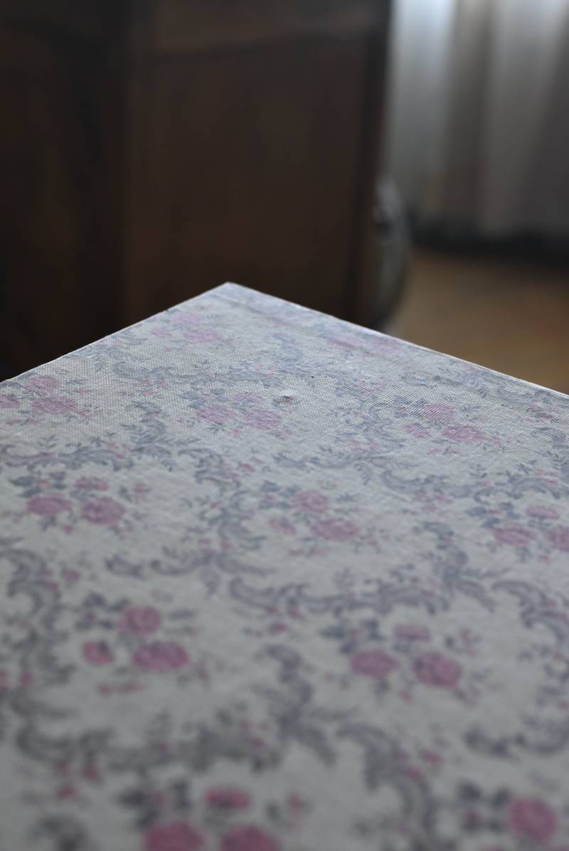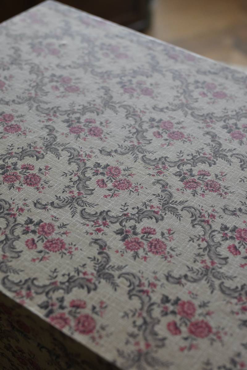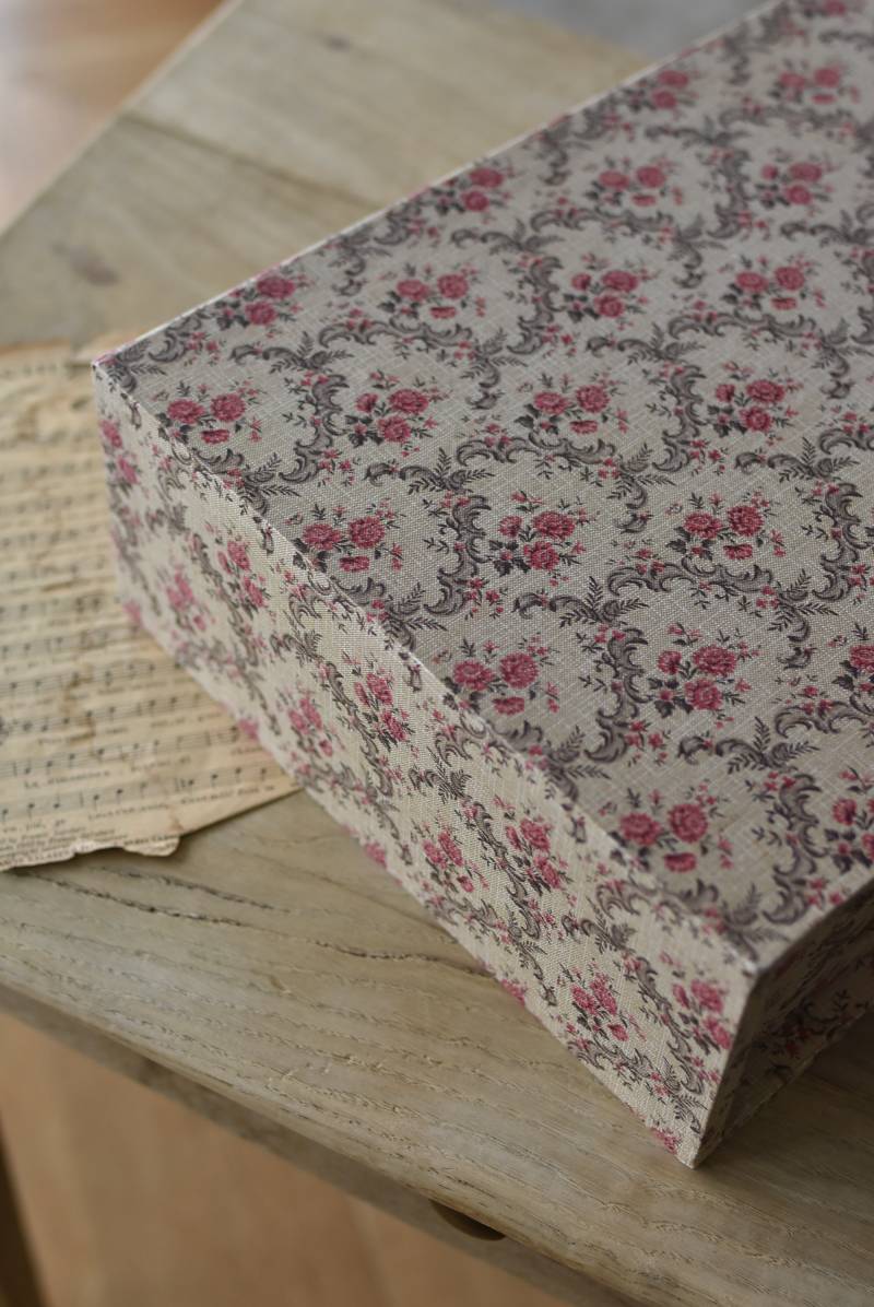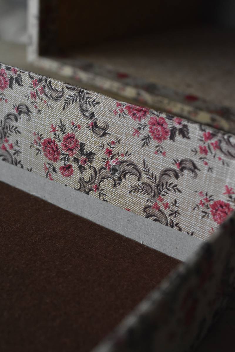 フランスのカルトナージュ2段チェスト。 カルトナージュ(Cartonnage)とは、厚紙で作られたボックスに布や紙を貼って美しく仕上げられるフランスの伝統工芸の一つ。柔らかなベージュにベリーカラーのお花がパターン模様として印字されたペーパーがボディ・引き出し側面・底面にまで丁寧にあしらわれた、可憐でちょっぴりクラシカルな印象のデザインです。深さの異なる2つの引き出しにはゴールドカラーの小さな取手が付けられており、ちょっとしたアクセントに。 引き出し内側にはブラウンカラーのフェルトが貼られており、アクセサリーなどを入れるジュエリーボックスとしても活躍してくれるアイテムです。 W 約40.5cm D 約30.5cm H 約13cm 引き出し内寸 W約37cm×D約28cm×深さ(上)約3.2cm/(下)約5.2cm
