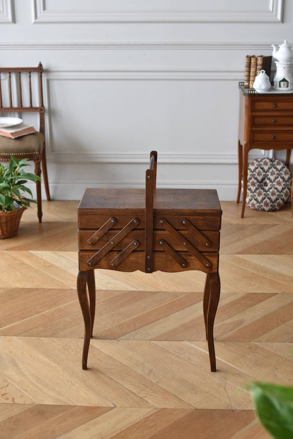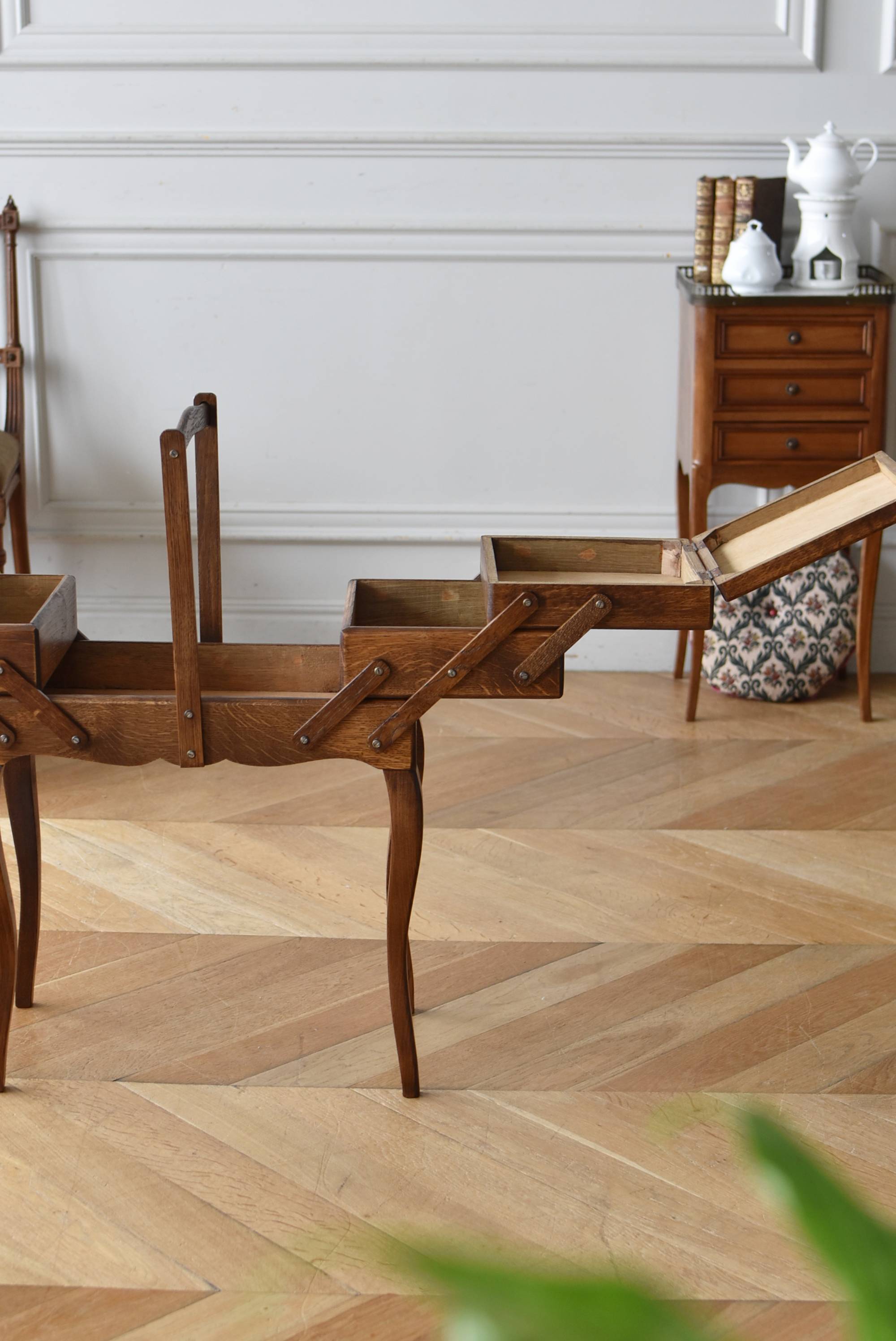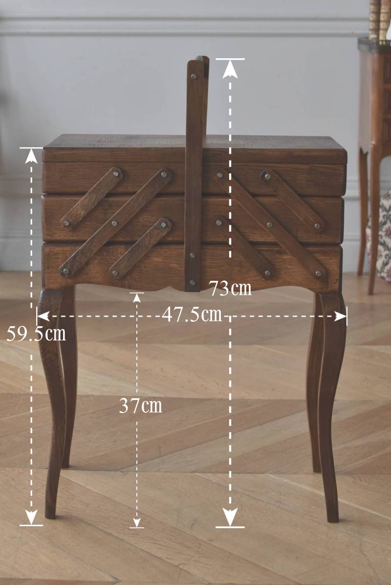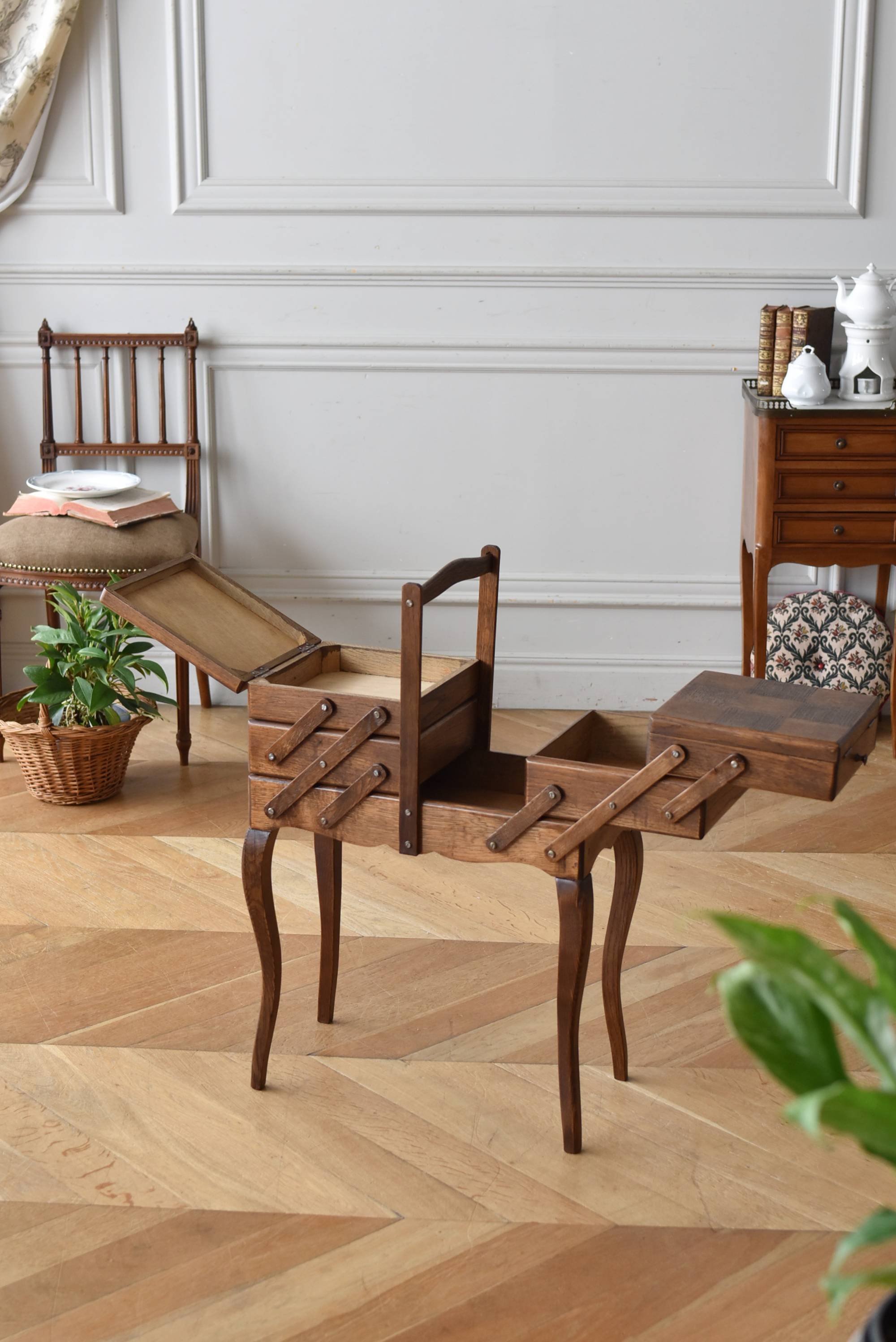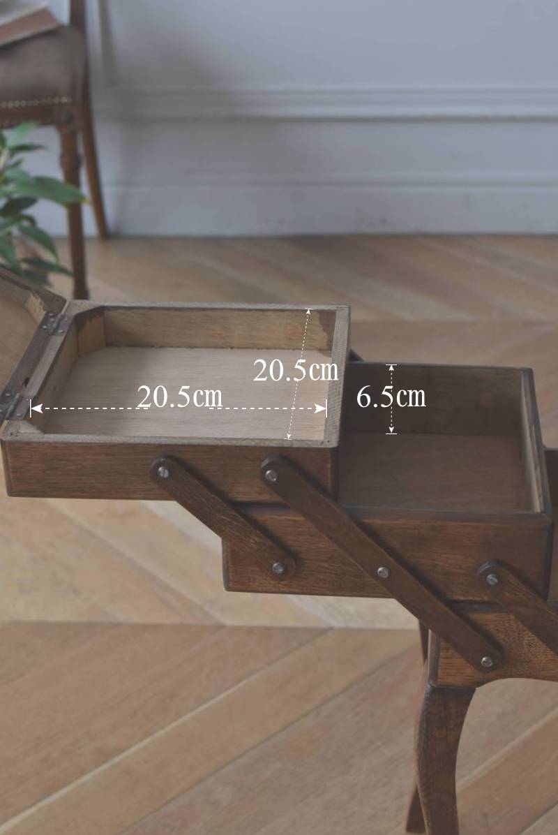 フランスの猫脚ソーイングボックス。 3段の収納スペースが左右それぞれに階段状に広がり、パーツや細々とした小物などを整理しながらすっきりと収める事が出来る機能的な作りです。天板部分には木目の流れが縦横と交互にあしらわれた四角い突板模様があしらわれ、自然のぬくもりを感じさせてくれる豊かさが伝ってきます。 一度バラして、パーツごとに剥離作業を行い、新たに塗装をし直しております。緩やかな曲線の長い脚によってエレガントさをもたらしてくれ、深みのある落ち着いた色合いがお部屋にそっと馴染んでくれそうです。 W 約47.5cm D 約25cm H 約73cm 広げた時のW 約150cm 収納部内寸のH(上から) 約3.5/ 6.5/ 5.5cm