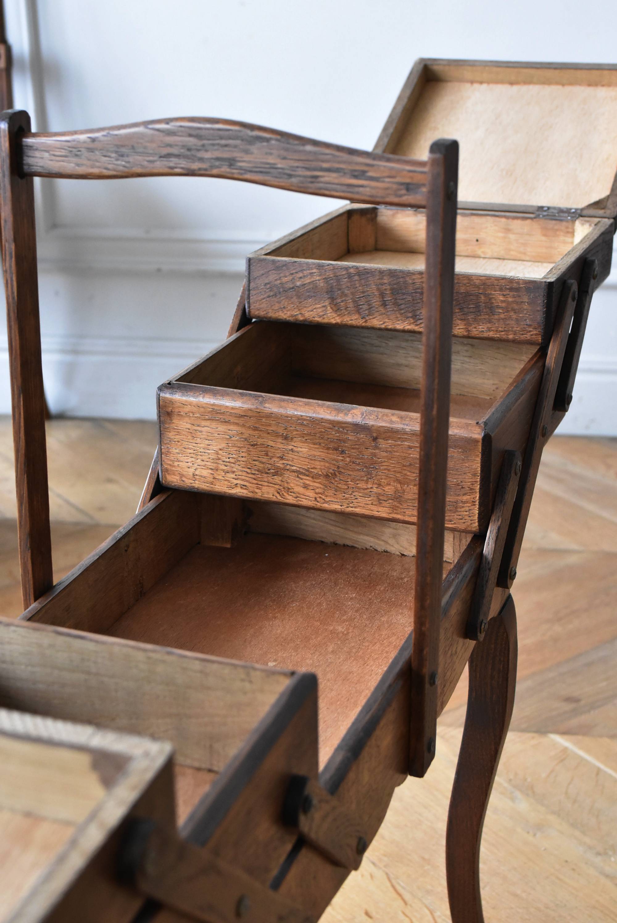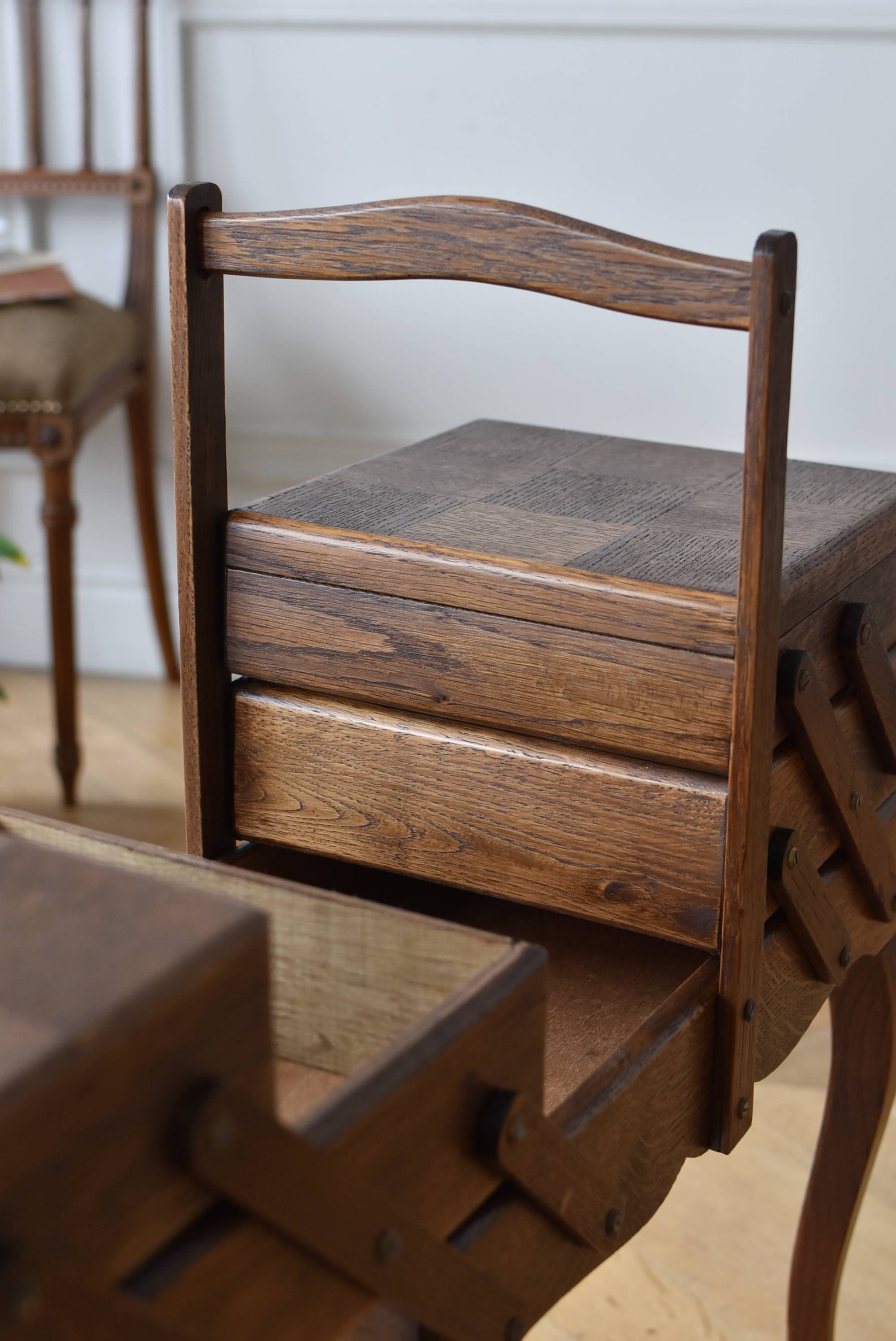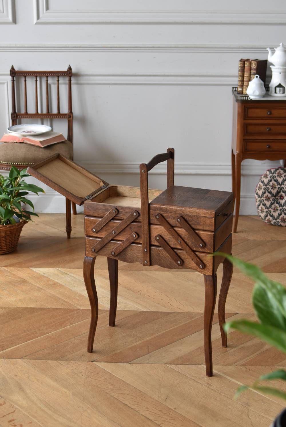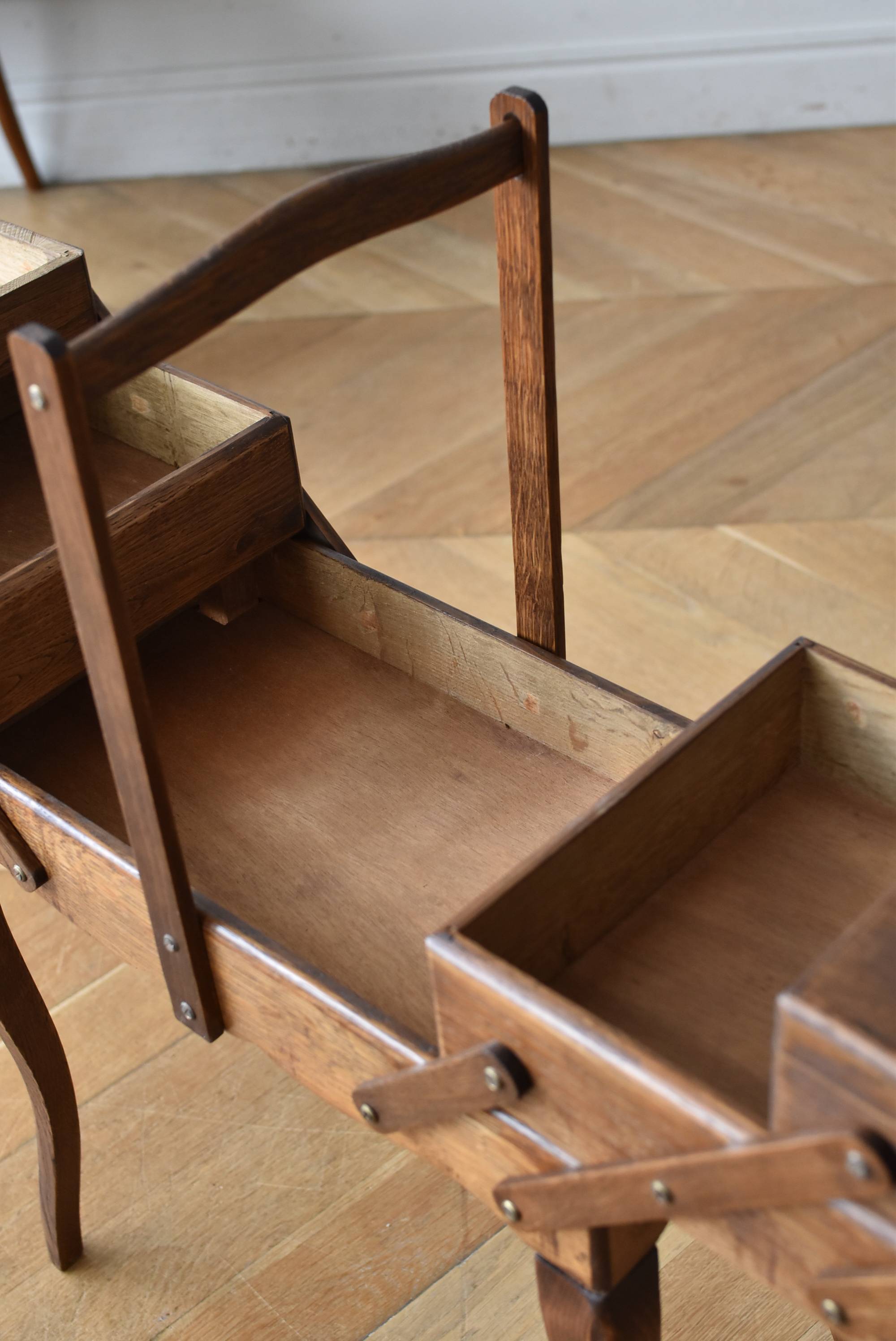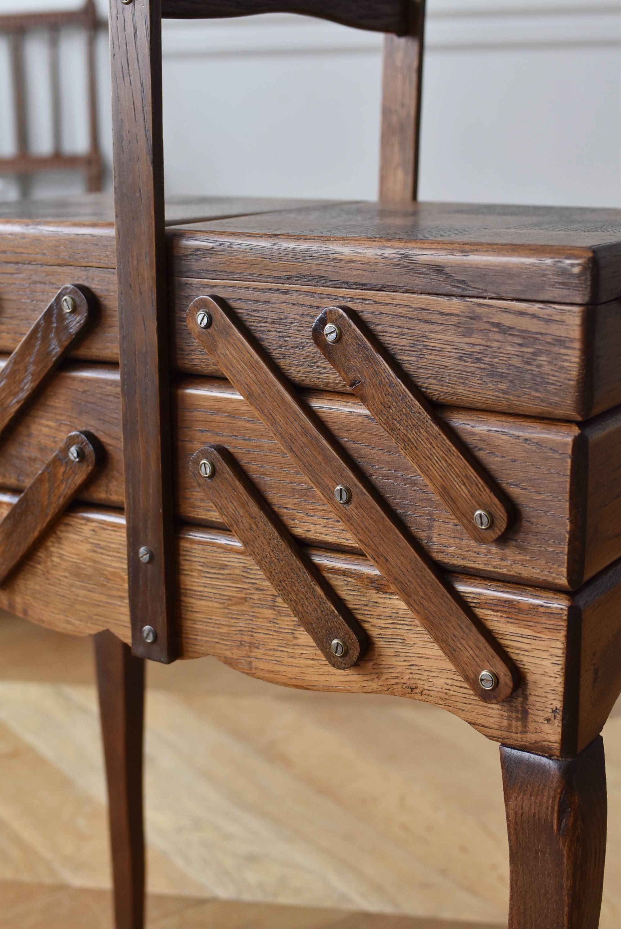 フランスの猫脚ソーイングボックス。 3段の収納スペースが左右それぞれに階段状に広がり、パーツや細々とした小物などを整理しながらすっきりと収める事が出来る機能的な作りです。天板部分には木目の流れが縦横と交互にあしらわれた四角い突板模様があしらわれ、自然のぬくもりを感じさせてくれる豊かさが伝ってきます。 一度バラして、パーツごとに剥離作業を行い、新たに塗装をし直しております。緩やかな曲線の長い脚によってエレガントさをもたらしてくれ、深みのある落ち着いた色合いがお部屋にそっと馴染んでくれそうです。 W 約47.5cm D 約25cm H 約73cm 広げた時のW 約150cm 収納部内寸のH(上から) 約3.5/ 6.5/ 5.5cm