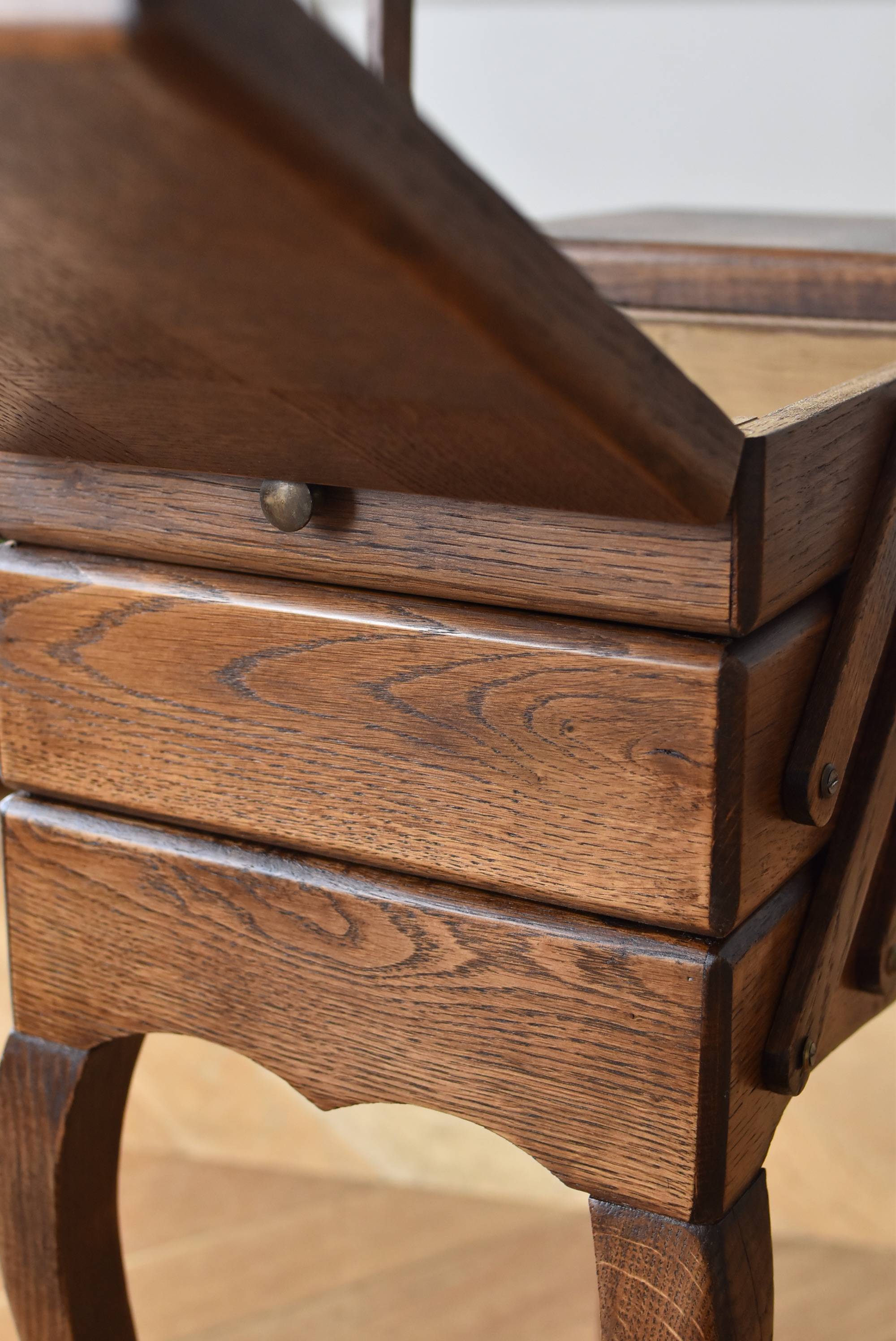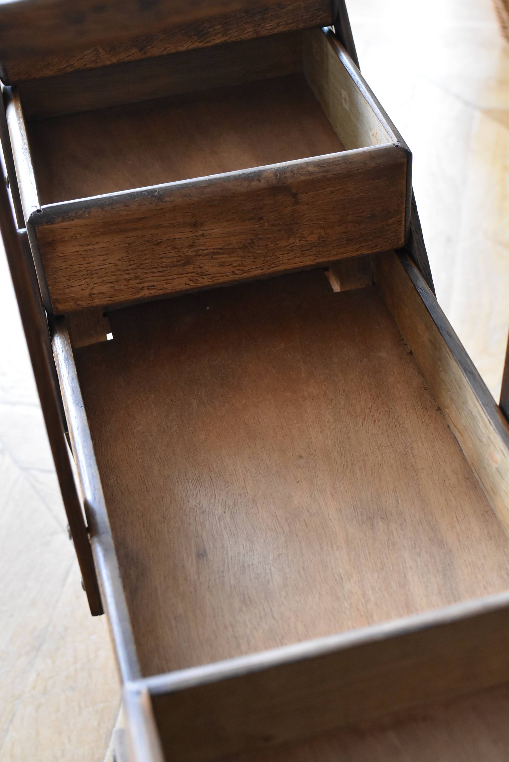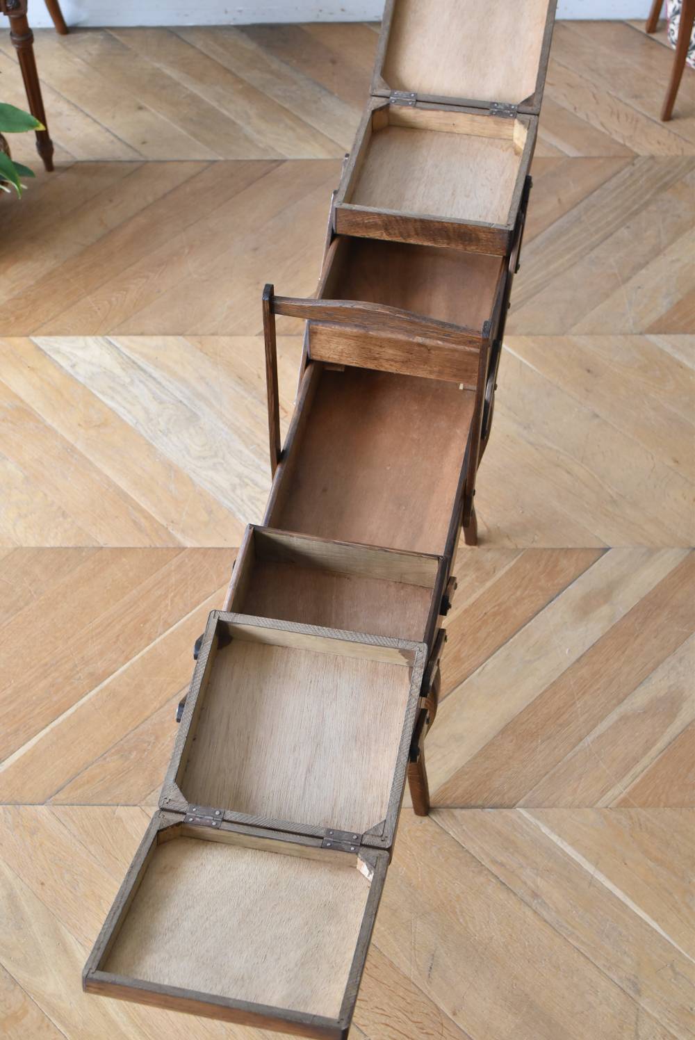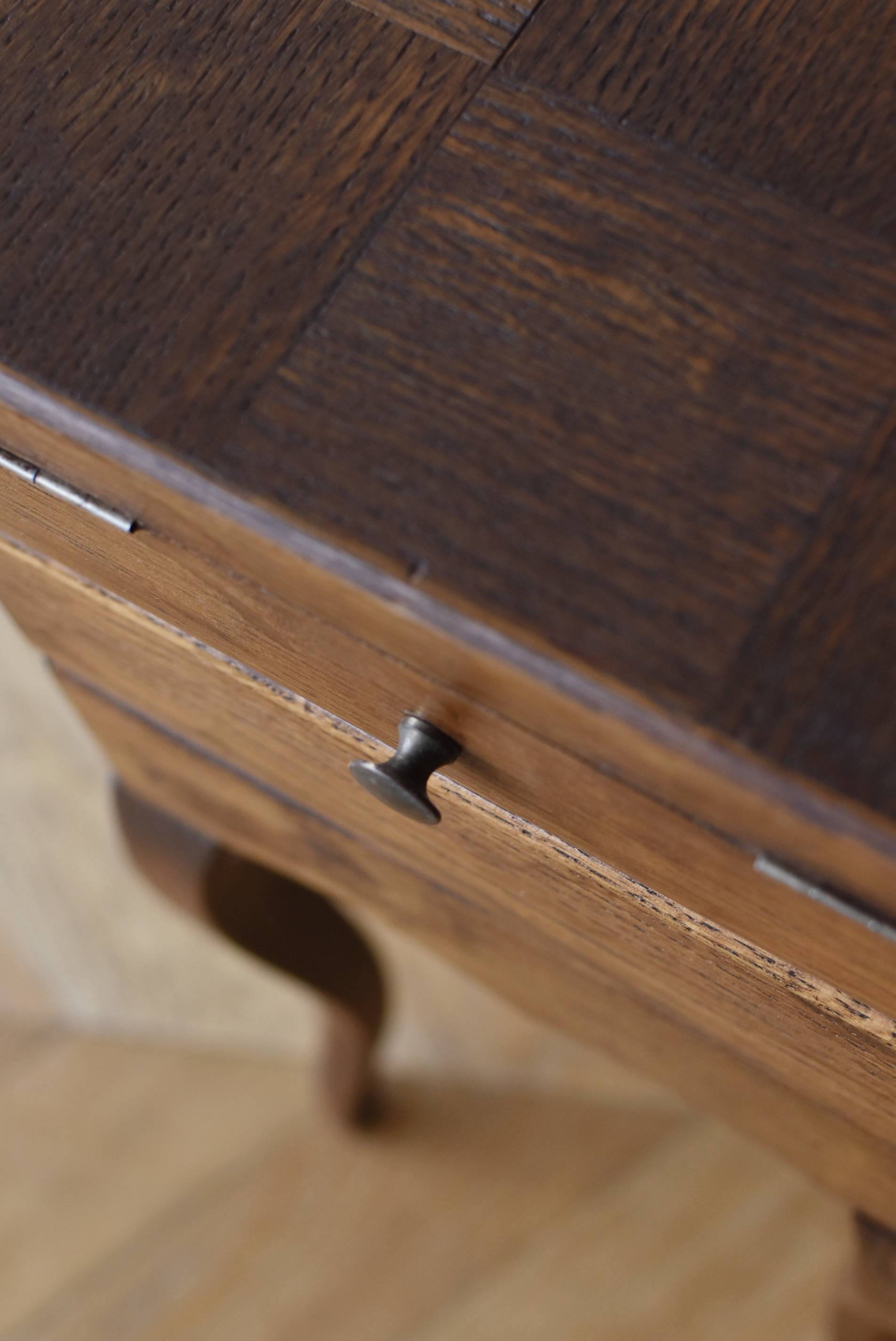 フランスの猫脚ソーイングボックス。 3段の収納スペースが左右それぞれに階段状に広がり、パーツや細々とした小物などを整理しながらすっきりと収める事が出来る機能的な作りです。天板部分には木目の流れが縦横と交互にあしらわれた四角い突板模様があしらわれ、自然のぬくもりを感じさせてくれる豊かさが伝ってきます。 一度バラして、パーツごとに剥離作業を行い、新たに塗装をし直しております。緩やかな曲線の長い脚によってエレガントさをもたらしてくれ、深みのある落ち着いた色合いがお部屋にそっと馴染んでくれそうです。 W 約47.5cm D 約25cm H 約73cm 広げた時のW 約150cm 収納部内寸のH(上から) 約3.5/ 6.5/ 5.5cm