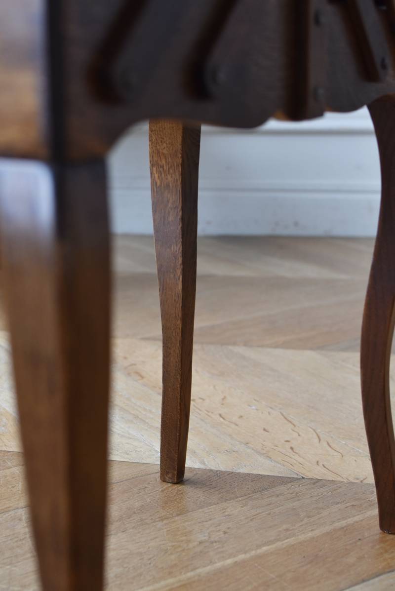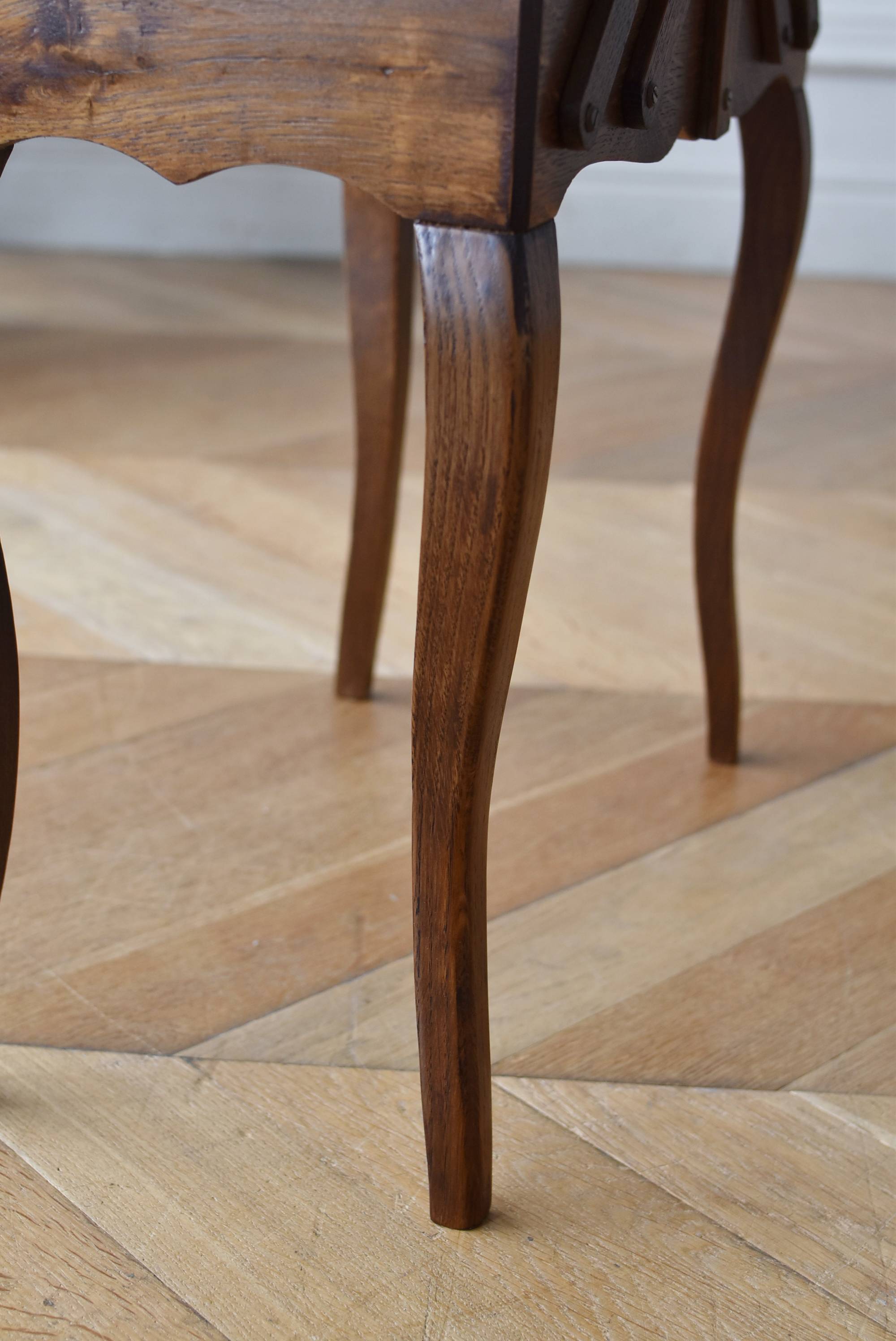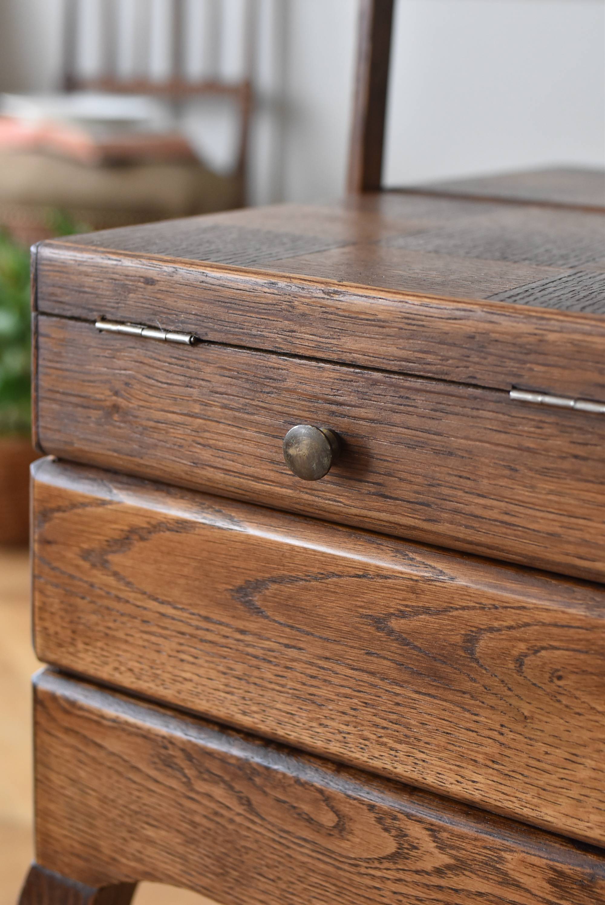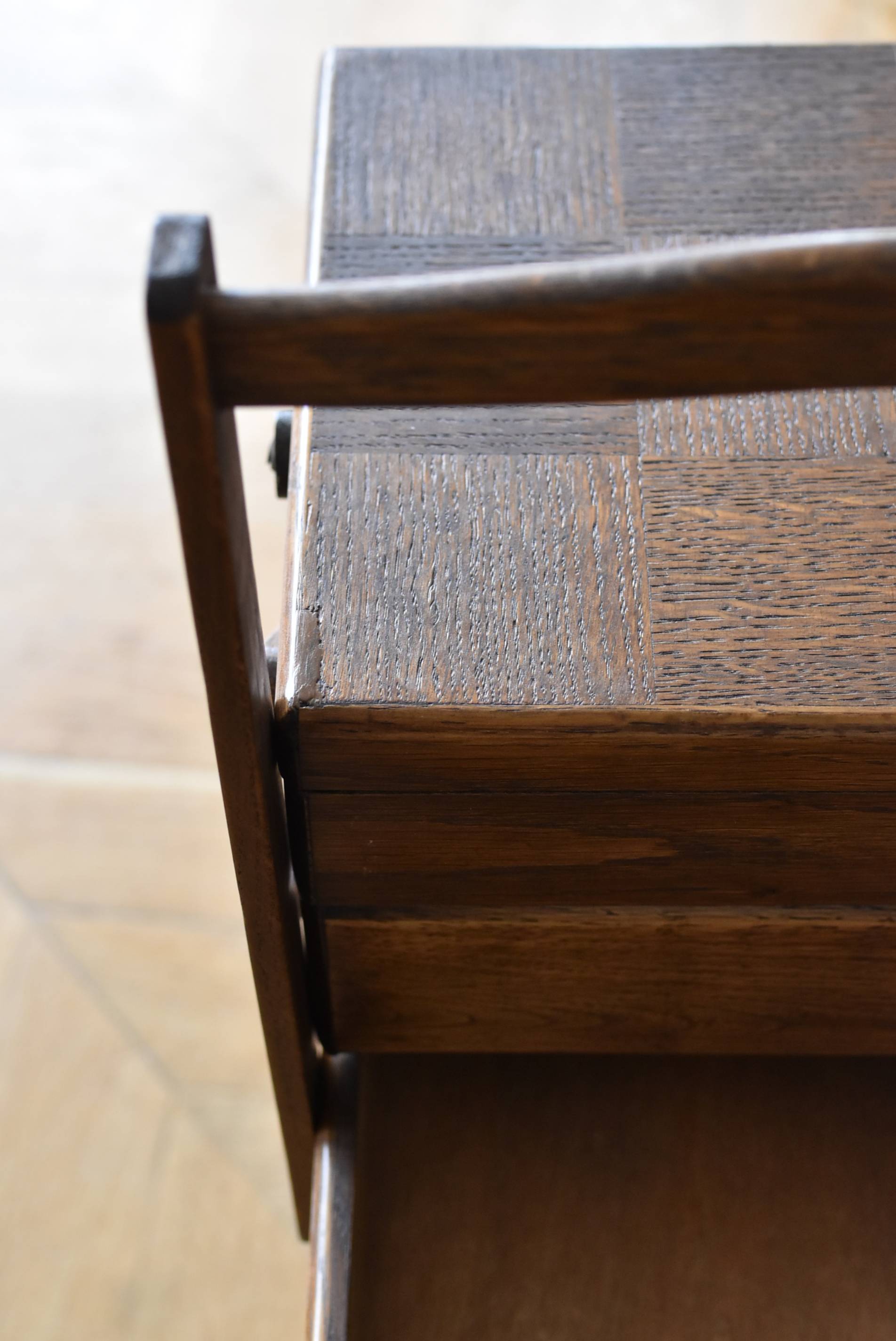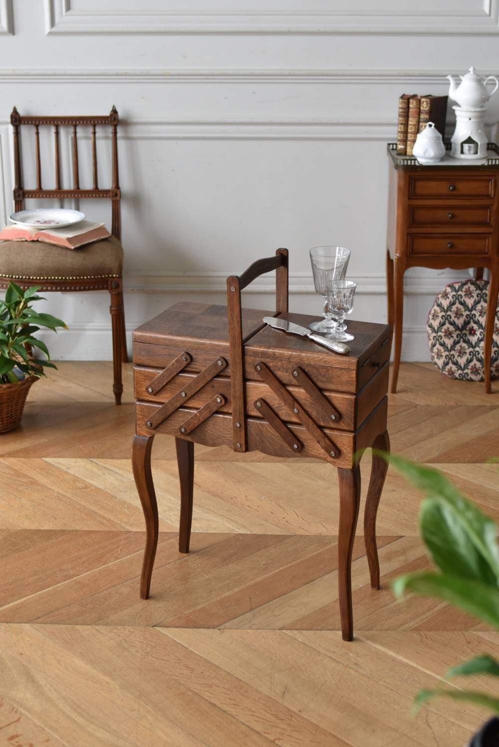 フランスの猫脚ソーイングボックス。 3段の収納スペースが左右それぞれに階段状に広がり、パーツや細々とした小物などを整理しながらすっきりと収める事が出来る機能的な作りです。天板部分には木目の流れが縦横と交互にあしらわれた四角い突板模様があしらわれ、自然のぬくもりを感じさせてくれる豊かさが伝ってきます。 一度バラして、パーツごとに剥離作業を行い、新たに塗装をし直しております。緩やかな曲線の長い脚によってエレガントさをもたらしてくれ、深みのある落ち着いた色合いがお部屋にそっと馴染んでくれそうです。 W 約47.5cm D 約25cm H 約73cm 広げた時のW 約150cm 収納部内寸のH(上から) 約3.5/ 6.5/ 5.5cm