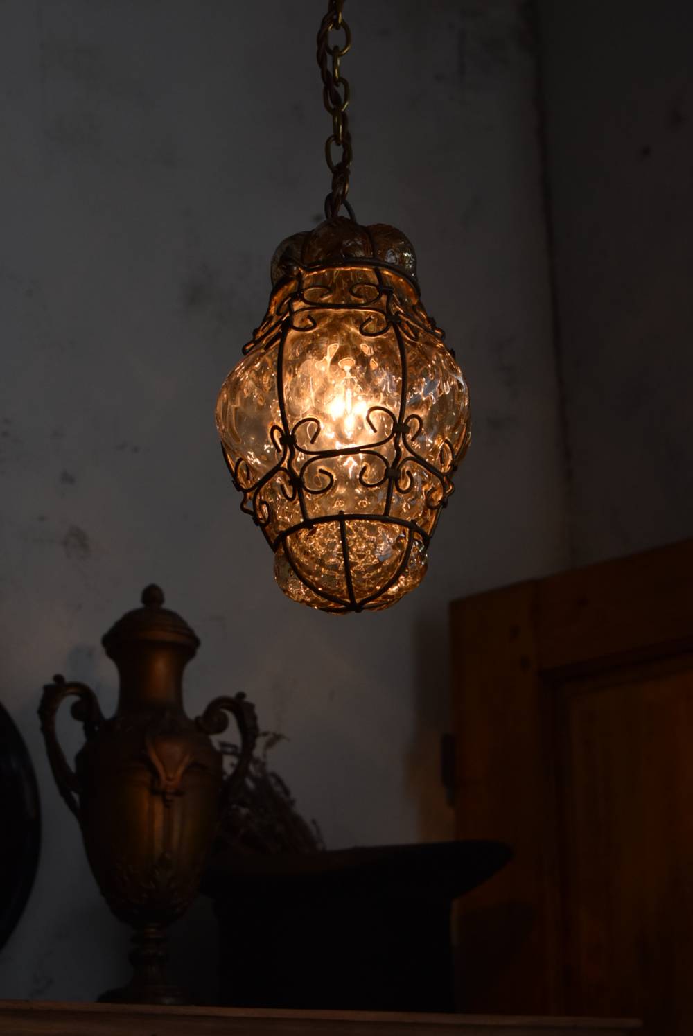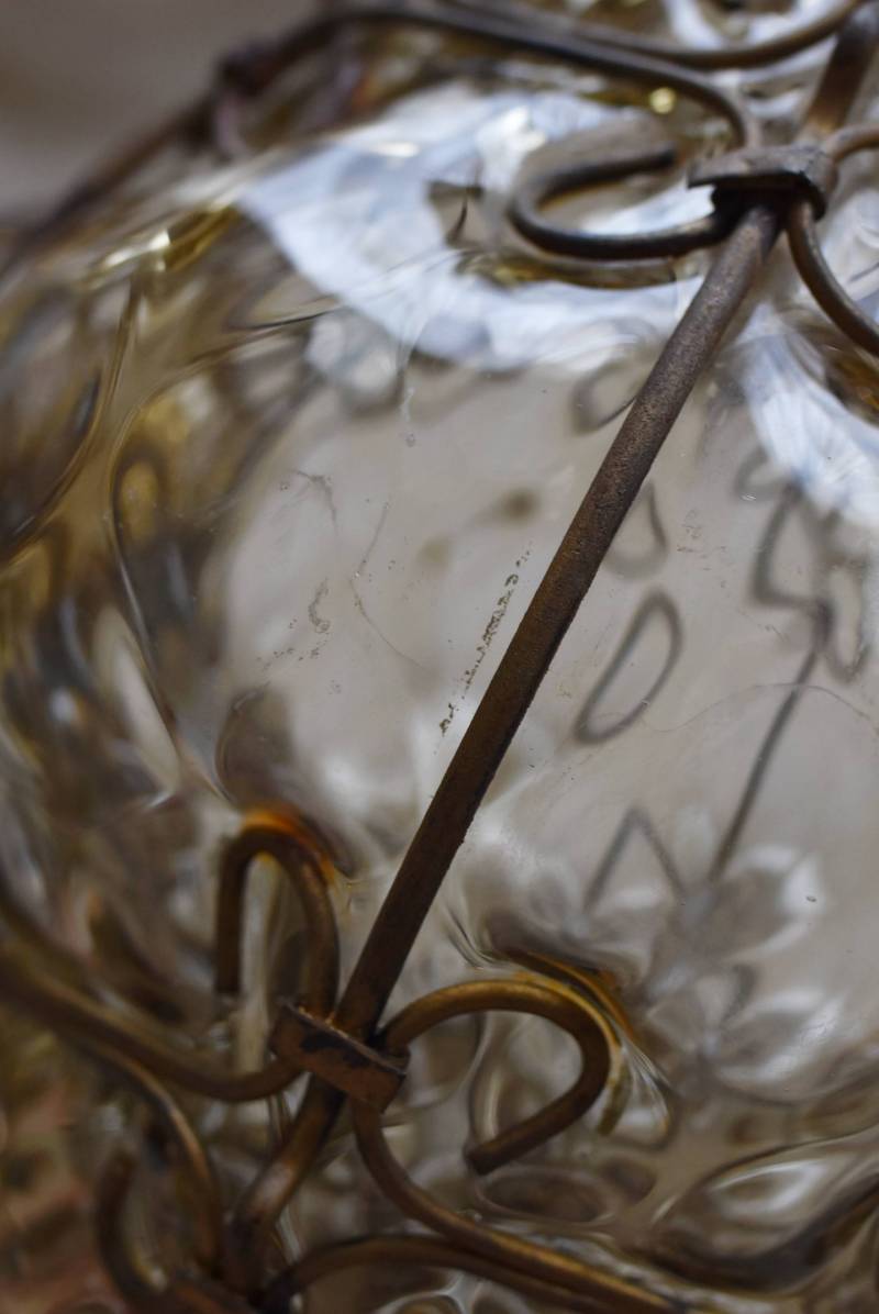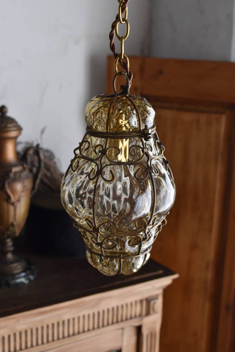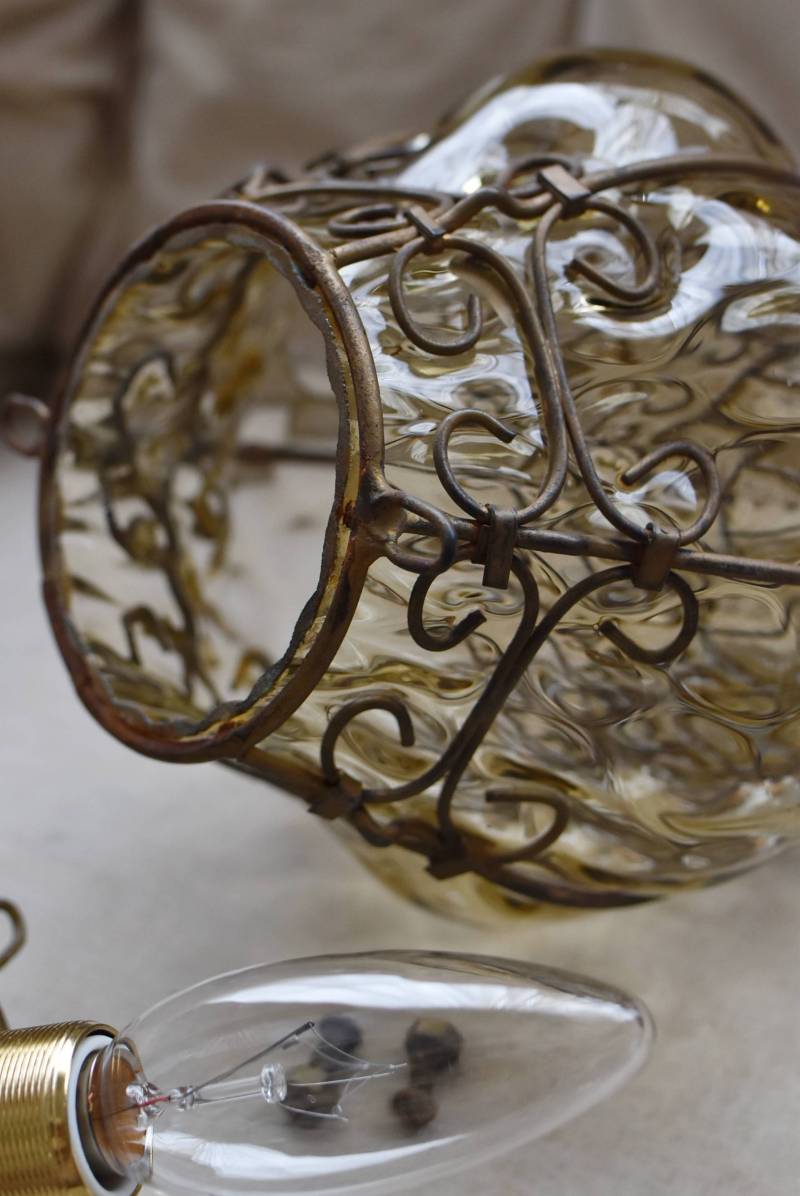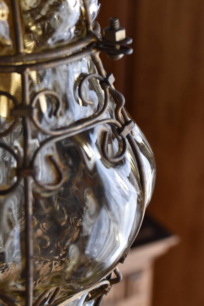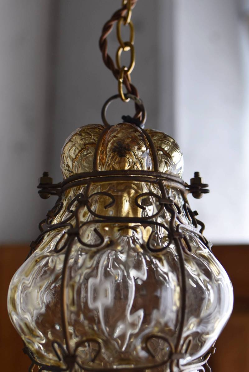 比較的小ぶりなサイズとなったイタリアのムラーノガラスランプ。 しっかりとしたアイアンからガラスがぷっくりと膨らんだ個性的な姿や、手仕事によって作られた波打つような凹凸のあるデザインは他にはない唯一無二な表情が楽しめます。アンバーカラーに色づいた落ち着いた印象ながらも、適度に透明感のある独自の雰囲気が存在感を放ってくれそうです。 コード・ソケット・シーリングは新しいものに交換済み。こちらの商品は条件を満たしているので引掛シーリングをご使用いただけます。元は直付けで使われていた物で天井カバーが浅い為、天井との間に隙間ができます。天井との隙間が気になられる方は直付け工事をおすすめします。 電球は付属しません。 直径 約14cm H 約26cm コード含む全長 約50cm 重量 約1kg 電球口径 E17 *60W以下をご使用下さい。