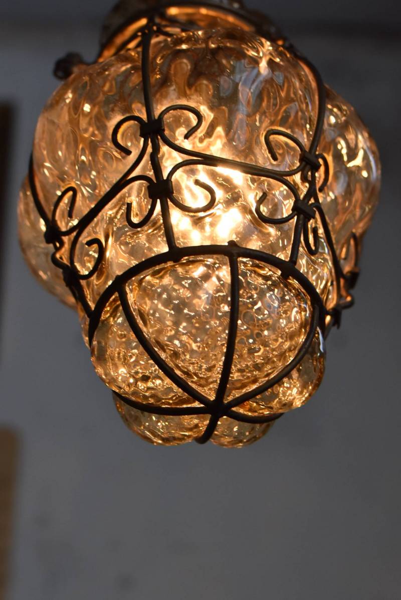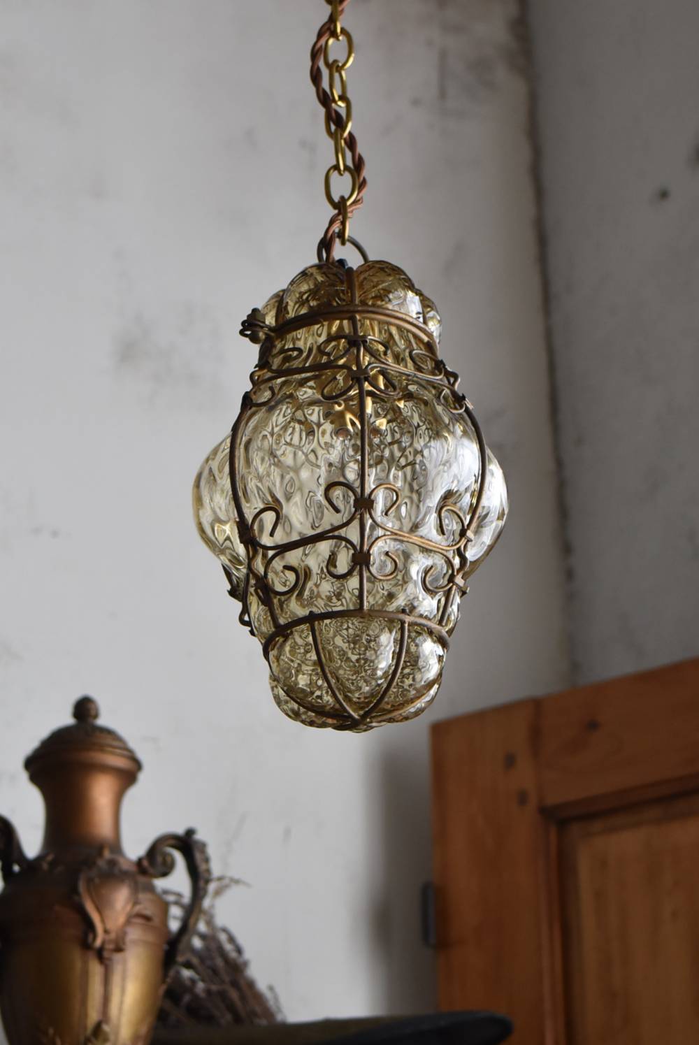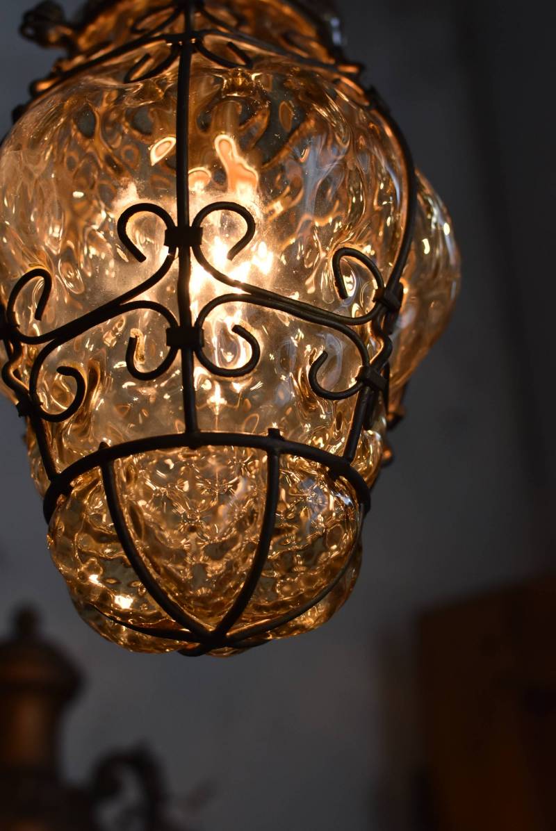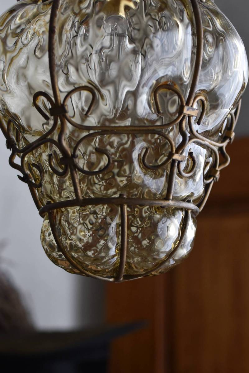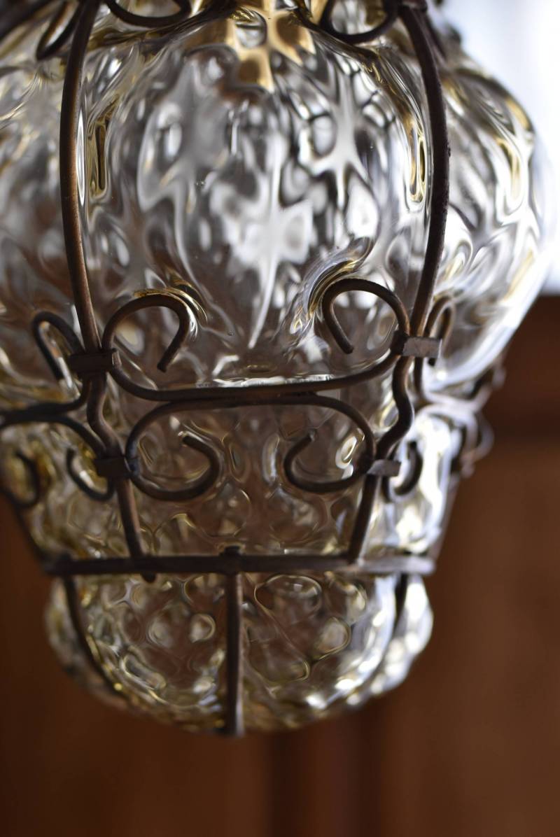 比較的小ぶりなサイズとなったイタリアのムラーノガラスランプ。 しっかりとしたアイアンからガラスがぷっくりと膨らんだ個性的な姿や、手仕事によって作られた波打つような凹凸のあるデザインは他にはない唯一無二な表情が楽しめます。アンバーカラーに色づいた落ち着いた印象ながらも、適度に透明感のある独自の雰囲気が存在感を放ってくれそうです。 コード・ソケット・シーリングは新しいものに交換済み。こちらの商品は条件を満たしているので引掛シーリングをご使用いただけます。元は直付けで使われていた物で天井カバーが浅い為、天井との間に隙間ができます。天井との隙間が気になられる方は直付け工事をおすすめします。 電球は付属しません。 直径 約14cm H 約26cm コード含む全長 約50cm 重量 約1kg 電球口径 E17 *60W以下をご使用下さい。