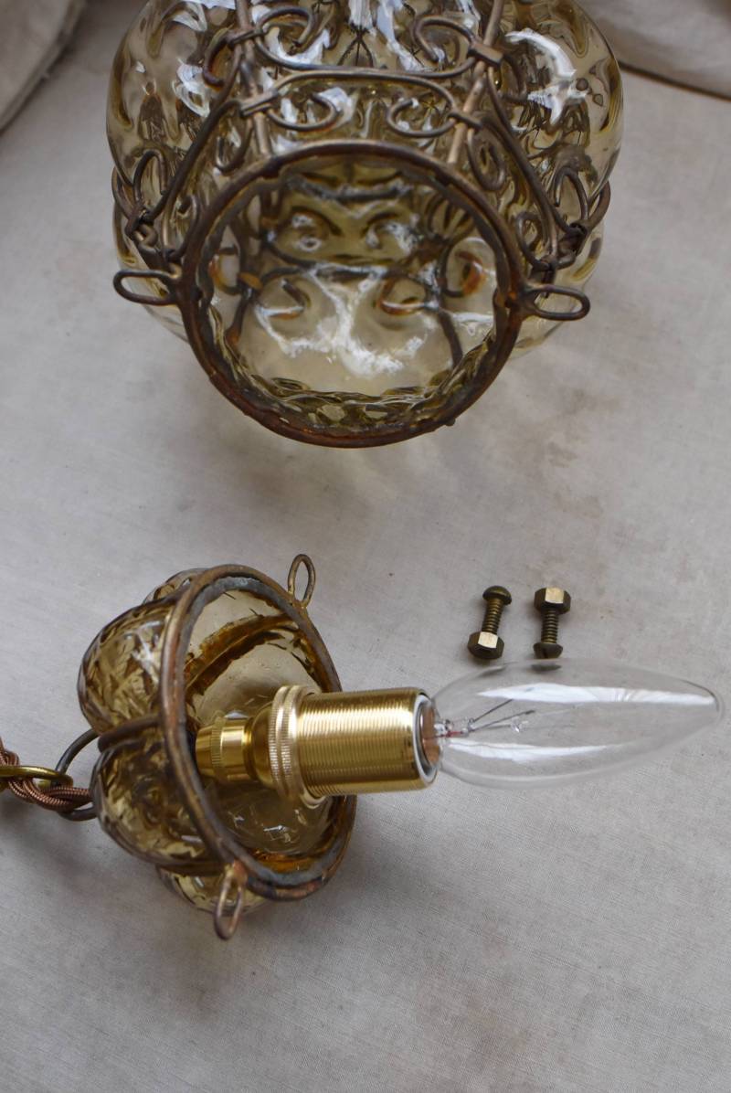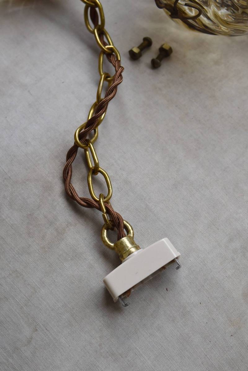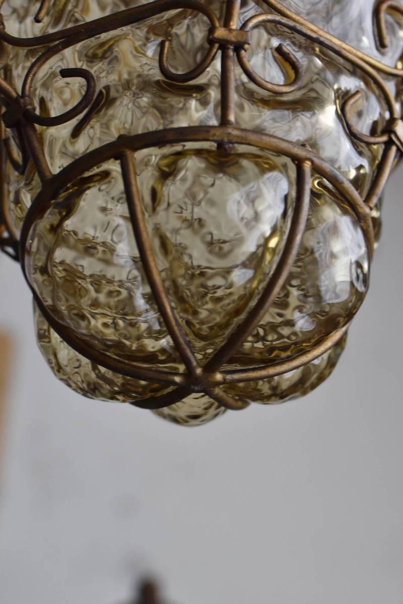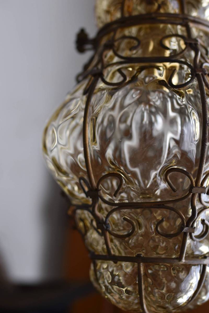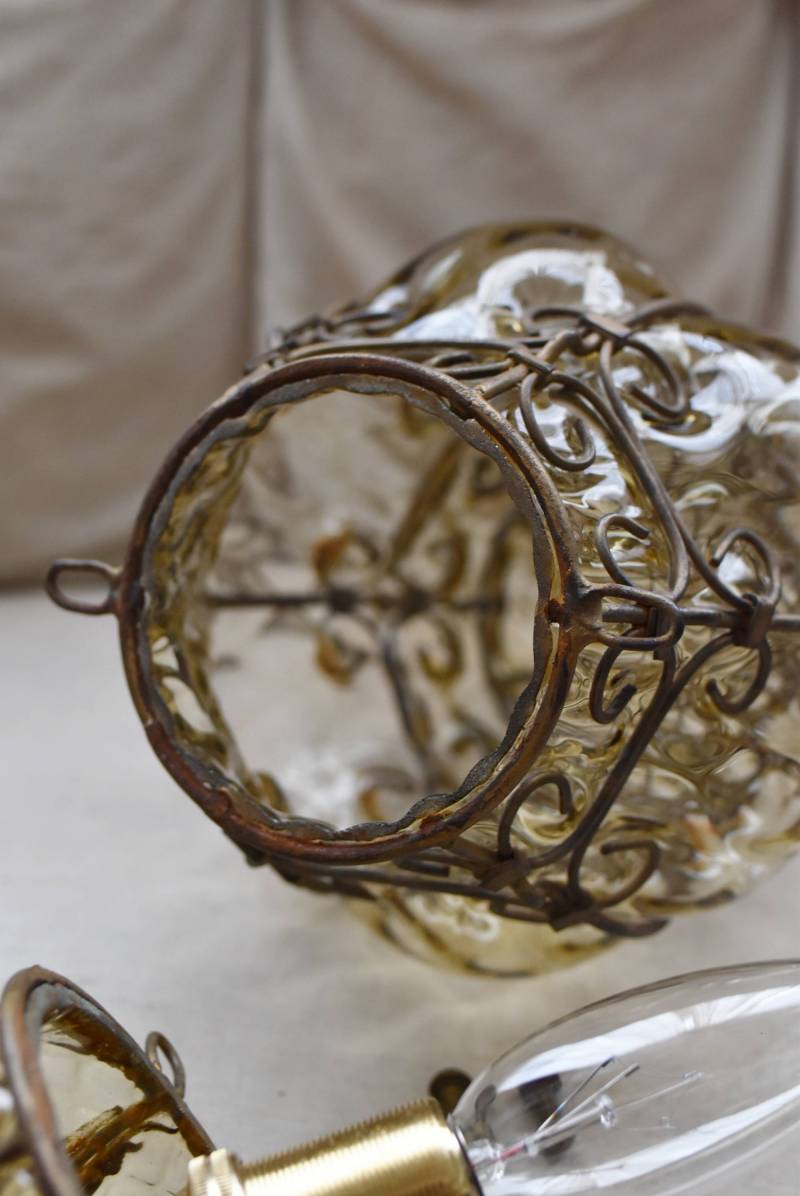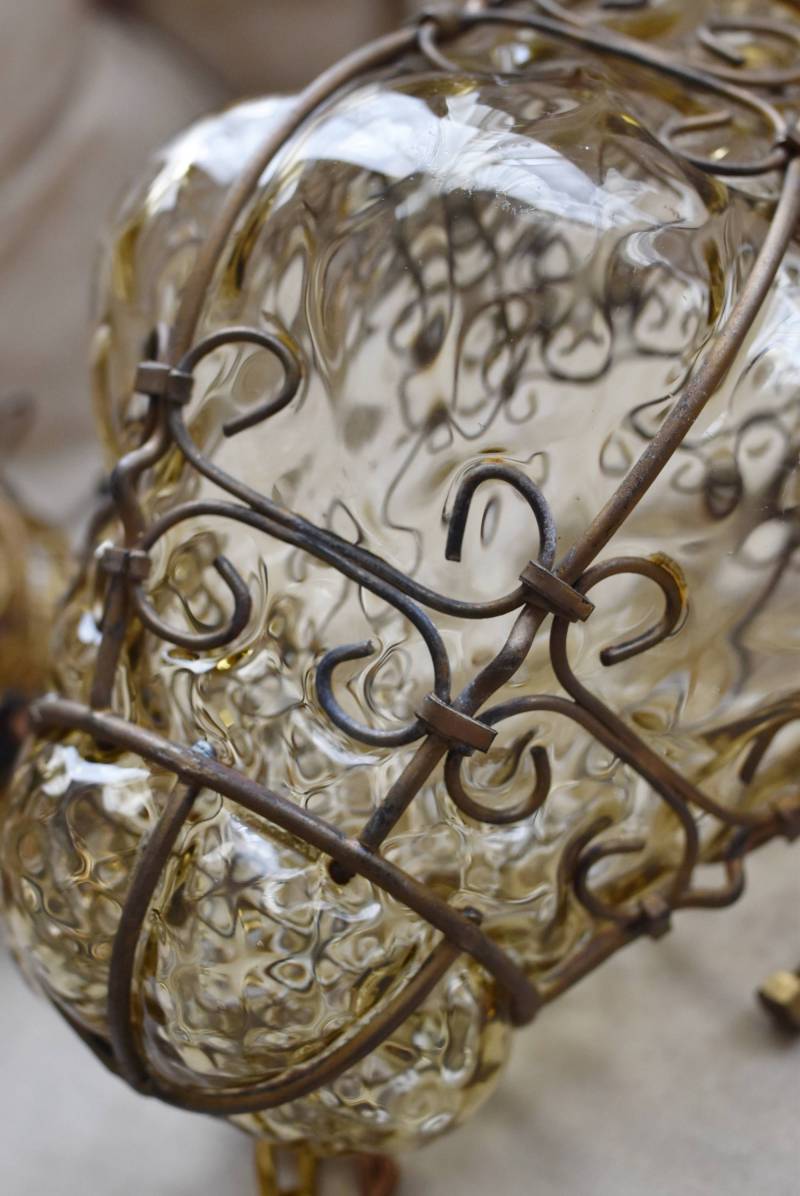 比較的小ぶりなサイズとなったイタリアのムラーノガラスランプ。 しっかりとしたアイアンからガラスがぷっくりと膨らんだ個性的な姿や、手仕事によって作られた波打つような凹凸のあるデザインは他にはない唯一無二な表情が楽しめます。アンバーカラーに色づいた落ち着いた印象ながらも、適度に透明感のある独自の雰囲気が存在感を放ってくれそうです。 コード・ソケット・シーリングは新しいものに交換済み。こちらの商品は条件を満たしているので引掛シーリングをご使用いただけます。元は直付けで使われていた物で天井カバーが浅い為、天井との間に隙間ができます。天井との隙間が気になられる方は直付け工事をおすすめします。 電球は付属しません。 直径 約14cm H 約26cm コード含む全長 約50cm 重量 約1kg 電球口径 E17 *60W以下をご使用下さい。