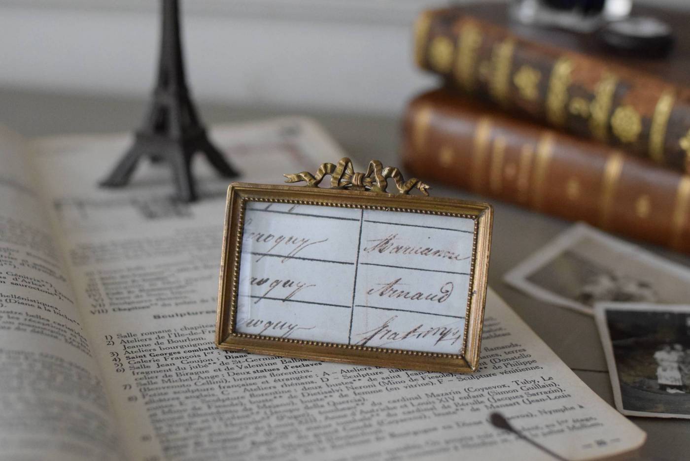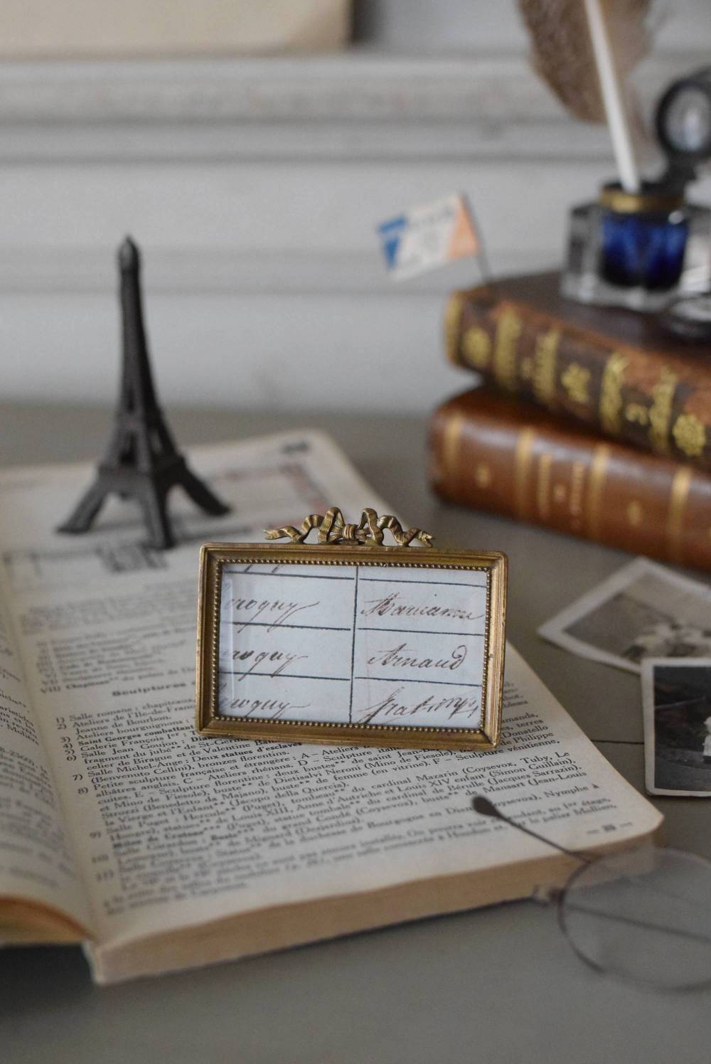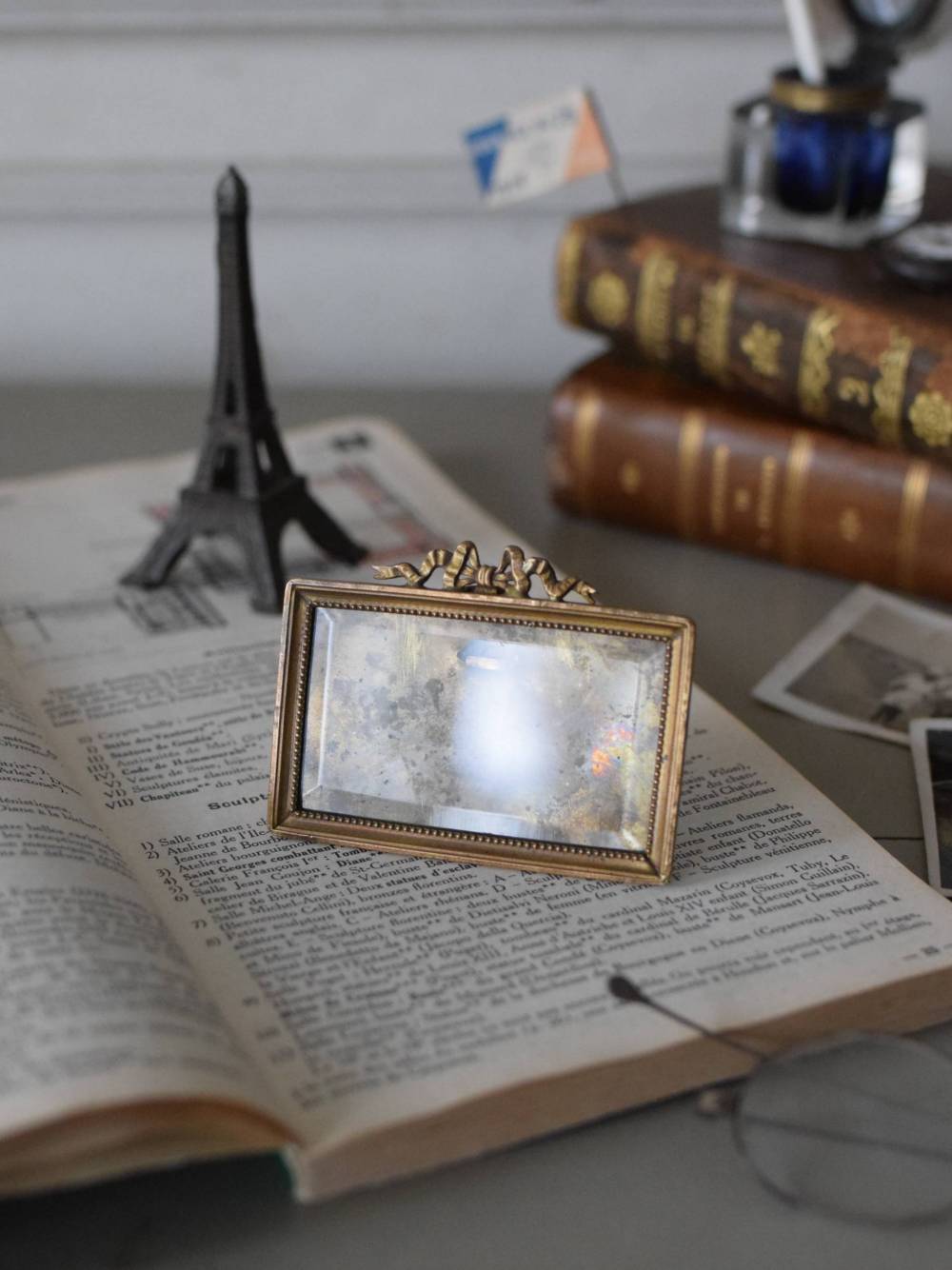 こちらはフランスのもので、厳かな真鍮の額に繊細なリボンをあしらった美しい姿。とても小さなサイズ感ながら作りはとても細やかで、さりげなくカットの入ったガラスは、反射によって美しく幻想的な表情を見せてくれます。横長のカタチも珍しく、卓上のアクセントになりますね。