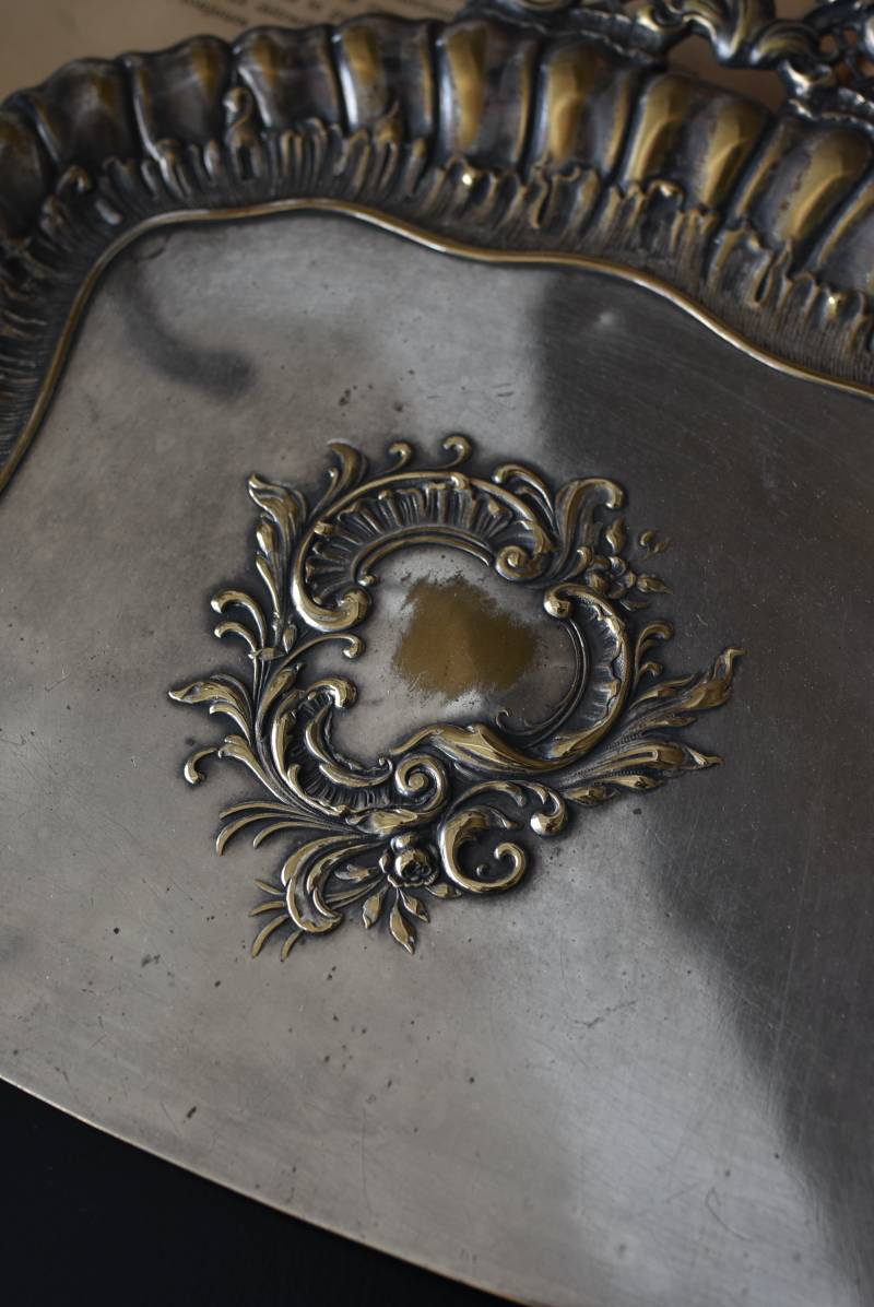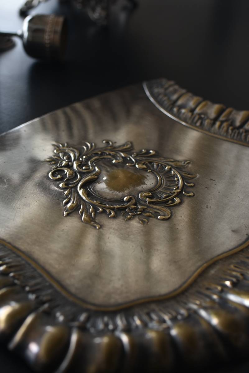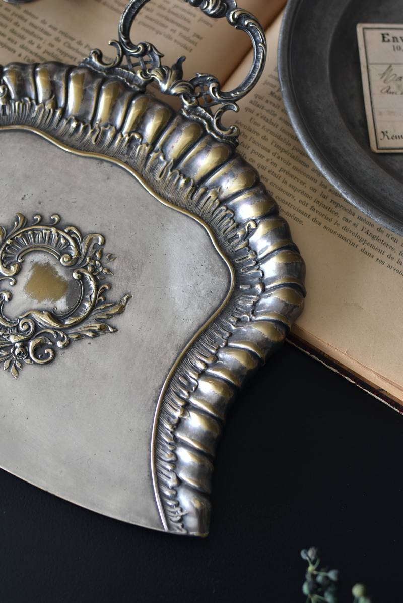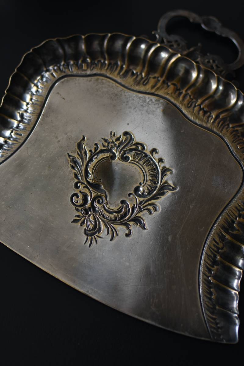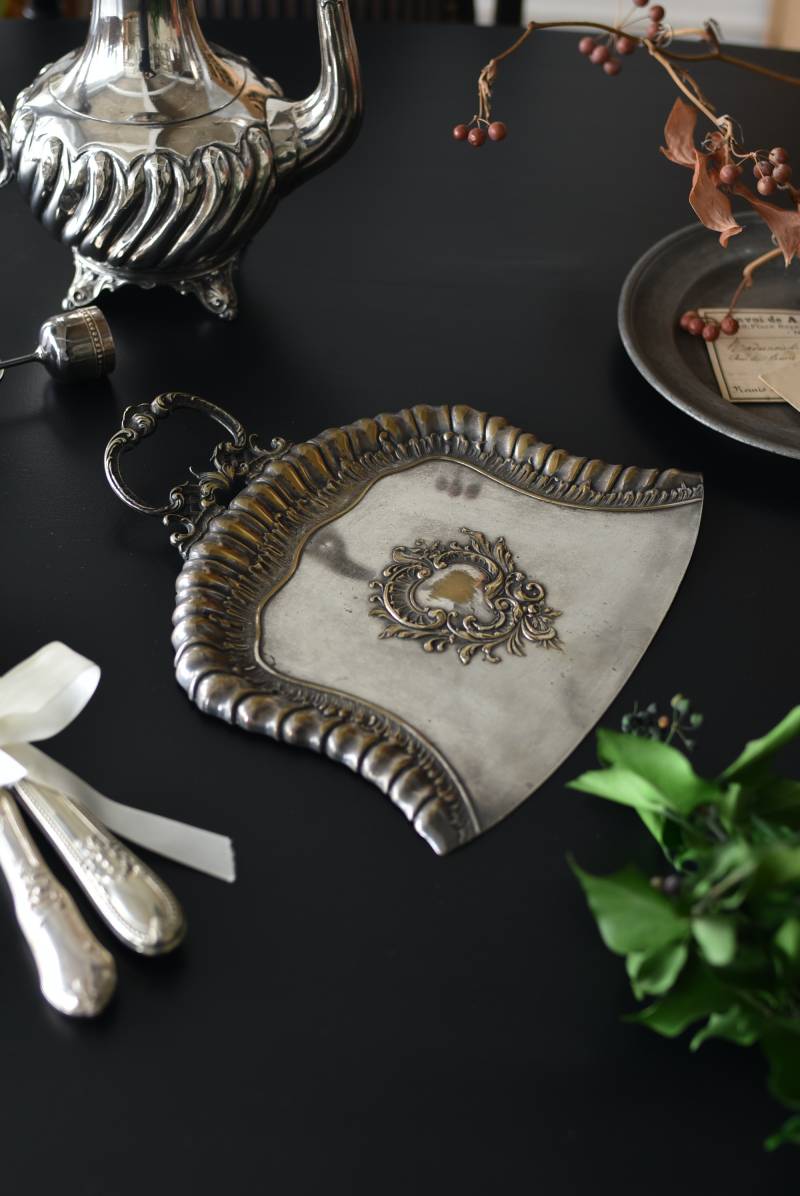 フランスのテーブルダストパン。 食後のテーブルに残ったパンくずをブラシで掃き入れて掃除するためのトレイで、優雅でエレガントなデザインが魅力的。シェルや草花など自然をモチーフとしたロカイユ装飾が美しく、中央にあしらわれた紋章のようなレリーフがアクセントとなった格式高い姿です。独自の輝きを放つシルバープレート製で、長い時をゆっくりと刻んだ趣豊かな表情が深みのある姿に。 細やかな造形がまるで芸術品のような装いで、卓上をより素敵に演出してくれる雰囲気たっぷりのアイテムです。 W 約25.7cm D 約25.7cm H 約3cm