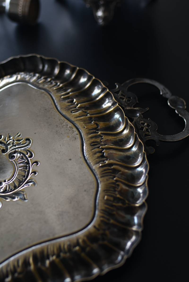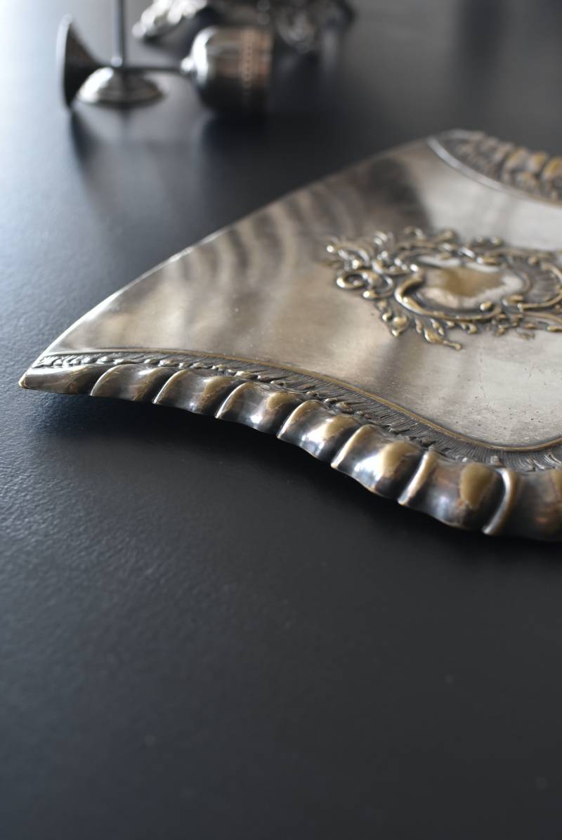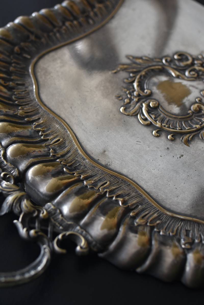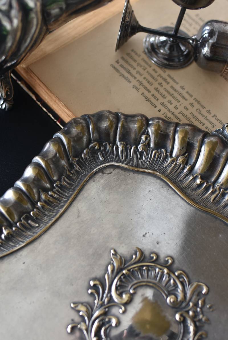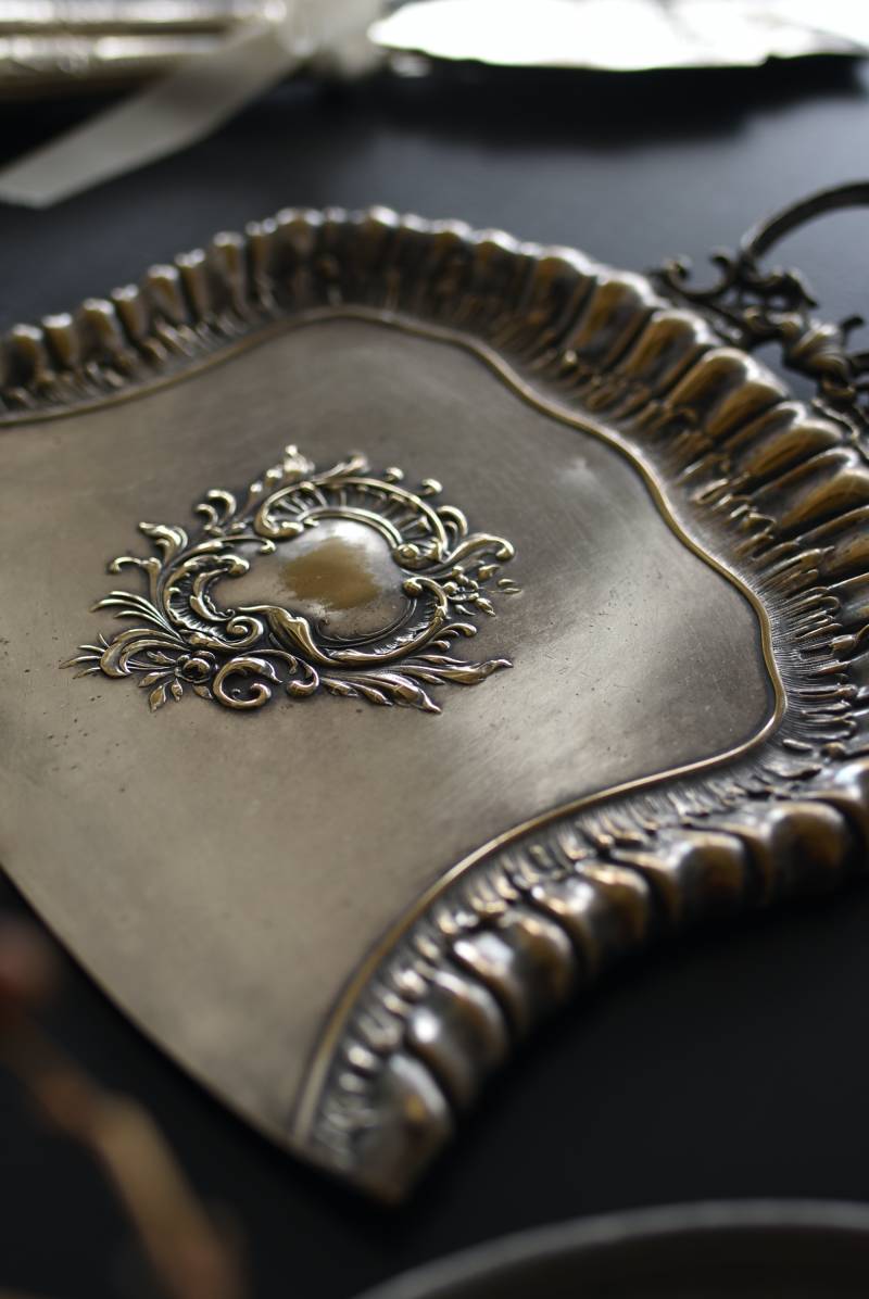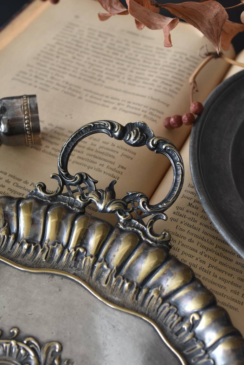 フランスのテーブルダストパン。 食後のテーブルに残ったパンくずをブラシで掃き入れて掃除するためのトレイで、優雅でエレガントなデザインが魅力的。シェルや草花など自然をモチーフとしたロカイユ装飾が美しく、中央にあしらわれた紋章のようなレリーフがアクセントとなった格式高い姿です。独自の輝きを放つシルバープレート製で、長い時をゆっくりと刻んだ趣豊かな表情が深みのある姿に。 細やかな造形がまるで芸術品のような装いで、卓上をより素敵に演出してくれる雰囲気たっぷりのアイテムです。 W 約25.7cm D 約25.7cm H 約3cm