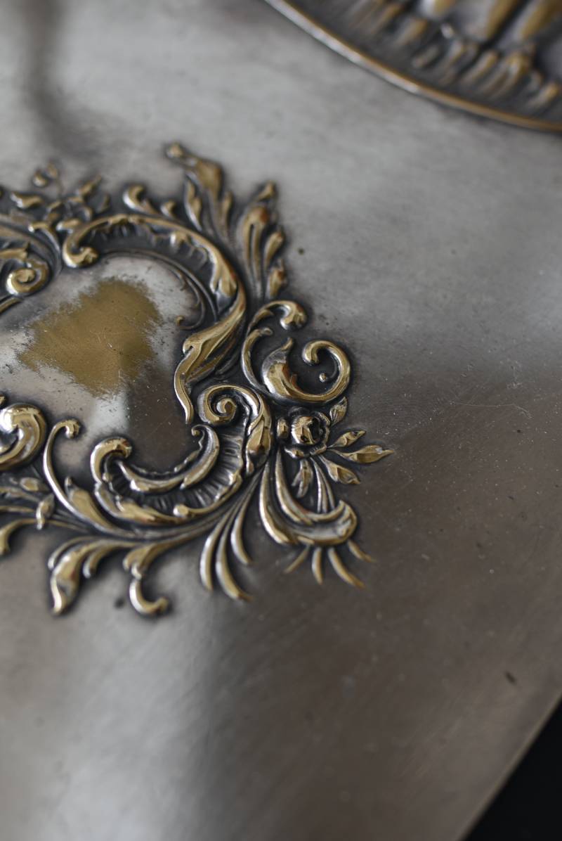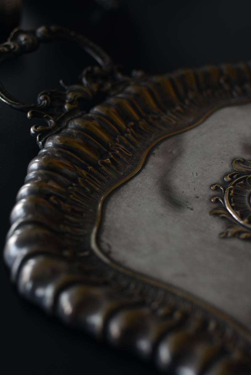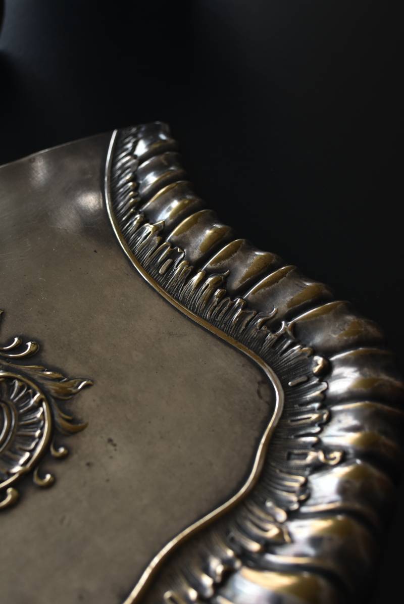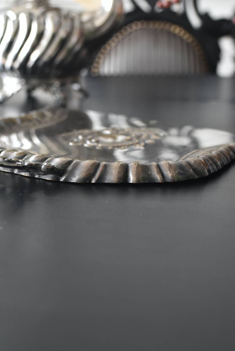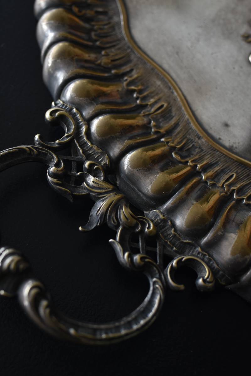 フランスのテーブルダストパン。 食後のテーブルに残ったパンくずをブラシで掃き入れて掃除するためのトレイで、優雅でエレガントなデザインが魅力的。シェルや草花など自然をモチーフとしたロカイユ装飾が美しく、中央にあしらわれた紋章のようなレリーフがアクセントとなった格式高い姿です。独自の輝きを放つシルバープレート製で、長い時をゆっくりと刻んだ趣豊かな表情が深みのある姿に。 細やかな造形がまるで芸術品のような装いで、卓上をより素敵に演出してくれる雰囲気たっぷりのアイテムです。 W 約25.7cm D 約25.7cm H 約3cm