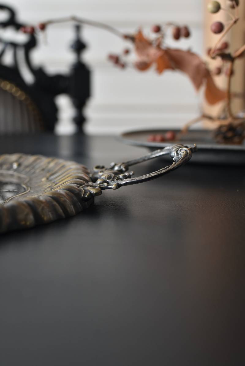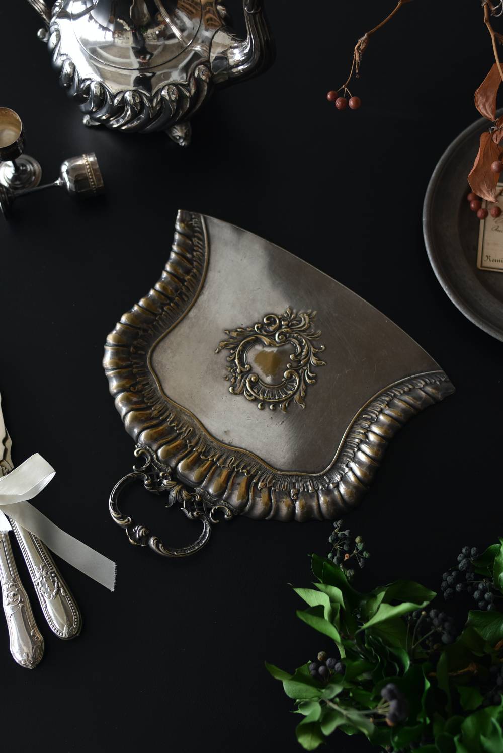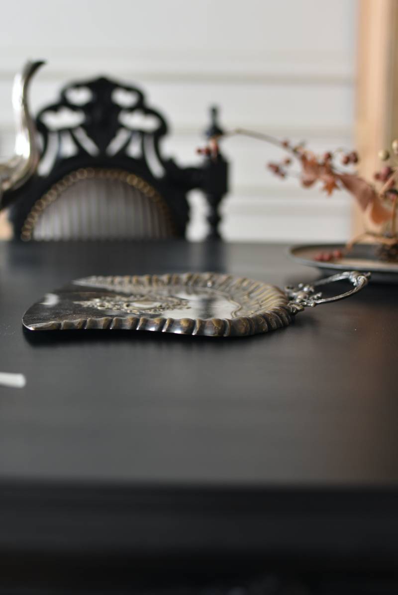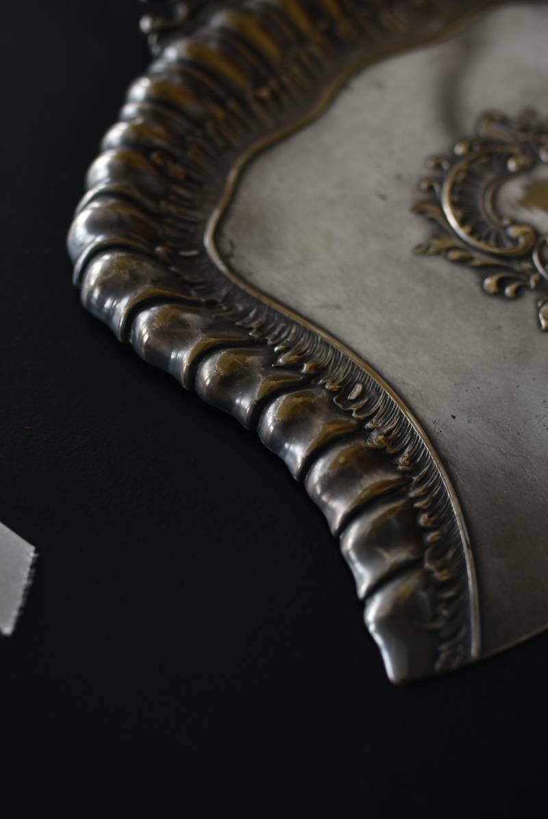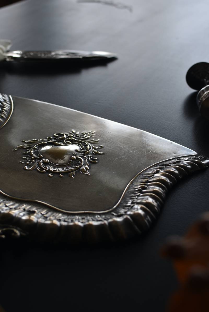 フランスのテーブルダストパン。 食後のテーブルに残ったパンくずをブラシで掃き入れて掃除するためのトレイで、優雅でエレガントなデザインが魅力的。シェルや草花など自然をモチーフとしたロカイユ装飾が美しく、中央にあしらわれた紋章のようなレリーフがアクセントとなった格式高い姿です。独自の輝きを放つシルバープレート製で、長い時をゆっくりと刻んだ趣豊かな表情が深みのある姿に。 細やかな造形がまるで芸術品のような装いで、卓上をより素敵に演出してくれる雰囲気たっぷりのアイテムです。 W 約25.7cm D 約25.7cm H 約3cm