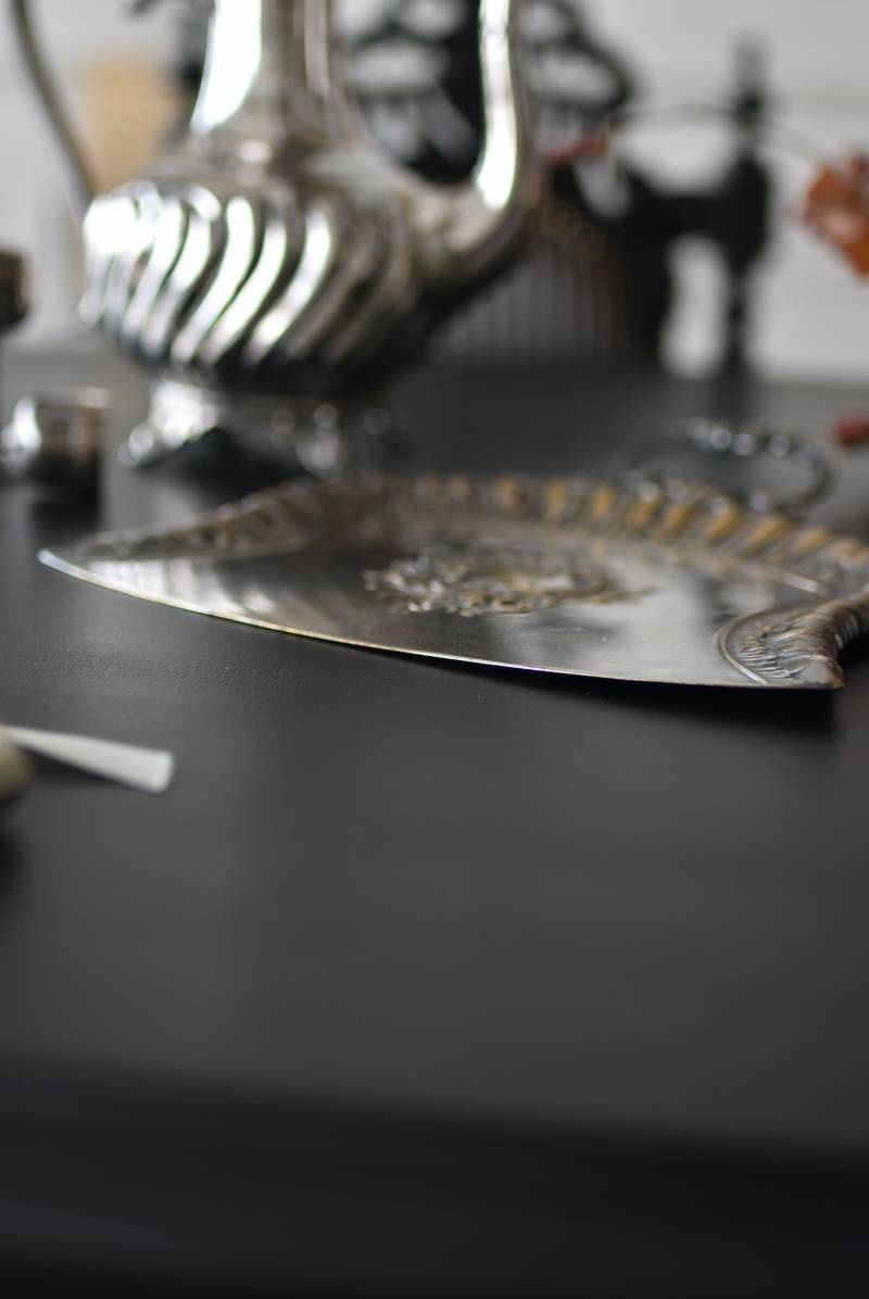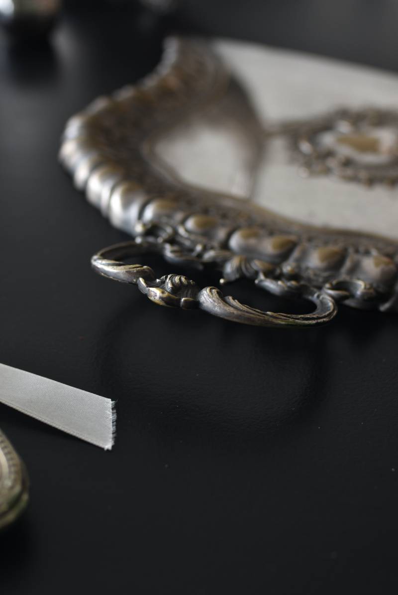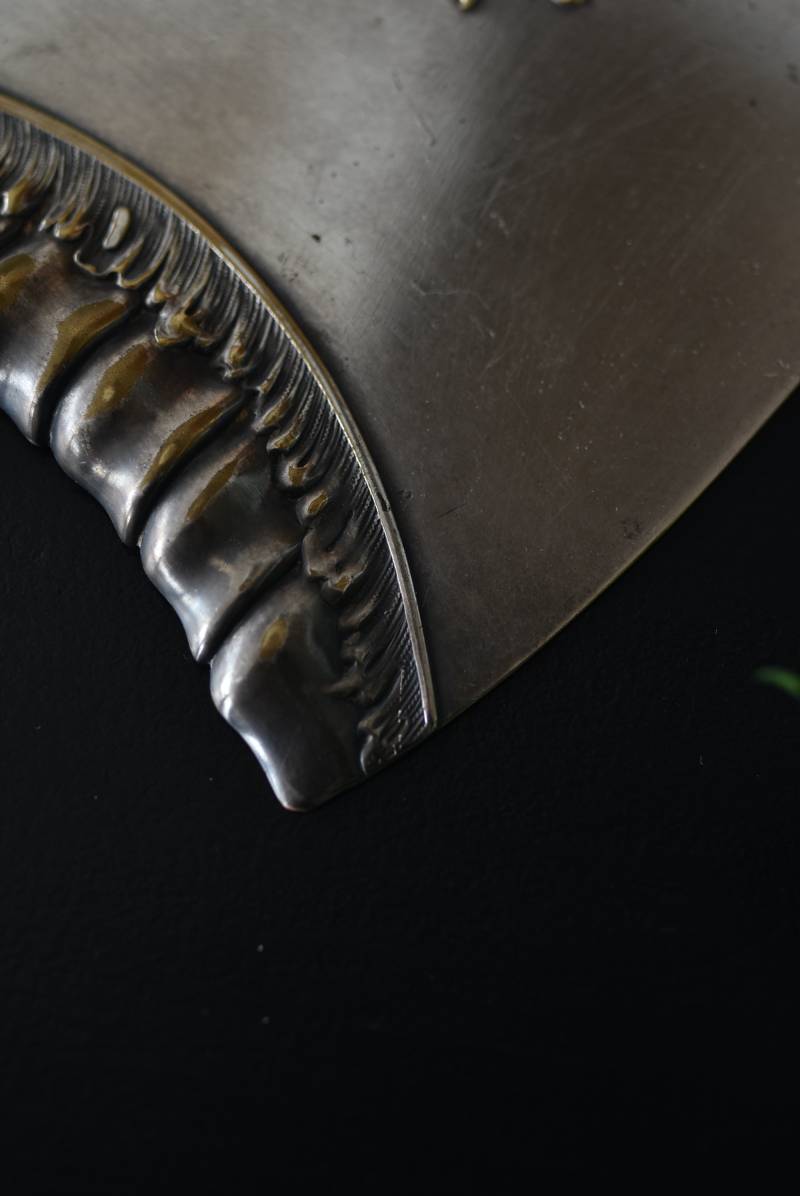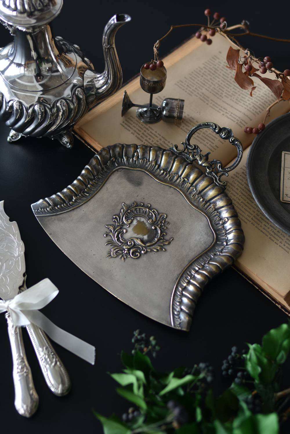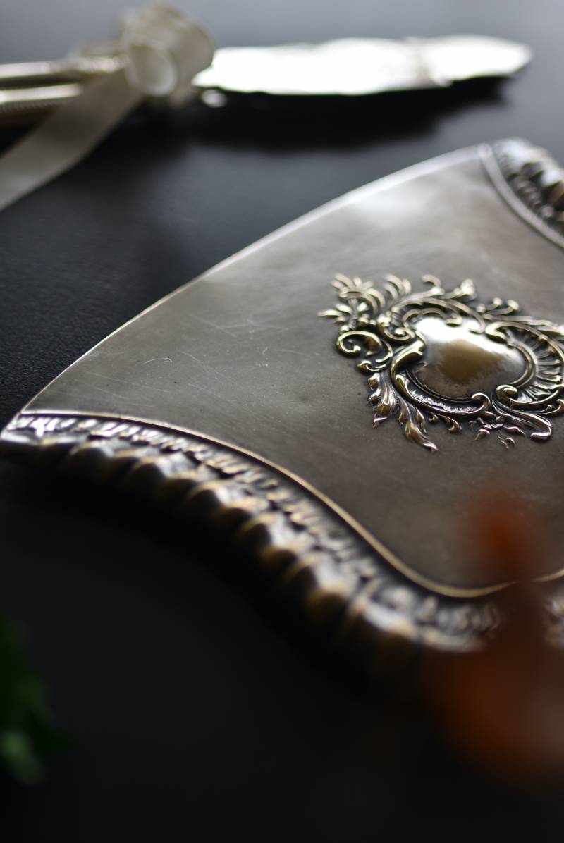 フランスのテーブルダストパン。 食後のテーブルに残ったパンくずをブラシで掃き入れて掃除するためのトレイで、優雅でエレガントなデザインが魅力的。シェルや草花など自然をモチーフとしたロカイユ装飾が美しく、中央にあしらわれた紋章のようなレリーフがアクセントとなった格式高い姿です。独自の輝きを放つシルバープレート製で、長い時をゆっくりと刻んだ趣豊かな表情が深みのある姿に。 細やかな造形がまるで芸術品のような装いで、卓上をより素敵に演出してくれる雰囲気たっぷりのアイテムです。 W 約25.7cm D 約25.7cm H 約3cm