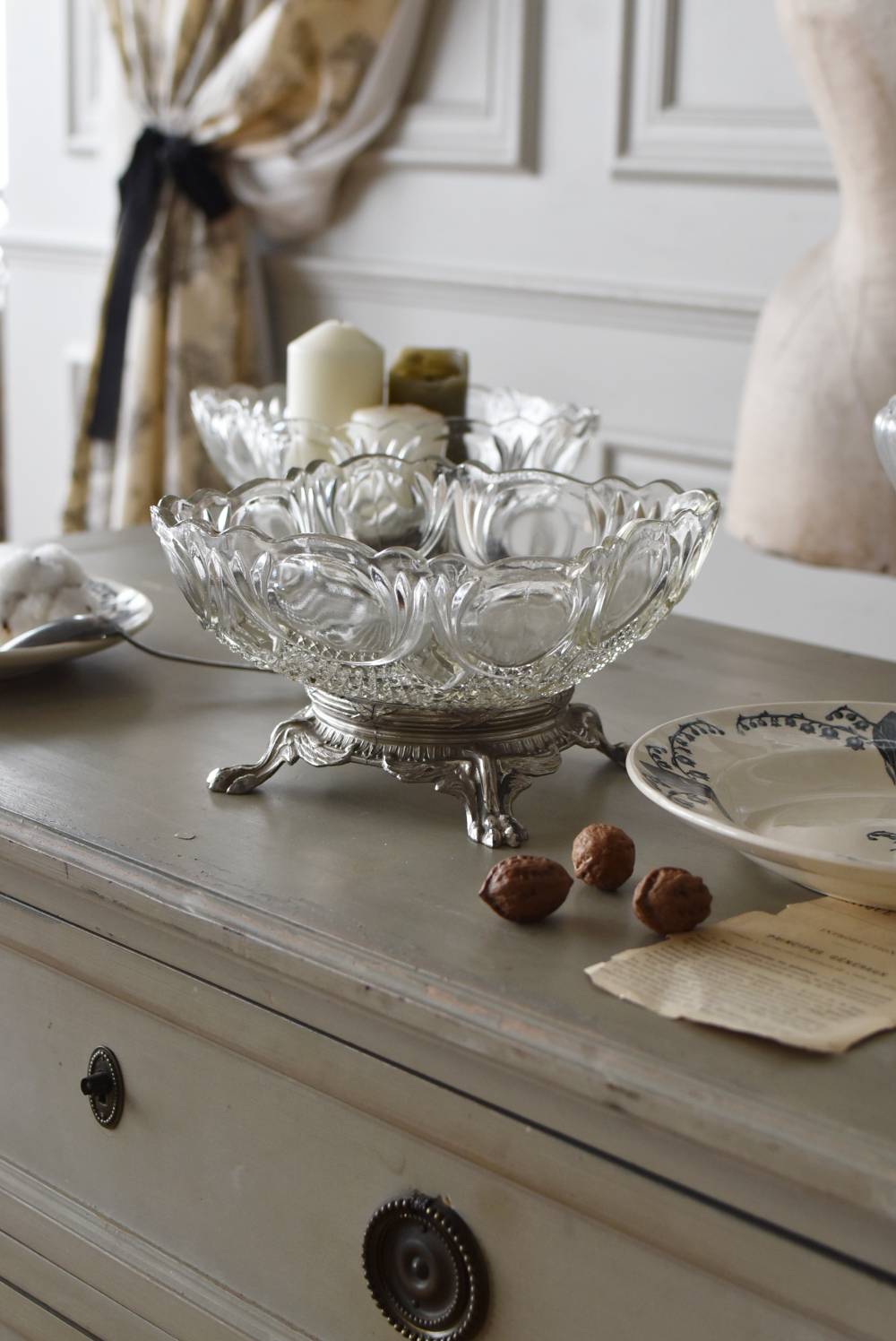 フランスのガラスコンポート。 丸みを帯びたスクエア型になったプレスドガラスの器には、菱形・六角形・曲線などが組み合わさった幾何学模様が楽しめ、フリルのような縁取りやぽってりと厚みまでも豪華なデザインです。メタル製の土台にもまるで天使の羽が生えたような動物の脚のデザインが厳かな姿で、くすんだシルバーカラーはシックな雰囲気をもたらしてくれます。 土台とガラス器はスクリュー式(ねじ込み)となっています。ガラス内側が滑らかな質感に外側が凸凹とした立体的な作りで、光の反射が細やかなに取り込め、澄んだ表情が引き立ってくれそうです。それぞれでの販売となりますが、同じデザインのガラスコンポートがもう1点あります。 W 約21cm D 約21cm H 約13cm