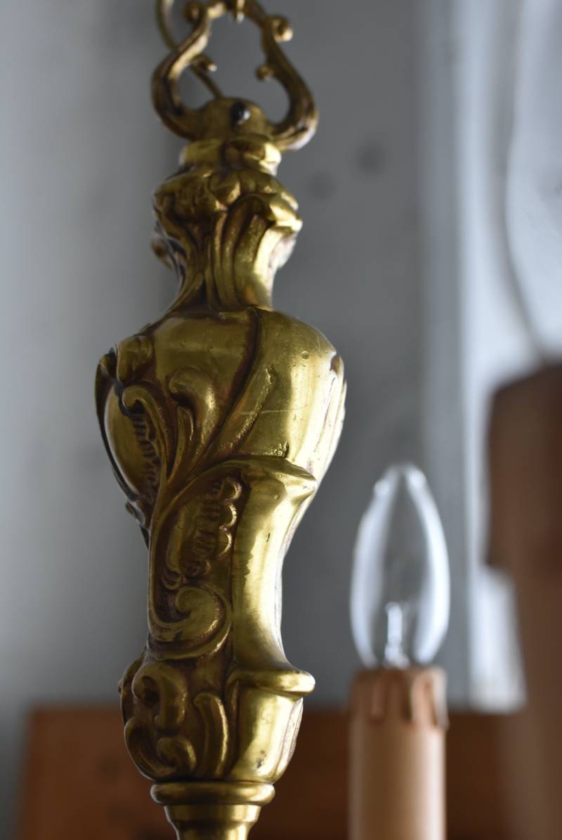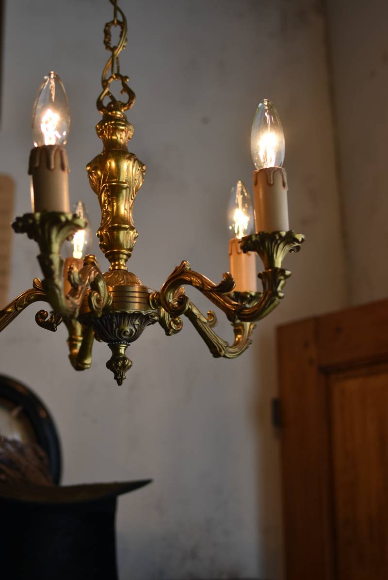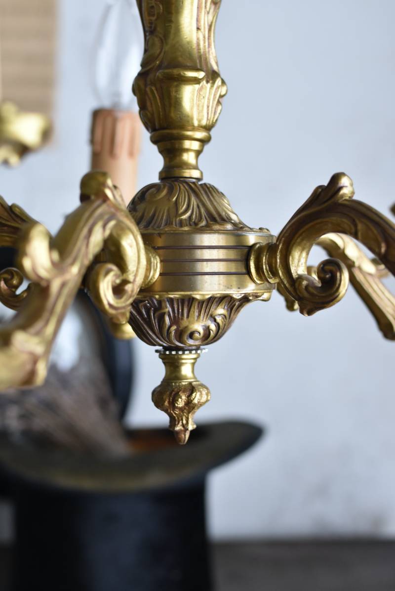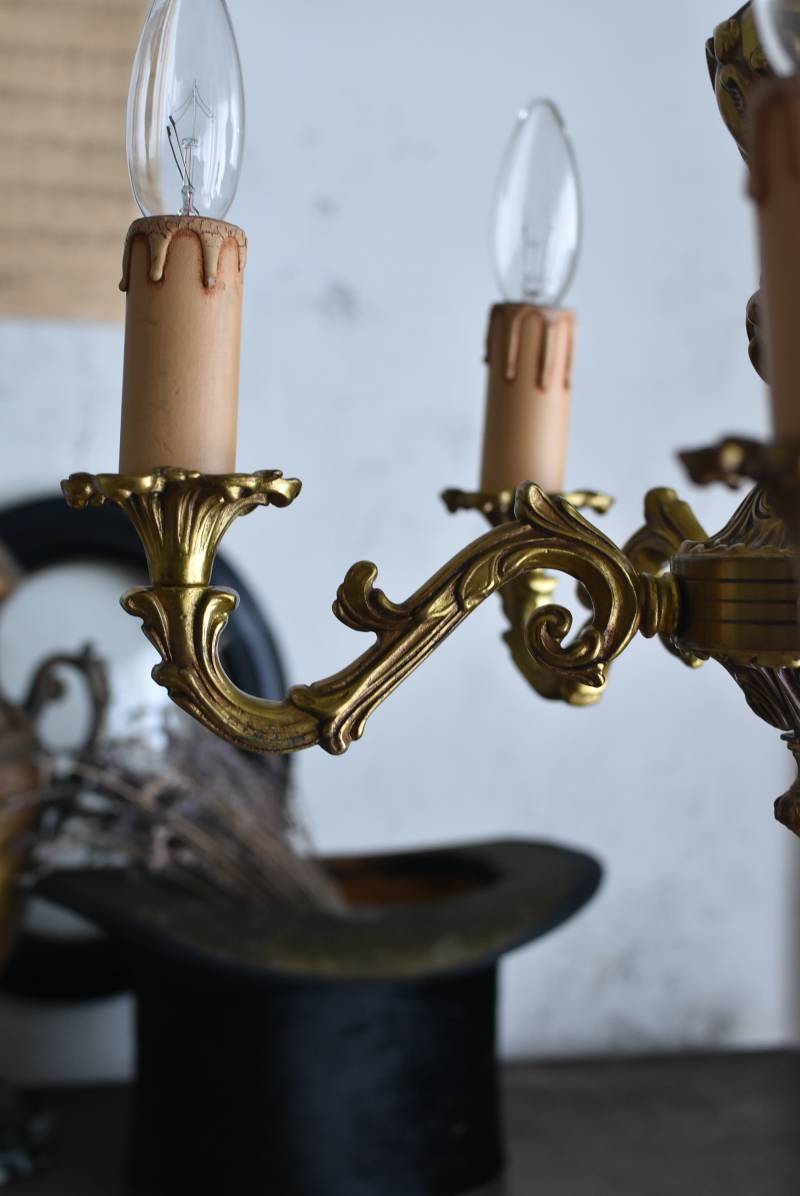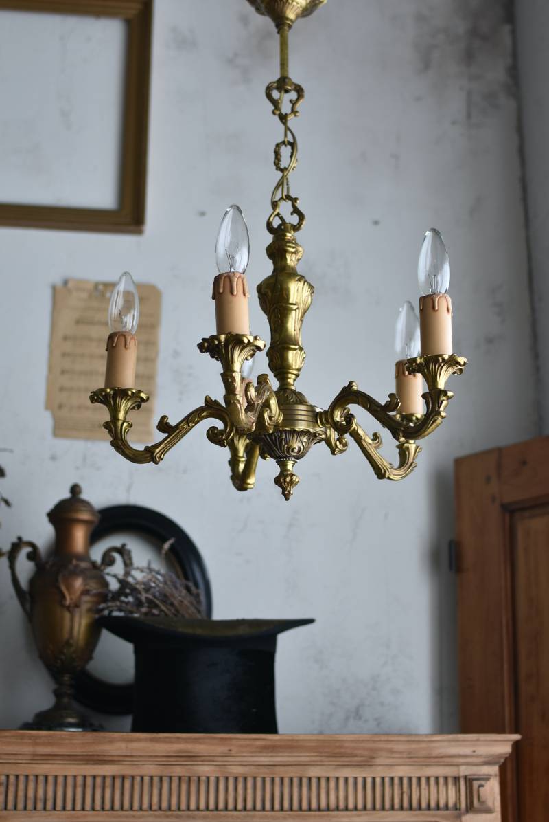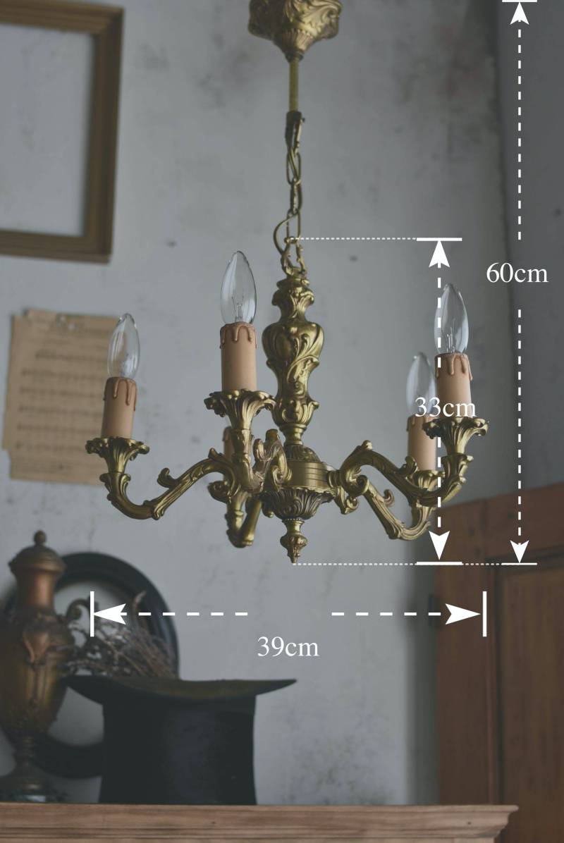 厳かな空間作りにぴったりなフランスの5灯シャンデリア。 どっしりと構えた重厚なブロンズ製のボディが魅力の一つで、深みのあるゴールドカラーに格式高さを感じられる佇まい。植物をモチーフとした流麗なレリーフ装飾があしらわれ、しなやかなアームラインがフランスらしい優美なデザインです。明かりを灯した際に浮かぶ細やかな陰影が美しく、まるで芸術作品のような装いが雰囲気のある一品に。 コード・ソケット・シーリングは新しいものに交換済みです。こちらの商品は条件を満たしているので引掛シーリングをご使用いただけます。元は直付けで使われていた物で天井カバーが浅い為、天井との間に隙間ができます。天井との隙間が気になられる方は直付け工事をおすすめします。 電球は付属しません。 W 約39cm D 約39cm H 約33cm コード含む全長 約60cm 重量 約3.5kg 電球口径 E17 *40W以下をご使用下さい。 40W×5灯=200W
