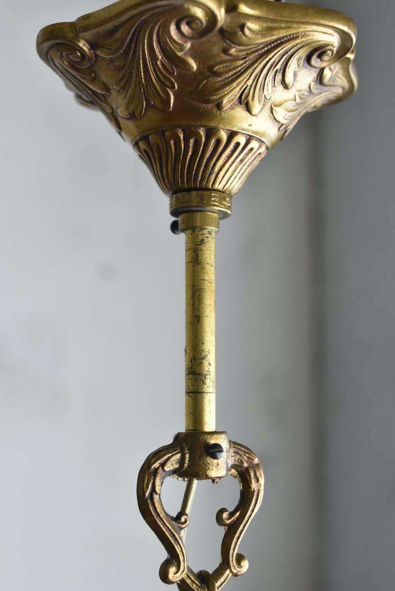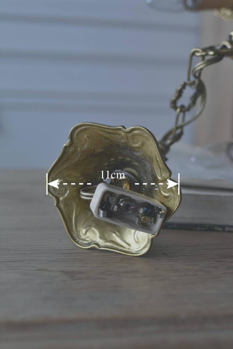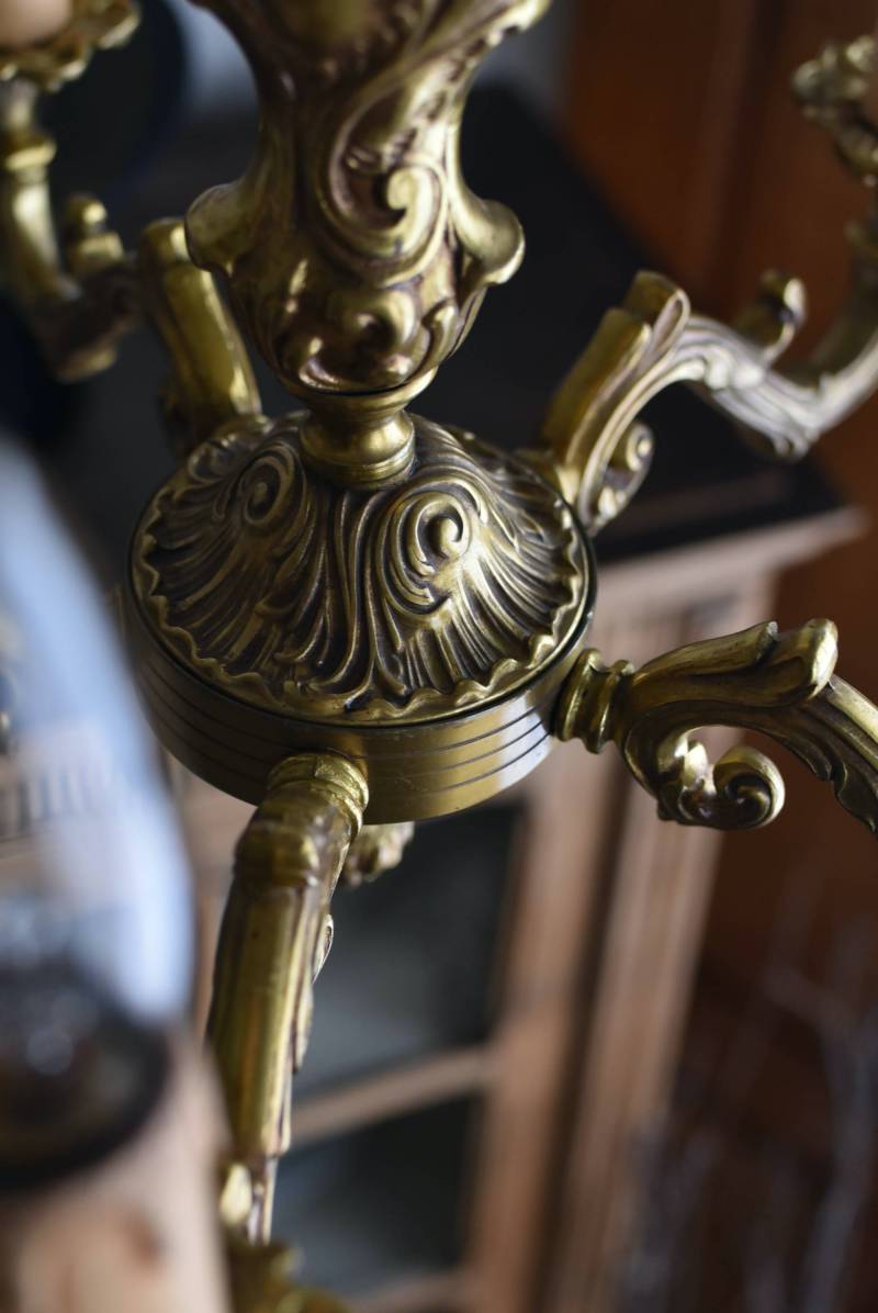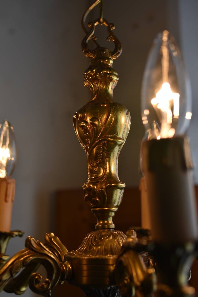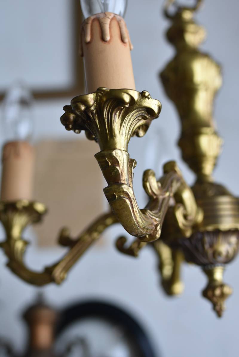 厳かな空間作りにぴったりなフランスの5灯シャンデリア。 どっしりと構えた重厚なブロンズ製のボディが魅力の一つで、深みのあるゴールドカラーに格式高さを感じられる佇まい。植物をモチーフとした流麗なレリーフ装飾があしらわれ、しなやかなアームラインがフランスらしい優美なデザインです。明かりを灯した際に浮かぶ細やかな陰影が美しく、まるで芸術作品のような装いが雰囲気のある一品に。 コード・ソケット・シーリングは新しいものに交換済みです。こちらの商品は条件を満たしているので引掛シーリングをご使用いただけます。元は直付けで使われていた物で天井カバーが浅い為、天井との間に隙間ができます。天井との隙間が気になられる方は直付け工事をおすすめします。 電球は付属しません。 W 約39cm D 約39cm H 約33cm コード含む全長 約60cm 重量 約3.5kg 電球口径 E17 *40W以下をご使用下さい。 40W×5灯=200W