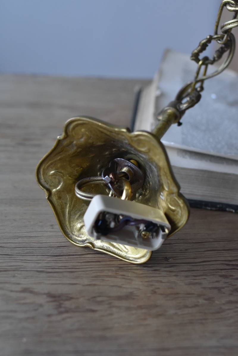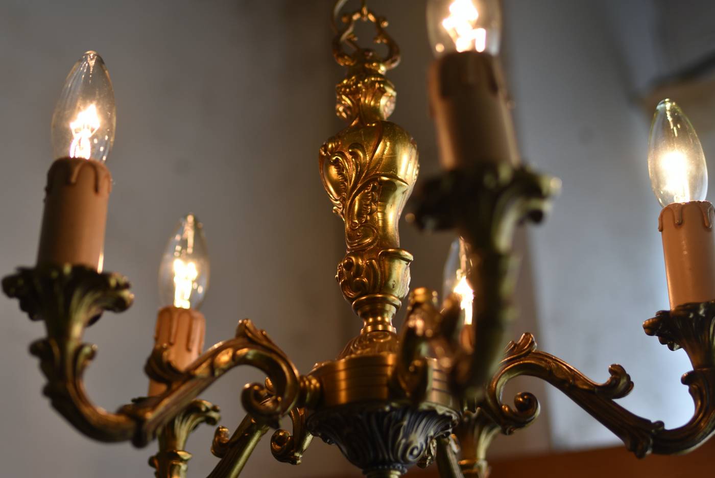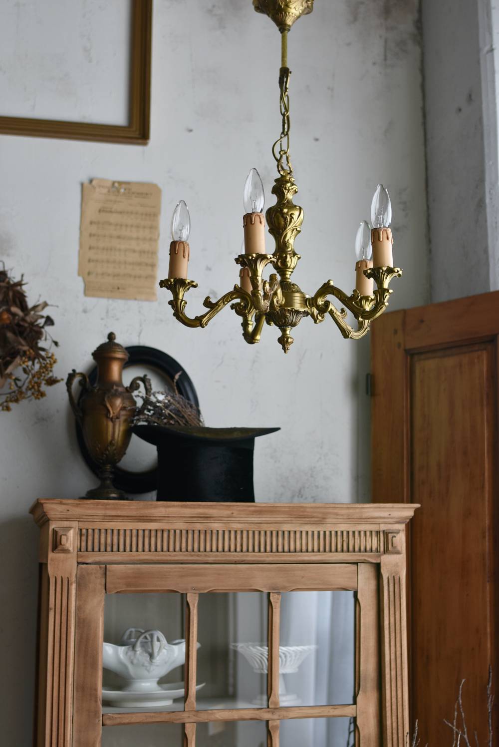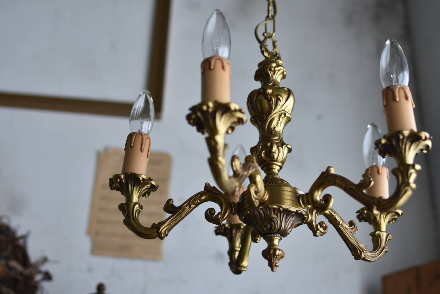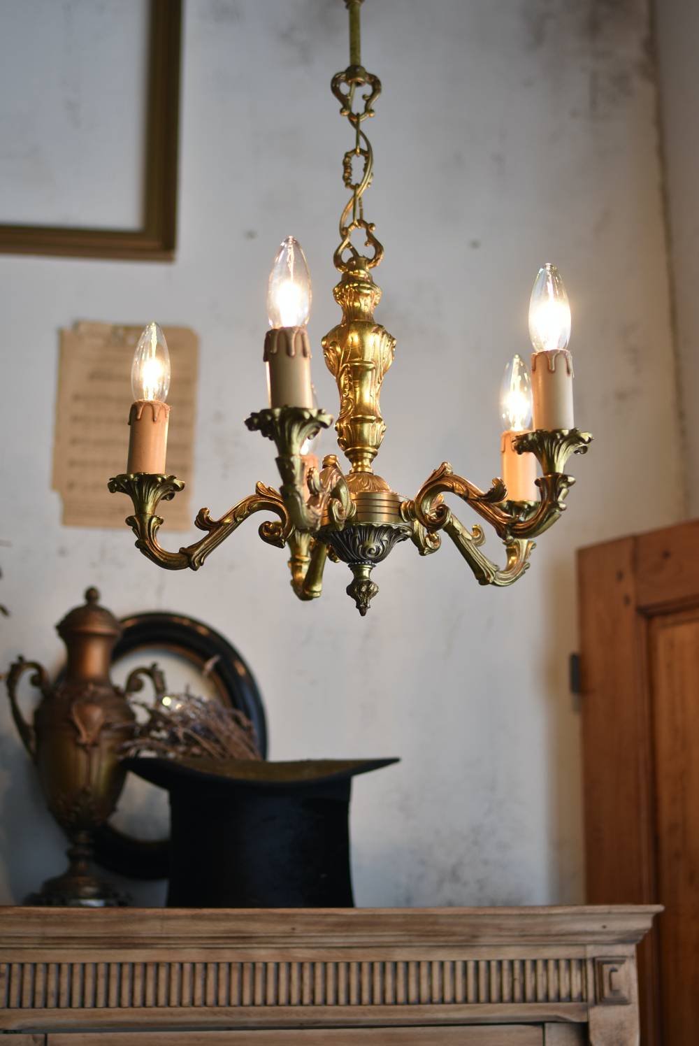 厳かな空間作りにぴったりなフランスの5灯シャンデリア。 どっしりと構えた重厚なブロンズ製のボディが魅力の一つで、深みのあるゴールドカラーに格式高さを感じられる佇まい。植物をモチーフとした流麗なレリーフ装飾があしらわれ、しなやかなアームラインがフランスらしい優美なデザインです。明かりを灯した際に浮かぶ細やかな陰影が美しく、まるで芸術作品のような装いが雰囲気のある一品に。 コード・ソケット・シーリングは新しいものに交換済みです。こちらの商品は条件を満たしているので引掛シーリングをご使用いただけます。元は直付けで使われていた物で天井カバーが浅い為、天井との間に隙間ができます。天井との隙間が気になられる方は直付け工事をおすすめします。 電球は付属しません。 W 約39cm D 約39cm H 約33cm コード含む全長 約60cm 重量 約3.5kg 電球口径 E17 *40W以下をご使用下さい。 40W×5灯=200W