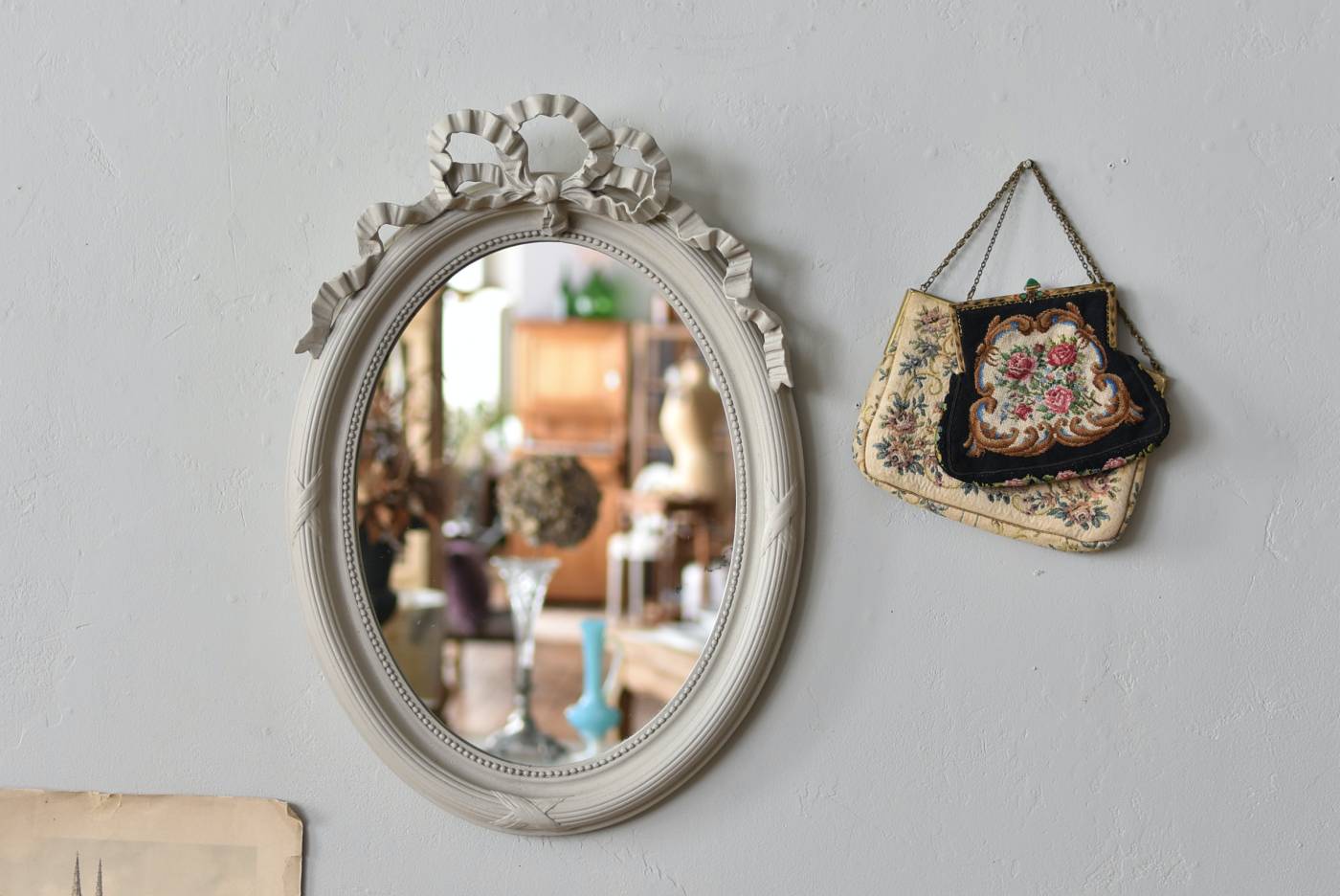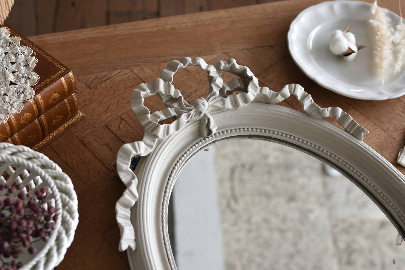 フランスのオーバルミラー。 淡いグレーカラーにペイントされた上品な印象の姿で、ふっくらとしたオーバルシルエットがどこか優しげな佇まい。トップには大きなリボン装飾が大胆に配置されており、立体的な造形のフレームが壁面に奥行きをプラスしてくれるデザインとなっています。ミラーには小さなキズや縁付近にシミが見受けられますが歪みはなく、実用としてもしっかりと活躍してくれそう。 ぐるりと内縁を囲うパールレリーフが優美なアクセントとなった気品ある姿で、その甘めな装いがフェミニンな空間にも映えるアイテムです。 W 約38.5cm D 約7.5cm(+金具1.5cm) H 約54cm 内寸 W約28cm×H約38.5cm 重量 約2.3kg