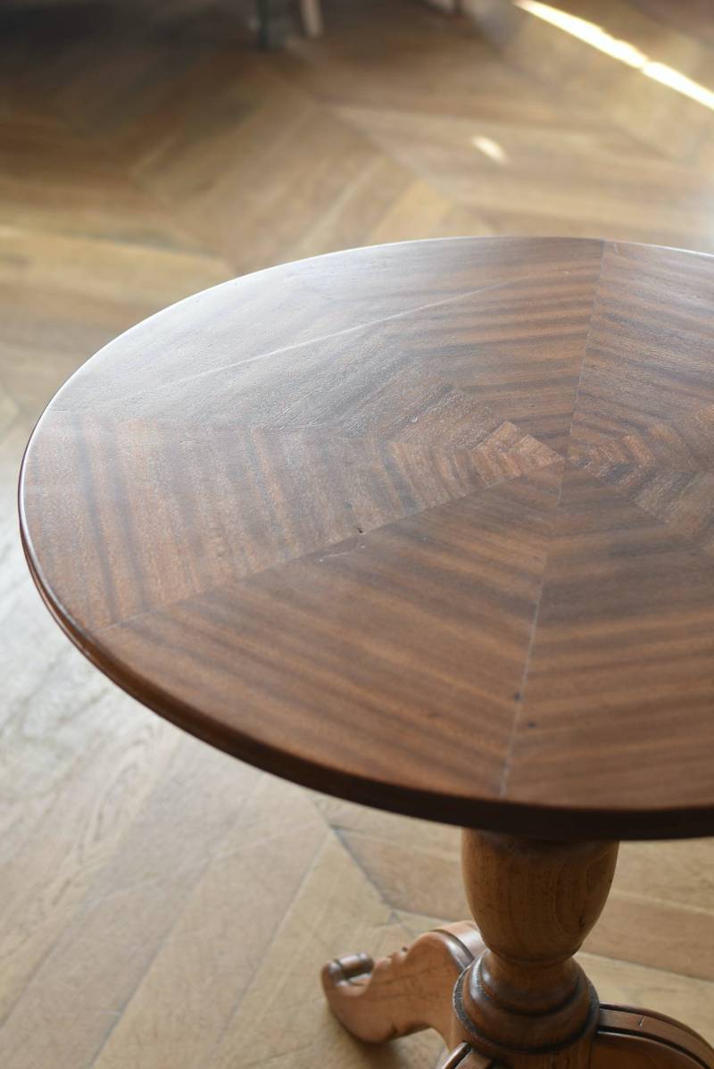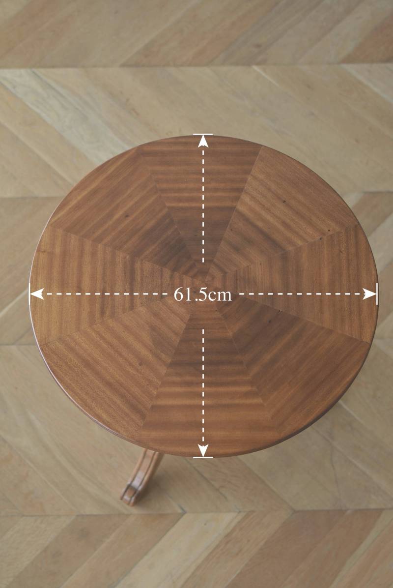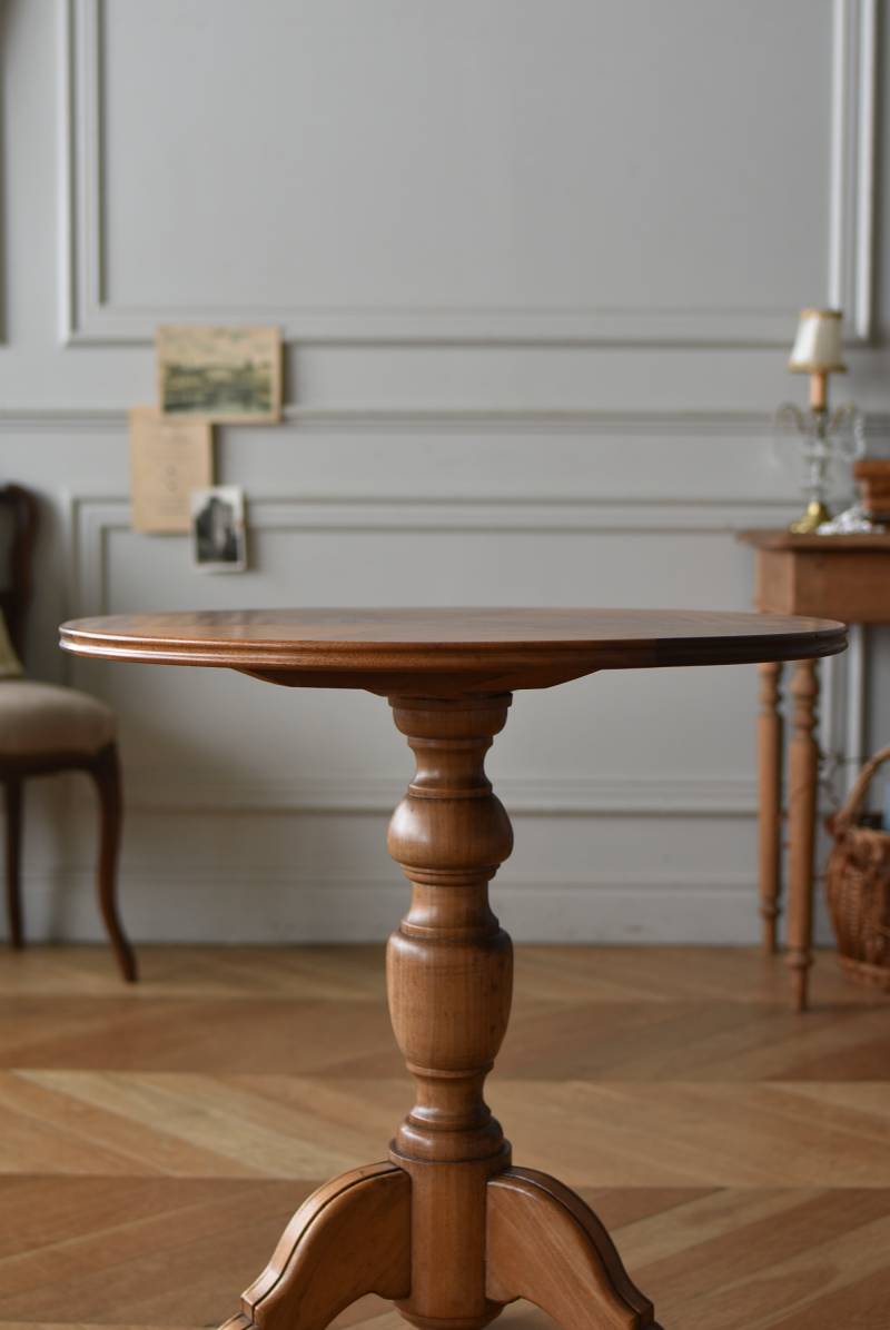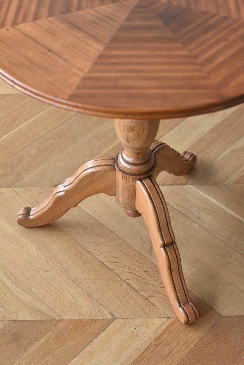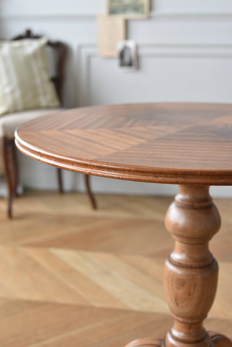 フランス1930年頃のラウンドテーブル。 明るめの木材が使用されたナチュラルな姿で、凹凸のはっきりとした支柱から流れるように広がる3本脚が特徴的な佇まい。天板には中心から放射状に突板を配置するクモの巣貼りと呼ばれる装飾技法が用いられており、虎斑のような美しい杢目(もくめ)が、光の角度によって絹のような光沢を放つ存在感たっぷりのデザインとなっています。全体を一度剥離して再塗装しており、程よい艶のある質感が魅力の一つに。 大きすぎないサイズ感でお部屋にも取り入れやすく、お気に入りの椅子を合わせてカフェテーブルとしてはもちろん、花瓶などを飾るディスプレイ台としてもおすすめのアイテムです。 天板直径 約61.5cm 脚元 約57cm×57cm H 約69cm こちらの商品の配送について