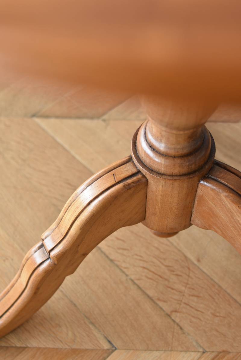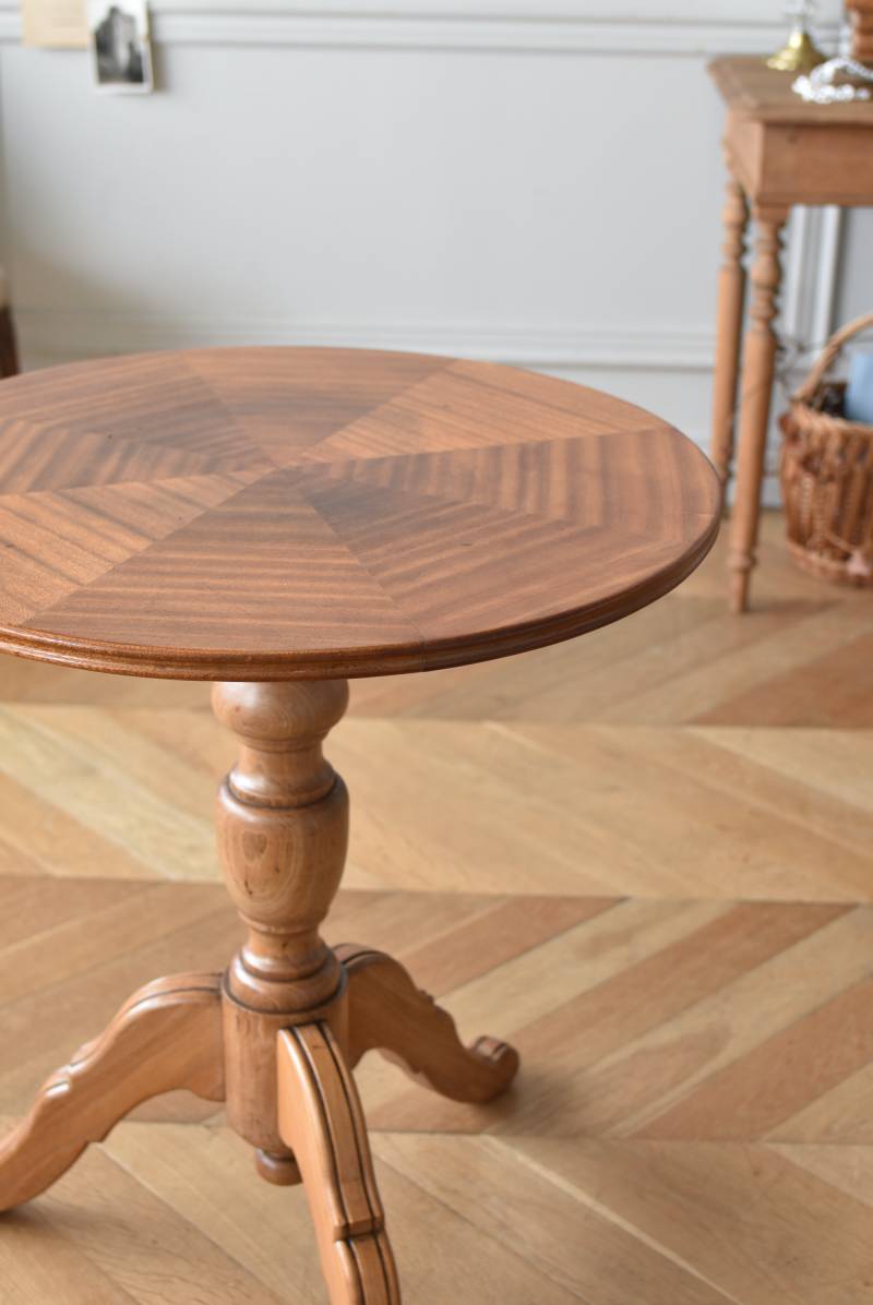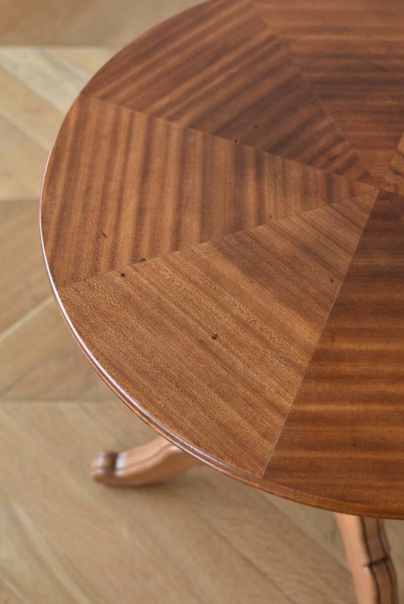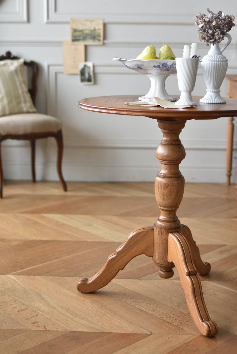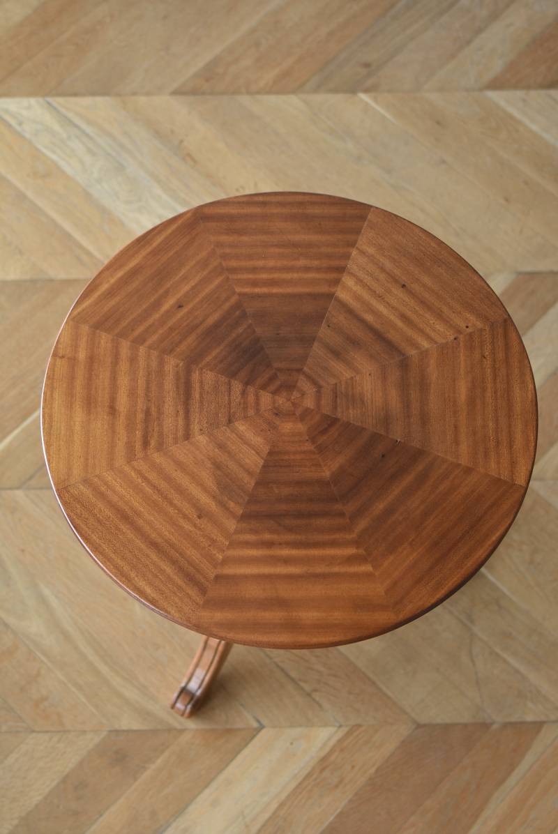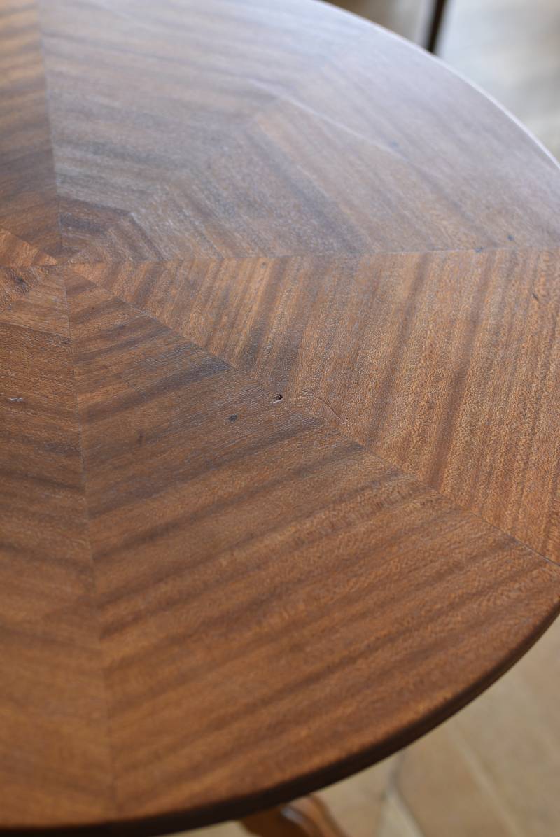 フランス1930年頃のラウンドテーブル。 明るめの木材が使用されたナチュラルな姿で、凹凸のはっきりとした支柱から流れるように広がる3本脚が特徴的な佇まい。天板には中心から放射状に突板を配置するクモの巣貼りと呼ばれる装飾技法が用いられており、虎斑のような美しい杢目(もくめ)が、光の角度によって絹のような光沢を放つ存在感たっぷりのデザインとなっています。全体を一度剥離して再塗装しており、程よい艶のある質感が魅力の一つに。 大きすぎないサイズ感でお部屋にも取り入れやすく、お気に入りの椅子を合わせてカフェテーブルとしてはもちろん、花瓶などを飾るディスプレイ台としてもおすすめのアイテムです。 天板直径 約61.5cm 脚元 約57cm×57cm H 約69cm こちらの商品の配送について