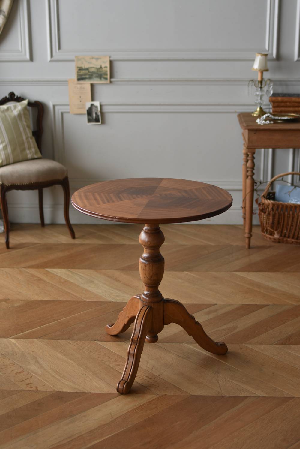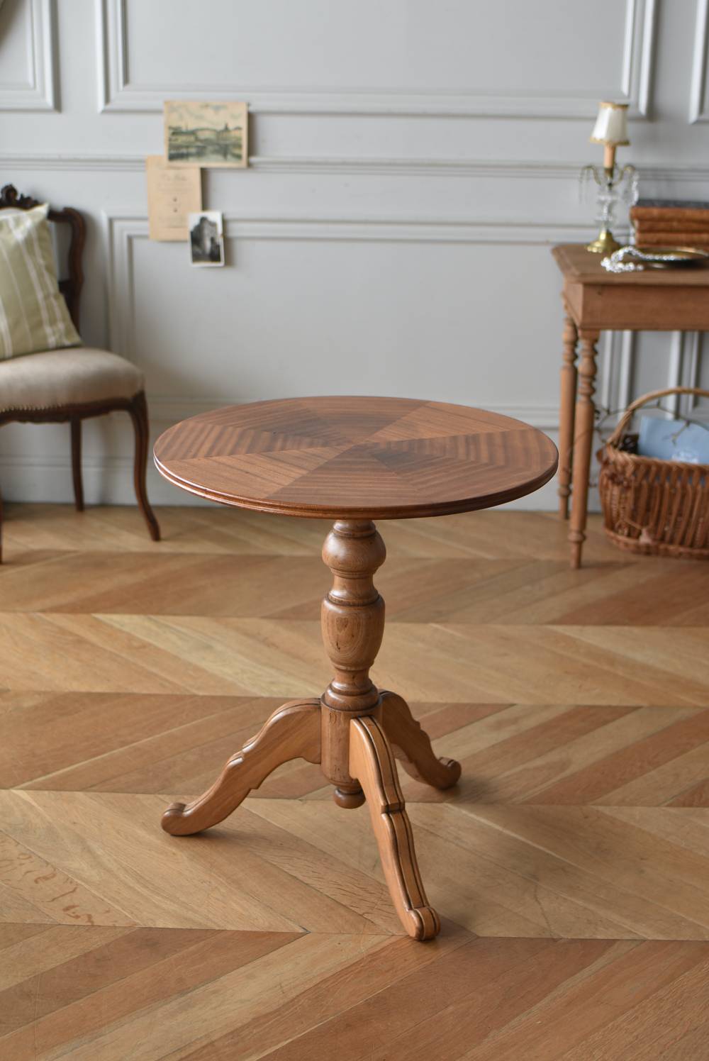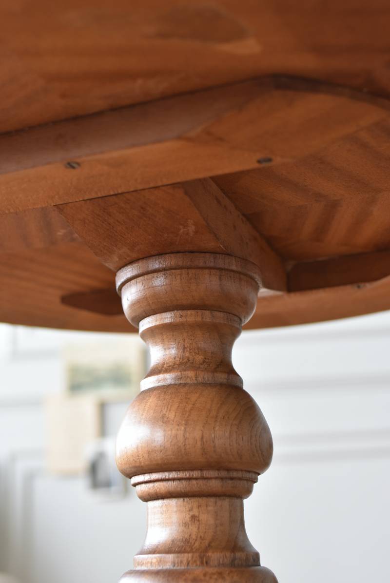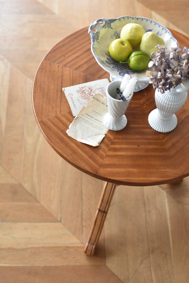 フランス1930年頃のラウンドテーブル。 明るめの木材が使用されたナチュラルな姿で、凹凸のはっきりとした支柱から流れるように広がる3本脚が特徴的な佇まい。天板には中心から放射状に突板を配置するクモの巣貼りと呼ばれる装飾技法が用いられており、虎斑のような美しい杢目(もくめ)が、光の角度によって絹のような光沢を放つ存在感たっぷりのデザインとなっています。全体を一度剥離して再塗装しており、程よい艶のある質感が魅力の一つに。 大きすぎないサイズ感でお部屋にも取り入れやすく、お気に入りの椅子を合わせてカフェテーブルとしてはもちろん、花瓶などを飾るディスプレイ台としてもおすすめのアイテムです。 天板直径 約61.5cm 脚元 約57cm×57cm H 約69cm こちらの商品の配送について