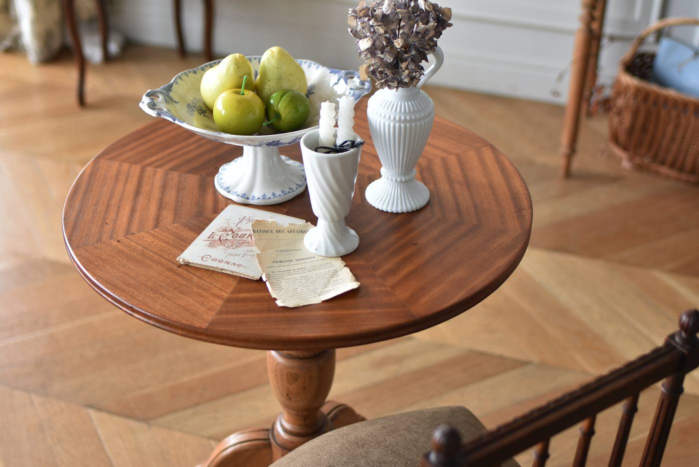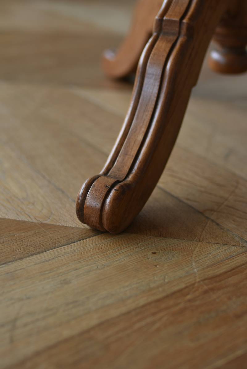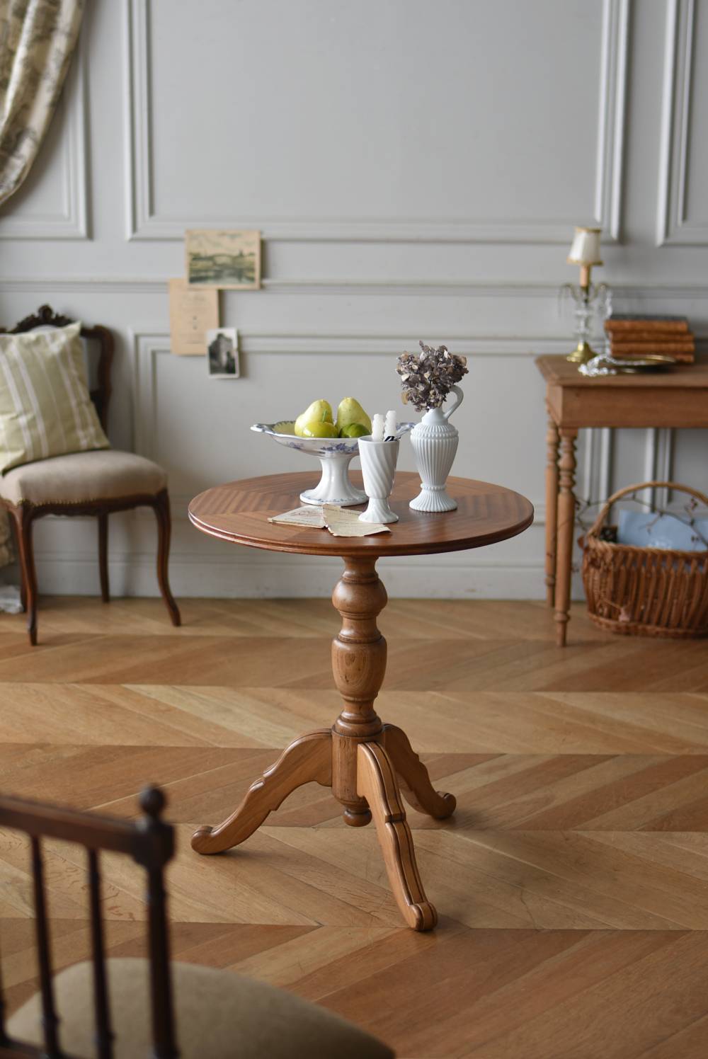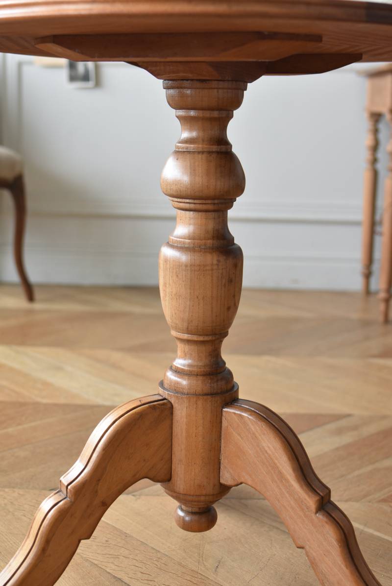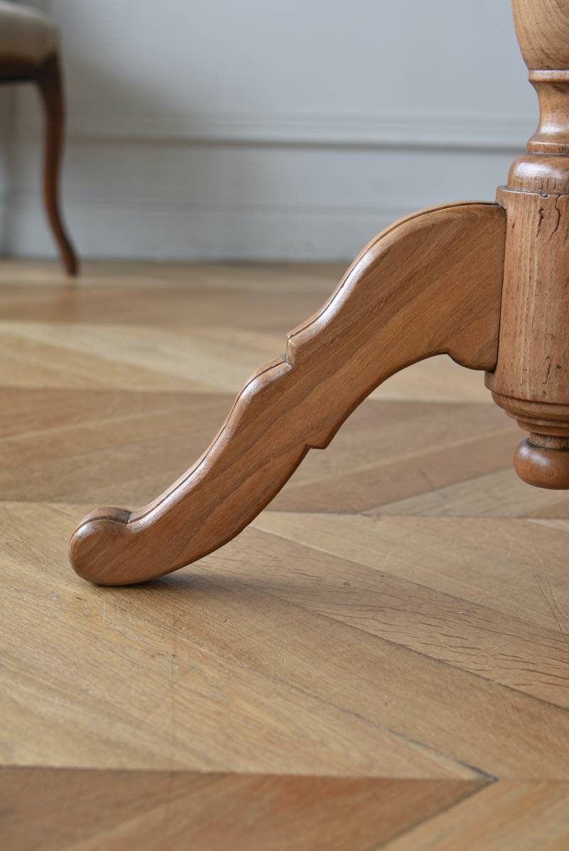 フランス1930年頃のラウンドテーブル。 明るめの木材が使用されたナチュラルな姿で、凹凸のはっきりとした支柱から流れるように広がる3本脚が特徴的な佇まい。天板には中心から放射状に突板を配置するクモの巣貼りと呼ばれる装飾技法が用いられており、虎斑のような美しい杢目(もくめ)が、光の角度によって絹のような光沢を放つ存在感たっぷりのデザインとなっています。全体を一度剥離して再塗装しており、程よい艶のある質感が魅力の一つに。 大きすぎないサイズ感でお部屋にも取り入れやすく、お気に入りの椅子を合わせてカフェテーブルとしてはもちろん、花瓶などを飾るディスプレイ台としてもおすすめのアイテムです。 天板直径 約61.5cm 脚元 約57cm×57cm H 約69cm こちらの商品の配送について