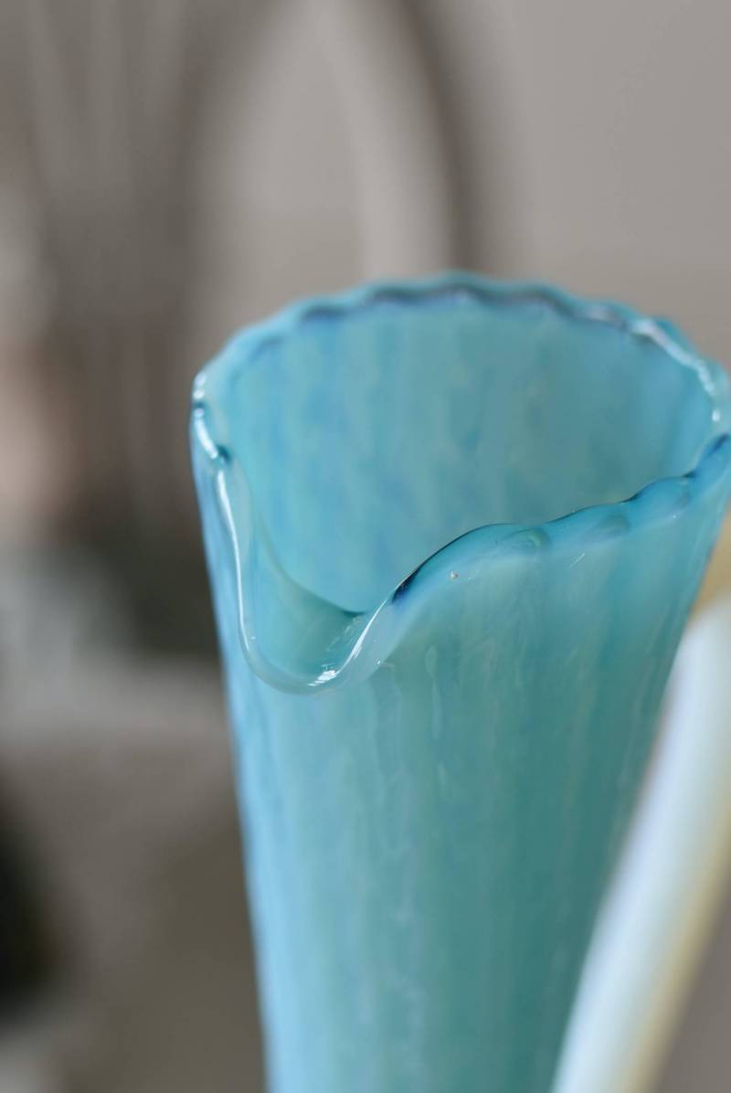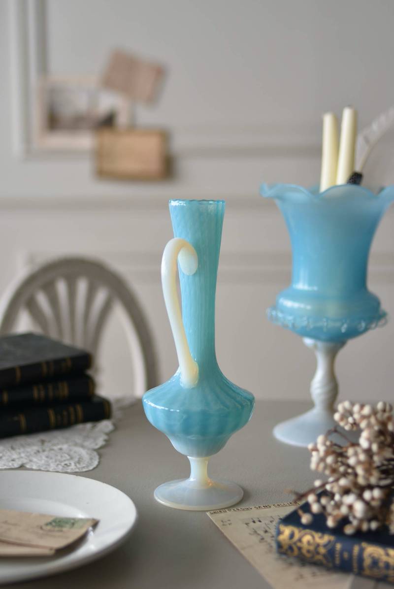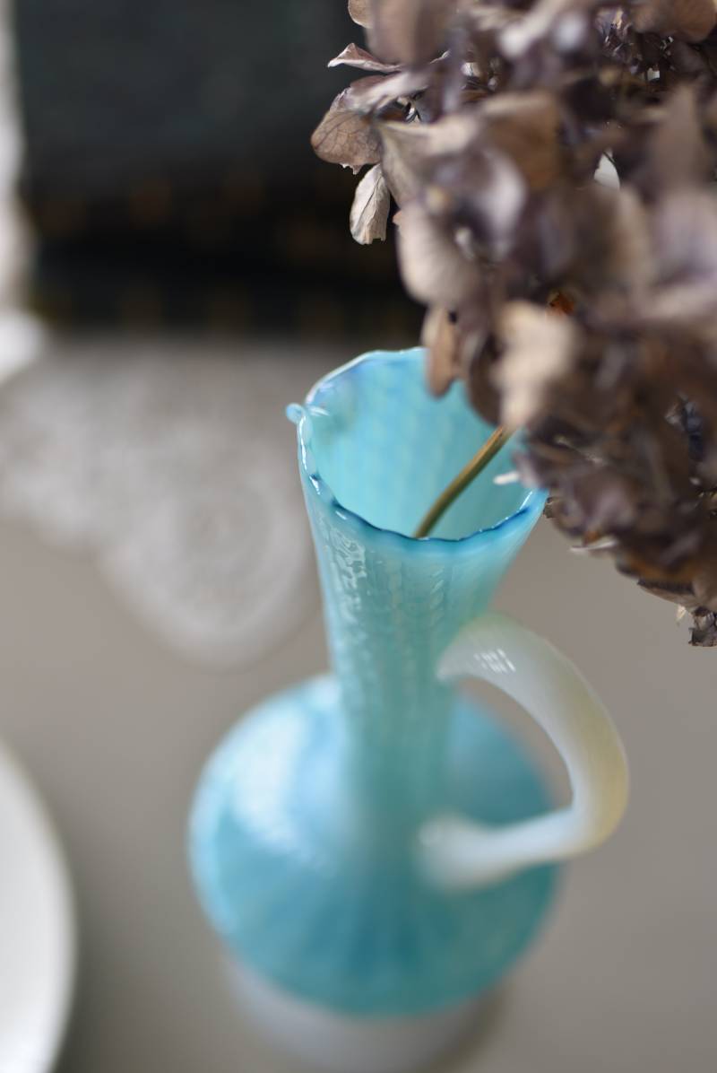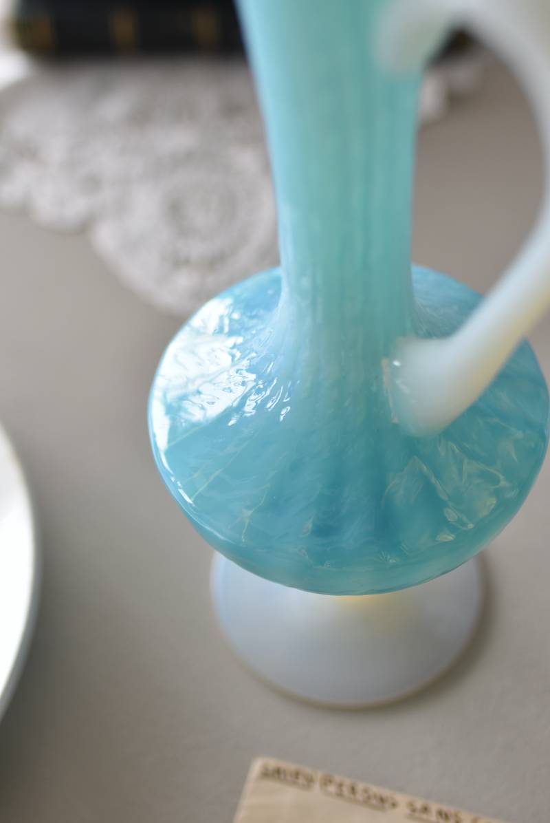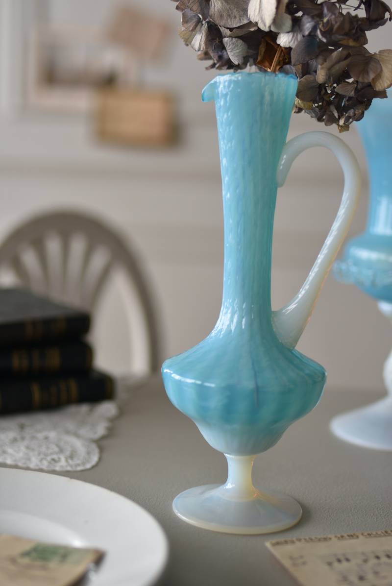 フランスのオパリンガラスフラワーベース。 涼やかなスカイブルーと柔い乳白色のバイカラーが特徴で、どこか優しげな印象の佇まい。光に透かすと独自の光彩が楽しめるオパリンガラス製で、まるで水面のような揺らぎを生み出すボディの質感がより幻想的なデザインとなっています。ちょこんと小さな注ぎ口やしなやかな曲線のハンドル、美しいグラデーションがかかった脚元など、そのまま置いておくだけでも絵になるこだわりたっぷりの一品に。 水を入れて生花を飾ったり、ドライフラワーなどをさしてディスプレイとしても独自の雰囲気を楽しめる可愛らしいアイテムです。 W 約11cm D 約9.5cm H 約24.5cm 口径 約4cm