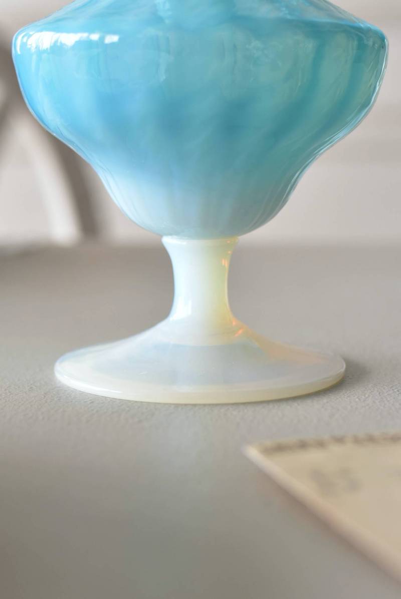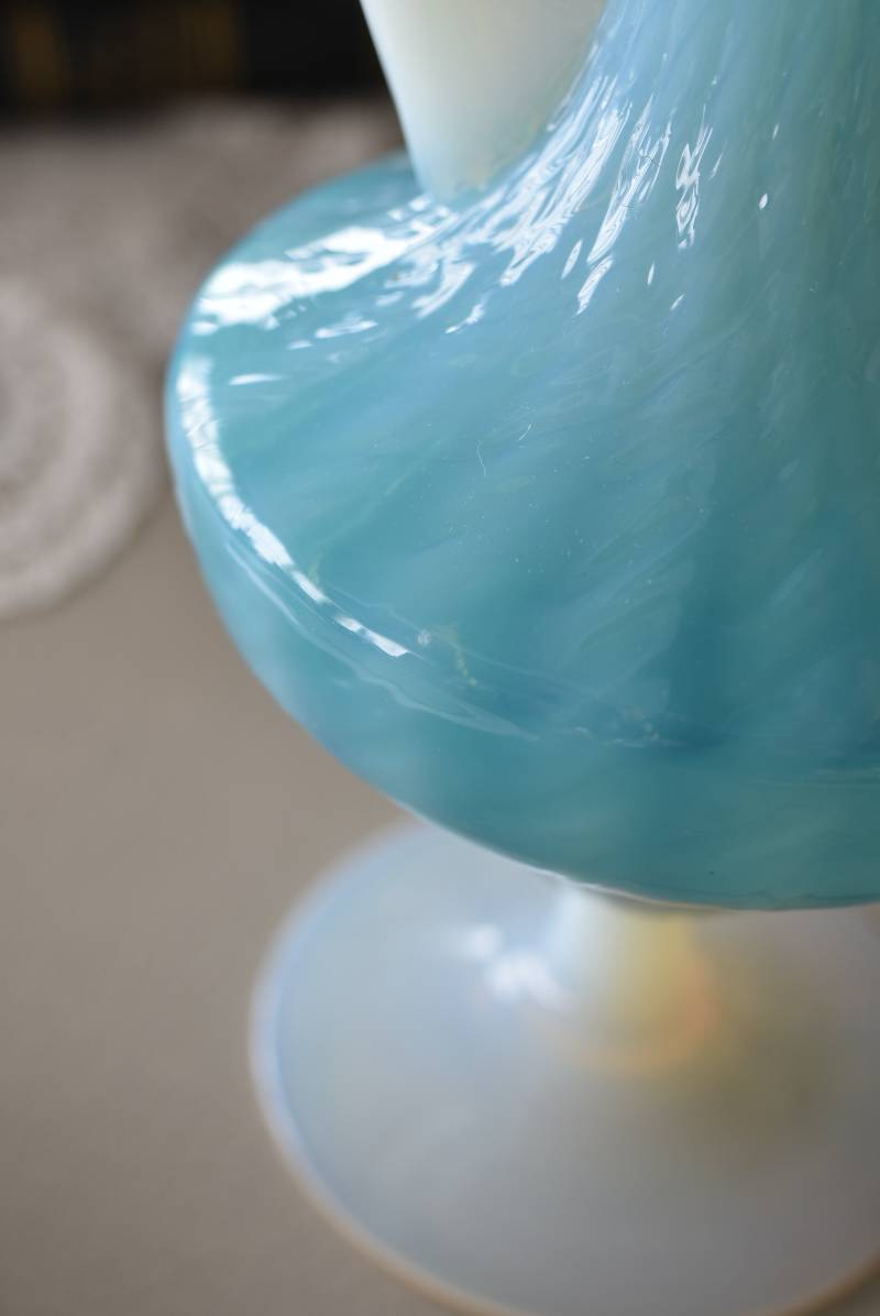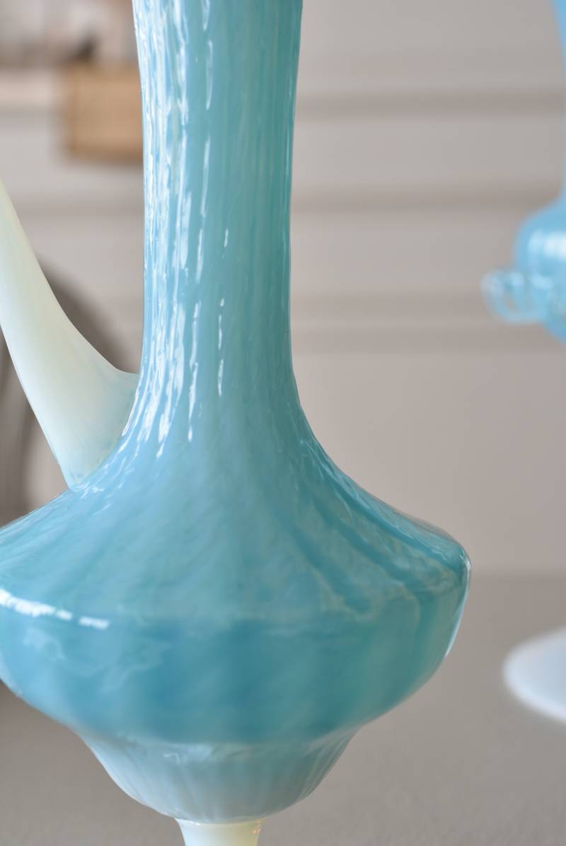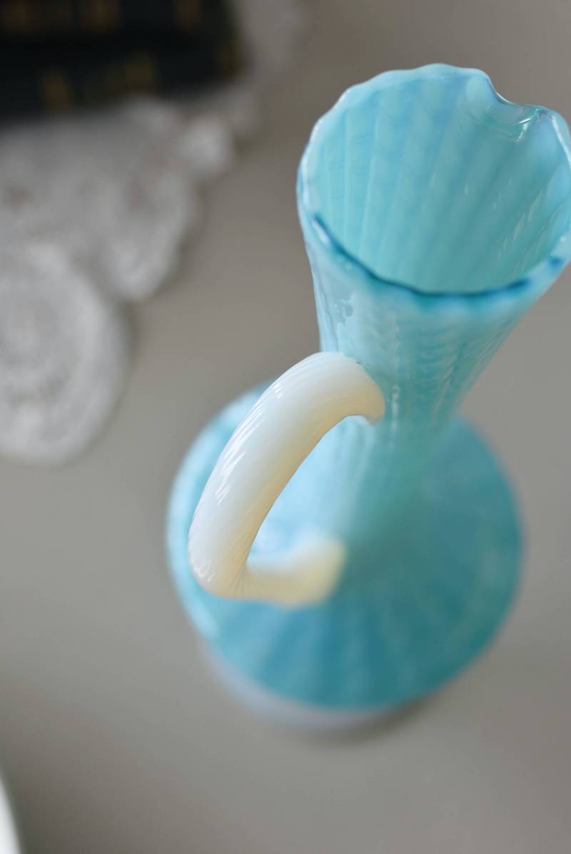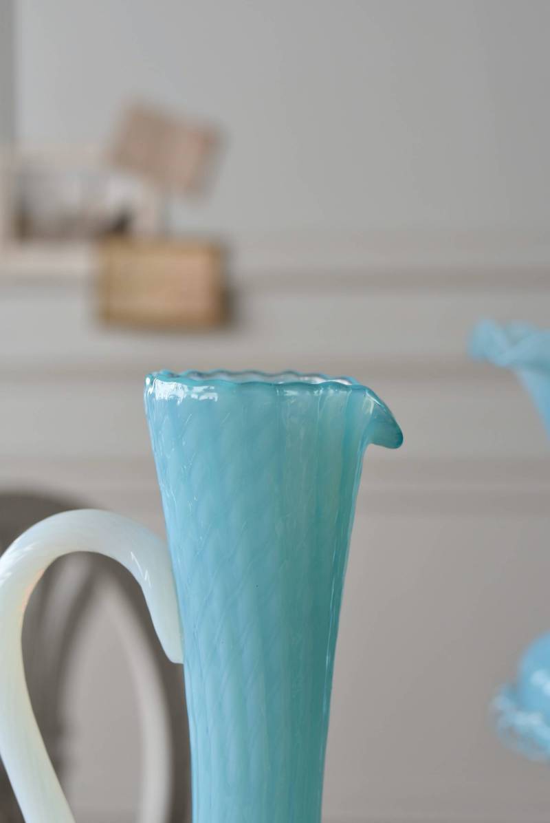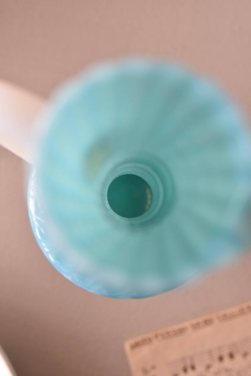 フランスのオパリンガラスフラワーベース。 涼やかなスカイブルーと柔い乳白色のバイカラーが特徴で、どこか優しげな印象の佇まい。光に透かすと独自の光彩が楽しめるオパリンガラス製で、まるで水面のような揺らぎを生み出すボディの質感がより幻想的なデザインとなっています。ちょこんと小さな注ぎ口やしなやかな曲線のハンドル、美しいグラデーションがかかった脚元など、そのまま置いておくだけでも絵になるこだわりたっぷりの一品に。 水を入れて生花を飾ったり、ドライフラワーなどをさしてディスプレイとしても独自の雰囲気を楽しめる可愛らしいアイテムです。 W 約11cm D 約9.5cm H 約24.5cm 口径 約4cm