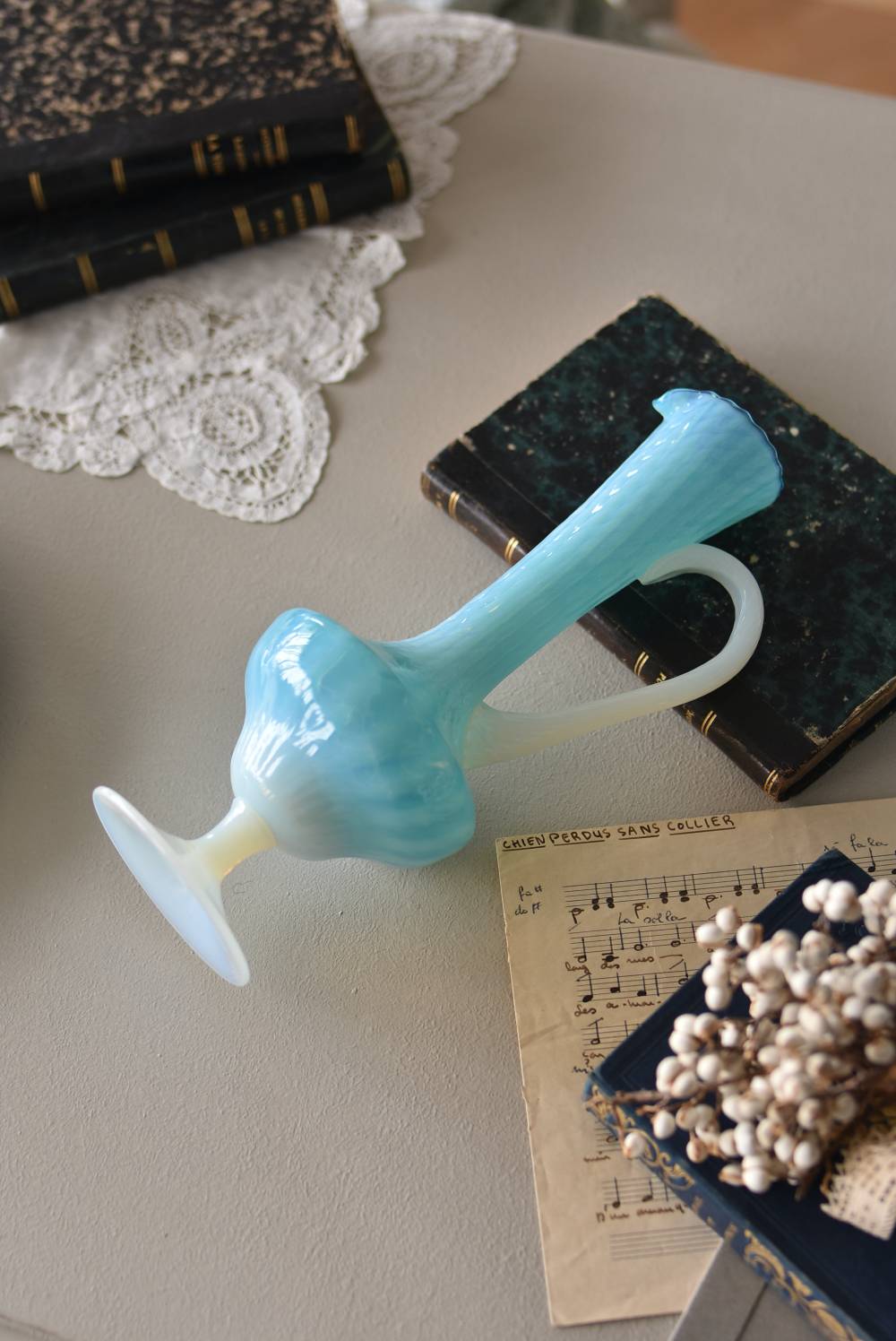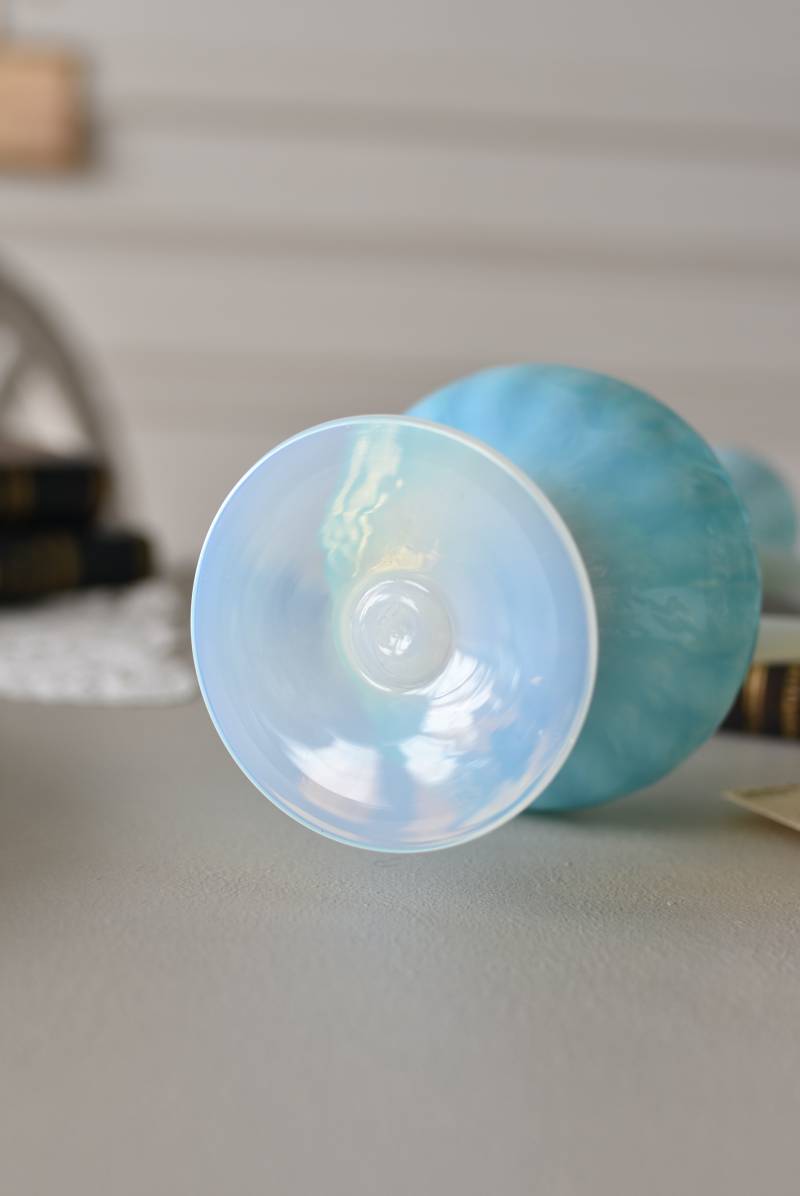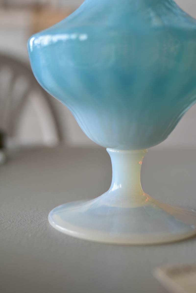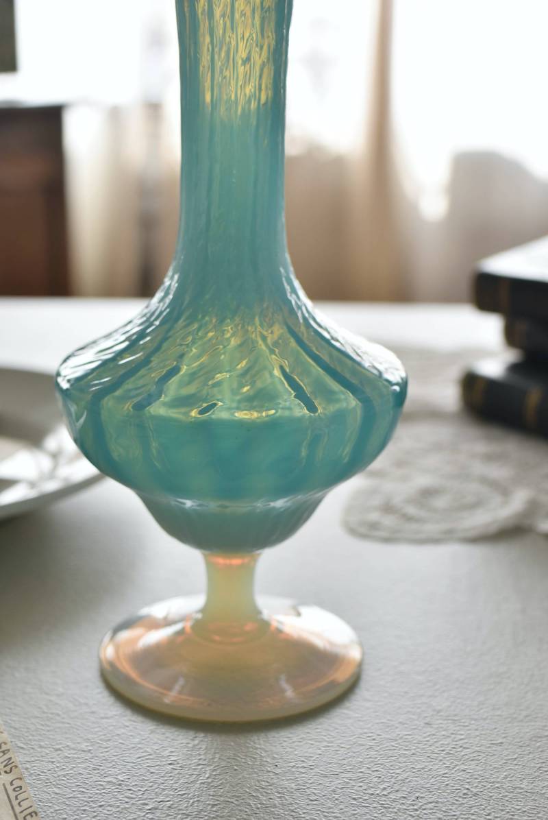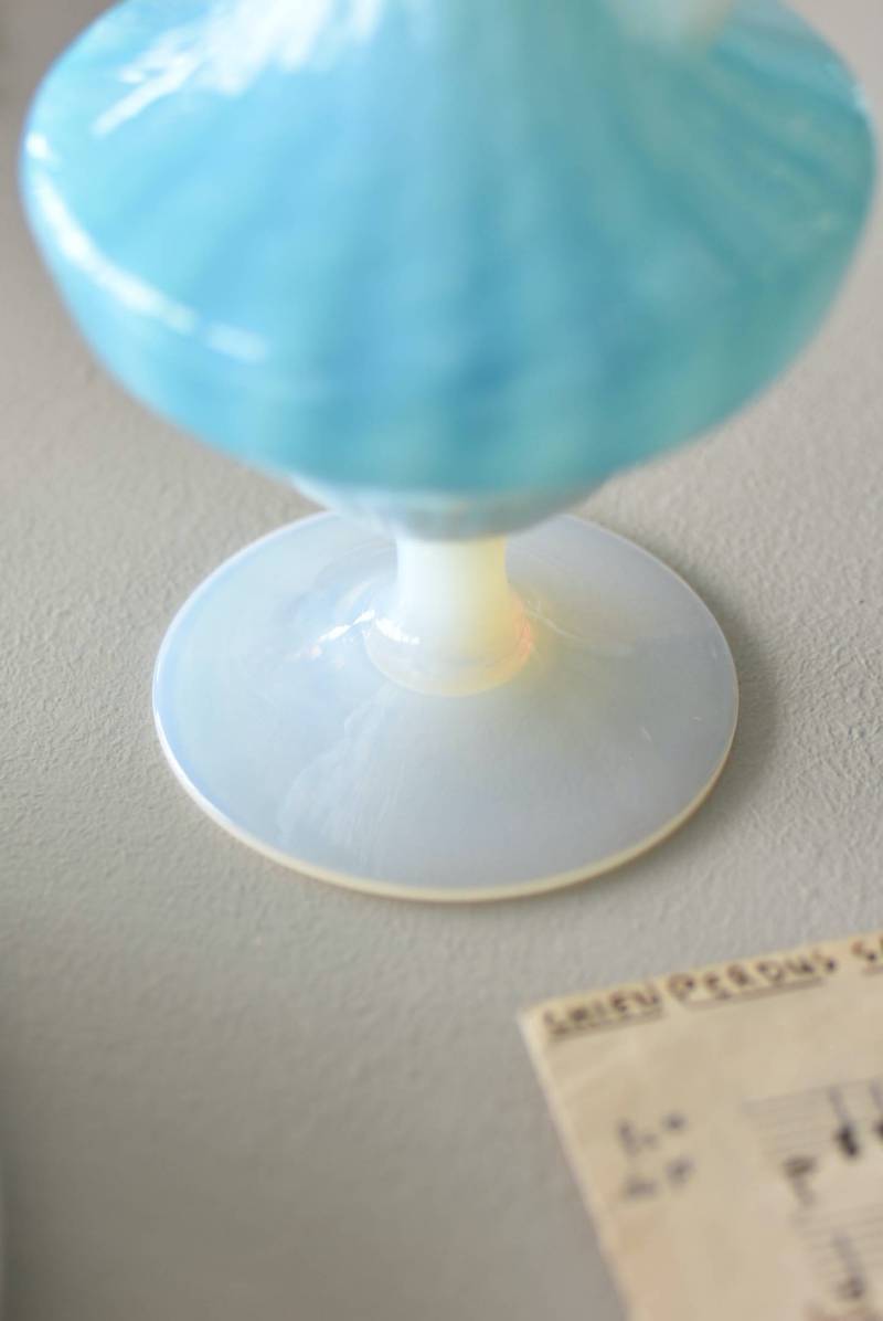 フランスのオパリンガラスフラワーベース。 涼やかなスカイブルーと柔い乳白色のバイカラーが特徴で、どこか優しげな印象の佇まい。光に透かすと独自の光彩が楽しめるオパリンガラス製で、まるで水面のような揺らぎを生み出すボディの質感がより幻想的なデザインとなっています。ちょこんと小さな注ぎ口やしなやかな曲線のハンドル、美しいグラデーションがかかった脚元など、そのまま置いておくだけでも絵になるこだわりたっぷりの一品に。 水を入れて生花を飾ったり、ドライフラワーなどをさしてディスプレイとしても独自の雰囲気を楽しめる可愛らしいアイテムです。 W 約11cm D 約9.5cm H 約24.5cm 口径 約4cm