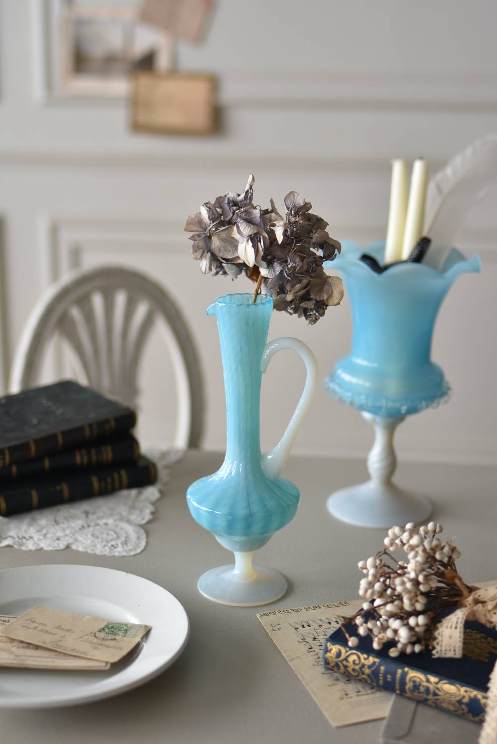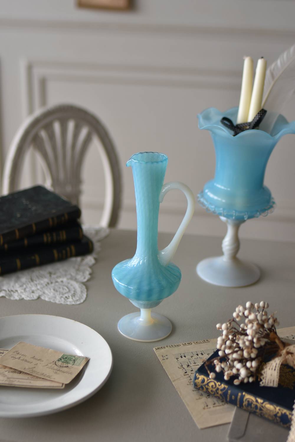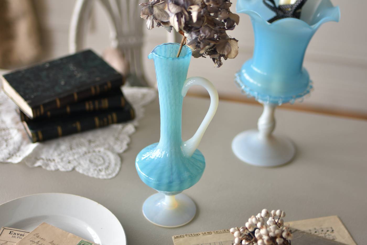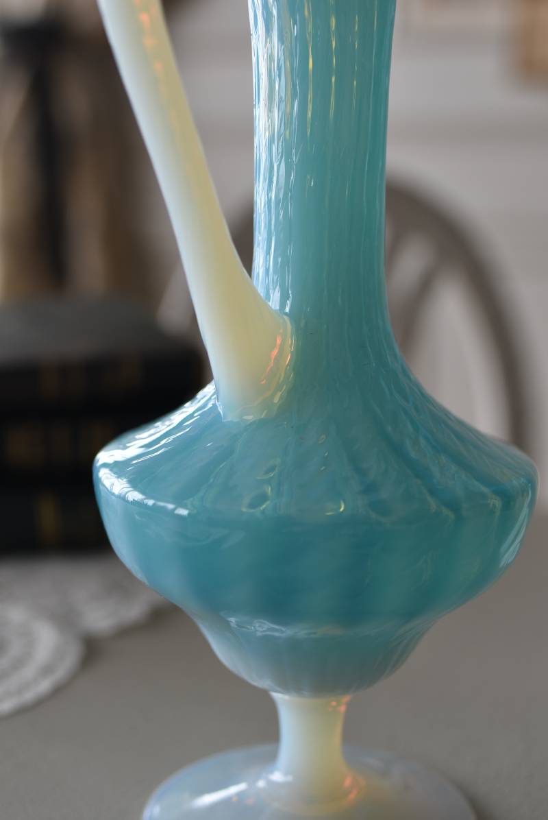 フランスのオパリンガラスフラワーベース。 涼やかなスカイブルーと柔い乳白色のバイカラーが特徴で、どこか優しげな印象の佇まい。光に透かすと独自の光彩が楽しめるオパリンガラス製で、まるで水面のような揺らぎを生み出すボディの質感がより幻想的なデザインとなっています。ちょこんと小さな注ぎ口やしなやかな曲線のハンドル、美しいグラデーションがかかった脚元など、そのまま置いておくだけでも絵になるこだわりたっぷりの一品に。 水を入れて生花を飾ったり、ドライフラワーなどをさしてディスプレイとしても独自の雰囲気を楽しめる可愛らしいアイテムです。 W 約11cm D 約9.5cm H 約24.5cm 口径 約4cm