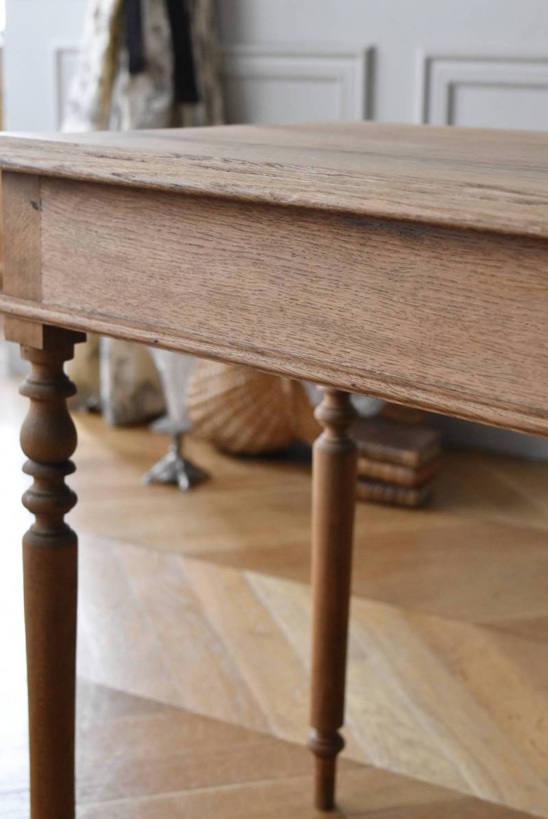 凹凸のある豊かなデザインと丸みのある筒型の脚がすらりと伸び、エレガントさを纏った姿で、剥離された表情は素朴で使い込まれた風合いも楽しめます。明るめの木肌によってどんなテイストのお部屋にも合わせやすく、天板の角は少し丸みのある形状となっており、さりげなくも丁寧な細工が施された優しげな雰囲気を演出してくれそうです。
