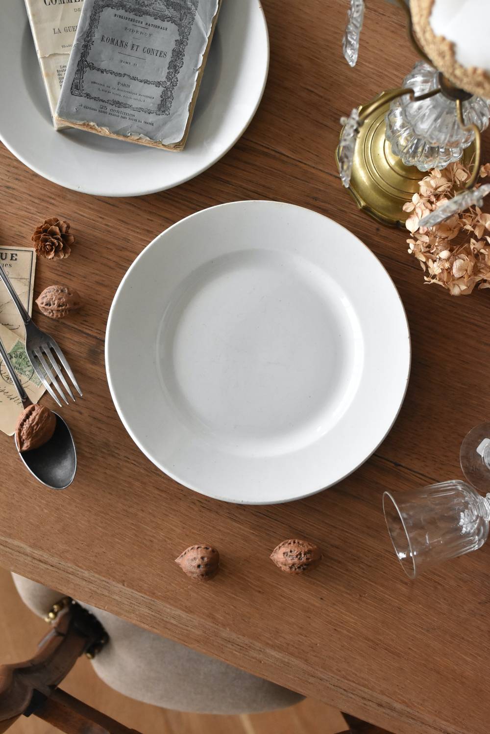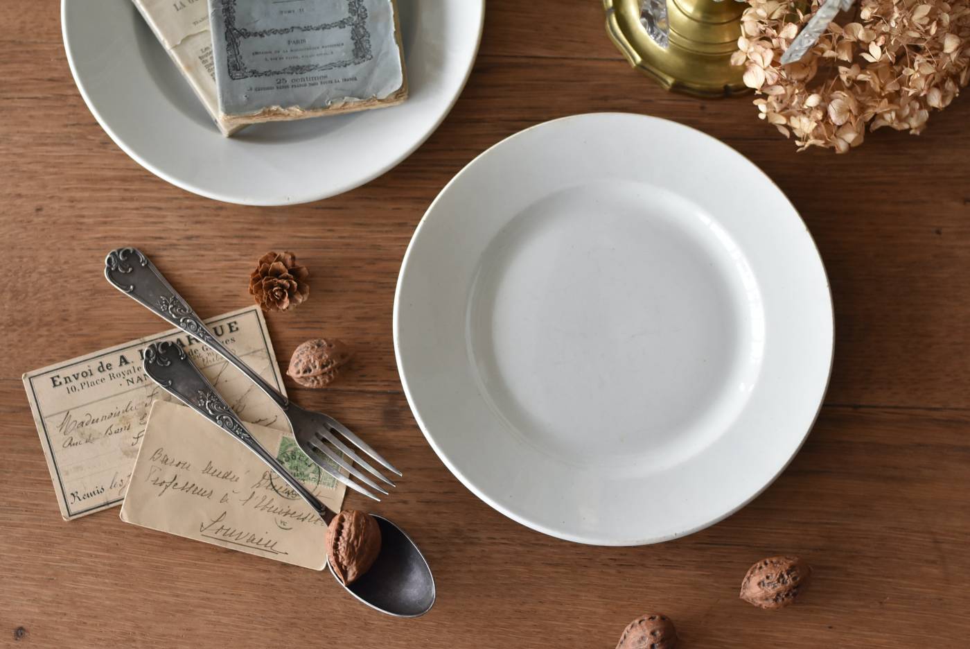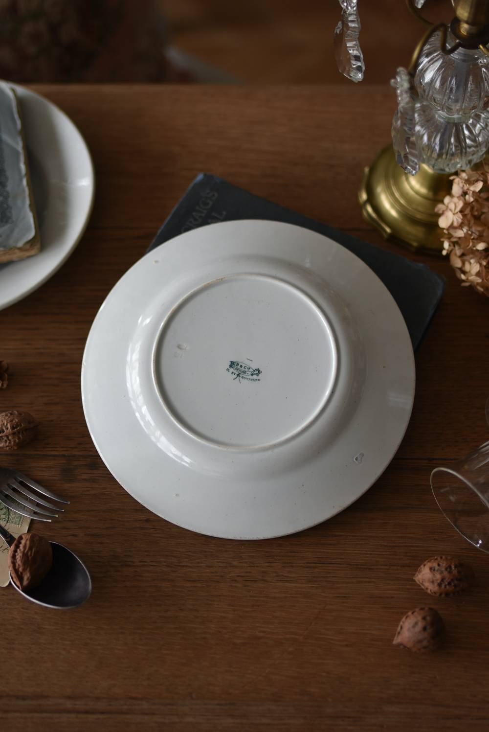 フランス・Creil et Montereau(クレイユ エ モントロー)の平皿。 ほんのり青みがかったような独特の白釉が特徴で、柔らかな光沢と使い込まれた陶器の質感が魅力的。余計な装飾を削ぎ落としたミニマルな姿で、やや幅広のリムが中央に乗せたアイテムを額縁のように引き立ててくれるデザインです。 裏面には”Creil et Montereau”Barluet & Cie(バリュエ社)の刻印がしっかりと刻まれた一品に。 同じデザインのラウンドプレートと揃えてのお使いも素敵で、食卓に静かな品格を添えてくれる上品な装いのアイテムです。 直径 約21cm H 約2.5cm 見込み 約12.5cm