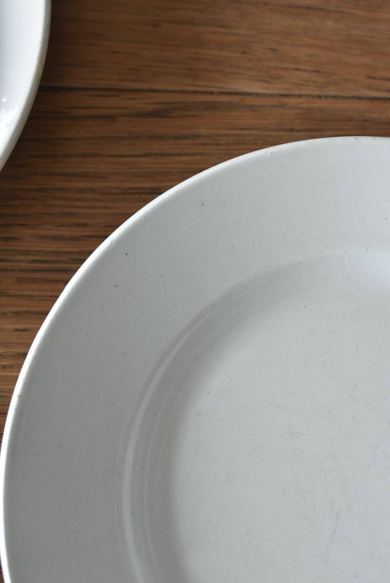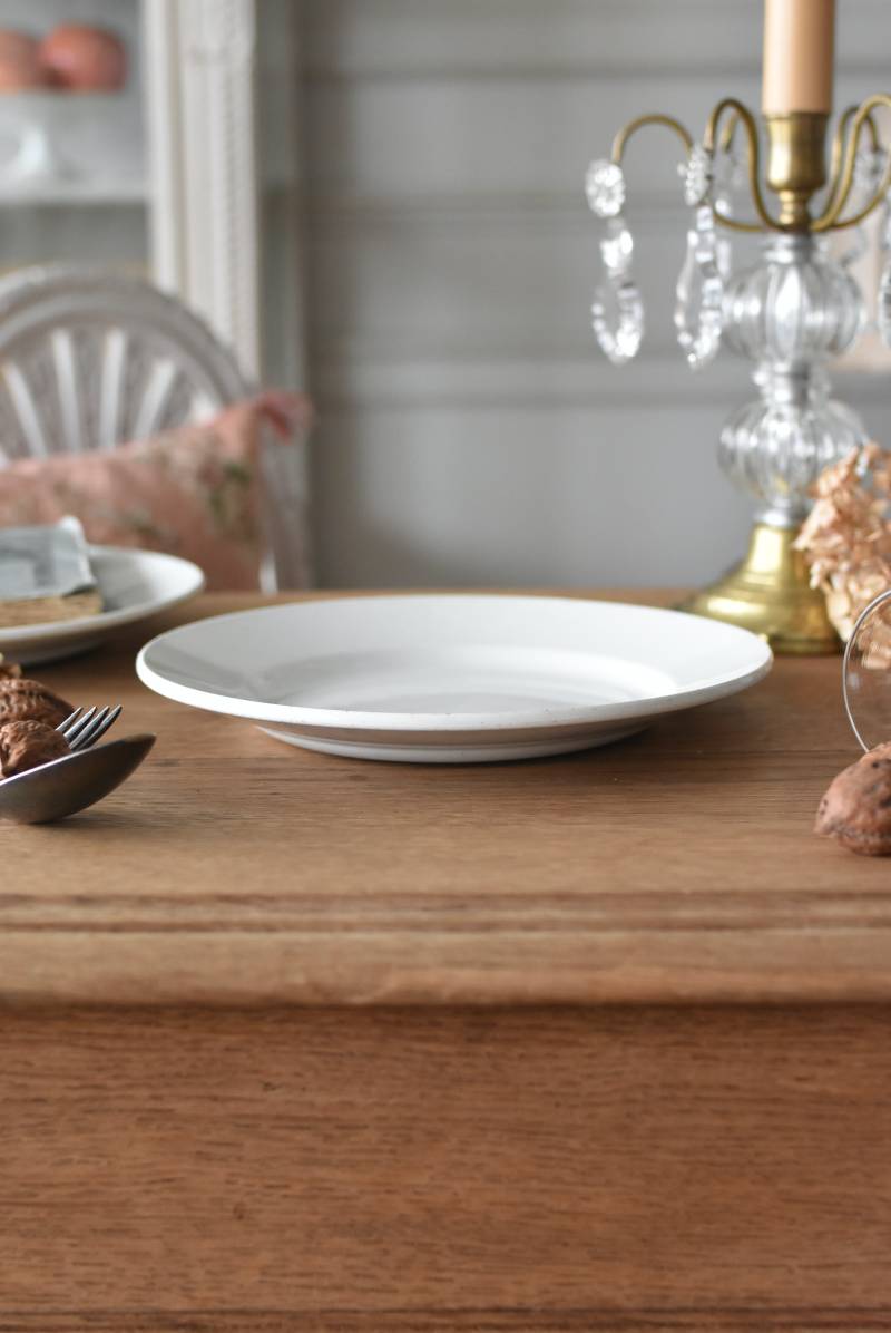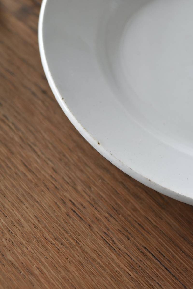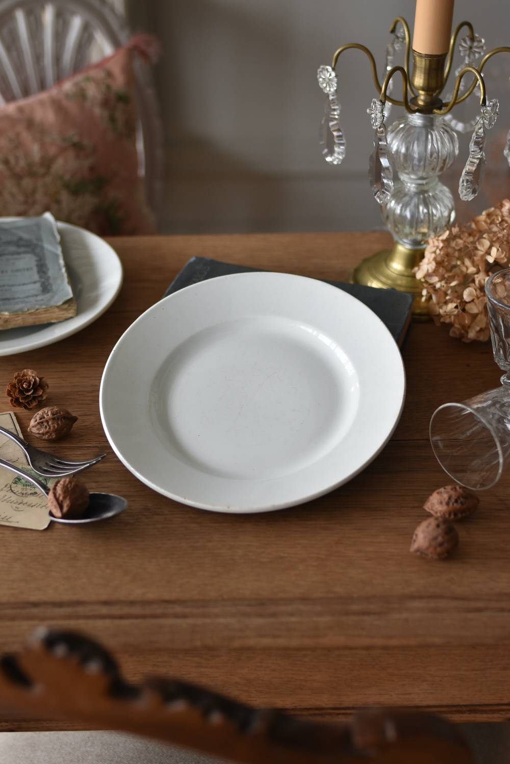 フランス・Creil et Montereau(クレイユ エ モントロー)の平皿。 ほんのり青みがかったような独特の白釉が特徴で、柔らかな光沢と使い込まれた陶器の質感が魅力的。余計な装飾を削ぎ落としたミニマルな姿で、やや幅広のリムが中央に乗せたアイテムを額縁のように引き立ててくれるデザインです。 裏面には”Creil et Montereau”Barluet & Cie(バリュエ社)の刻印がしっかりと刻まれた一品に。 同じデザインのラウンドプレートと揃えてのお使いも素敵で、食卓に静かな品格を添えてくれる上品な装いのアイテムです。 直径 約21cm H 約2.5cm 見込み 約12.5cm