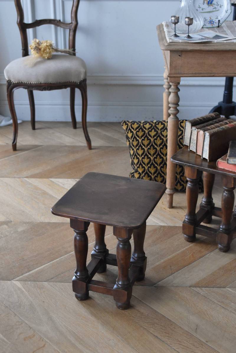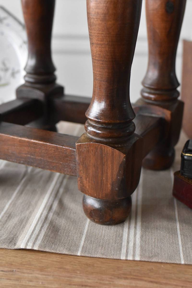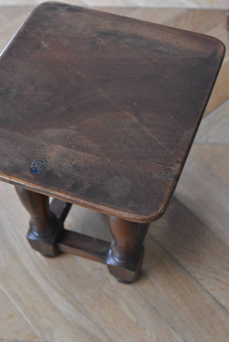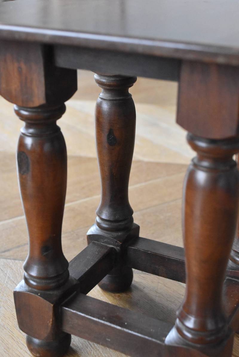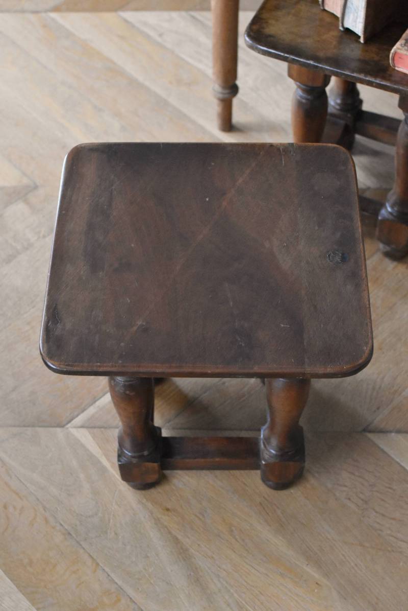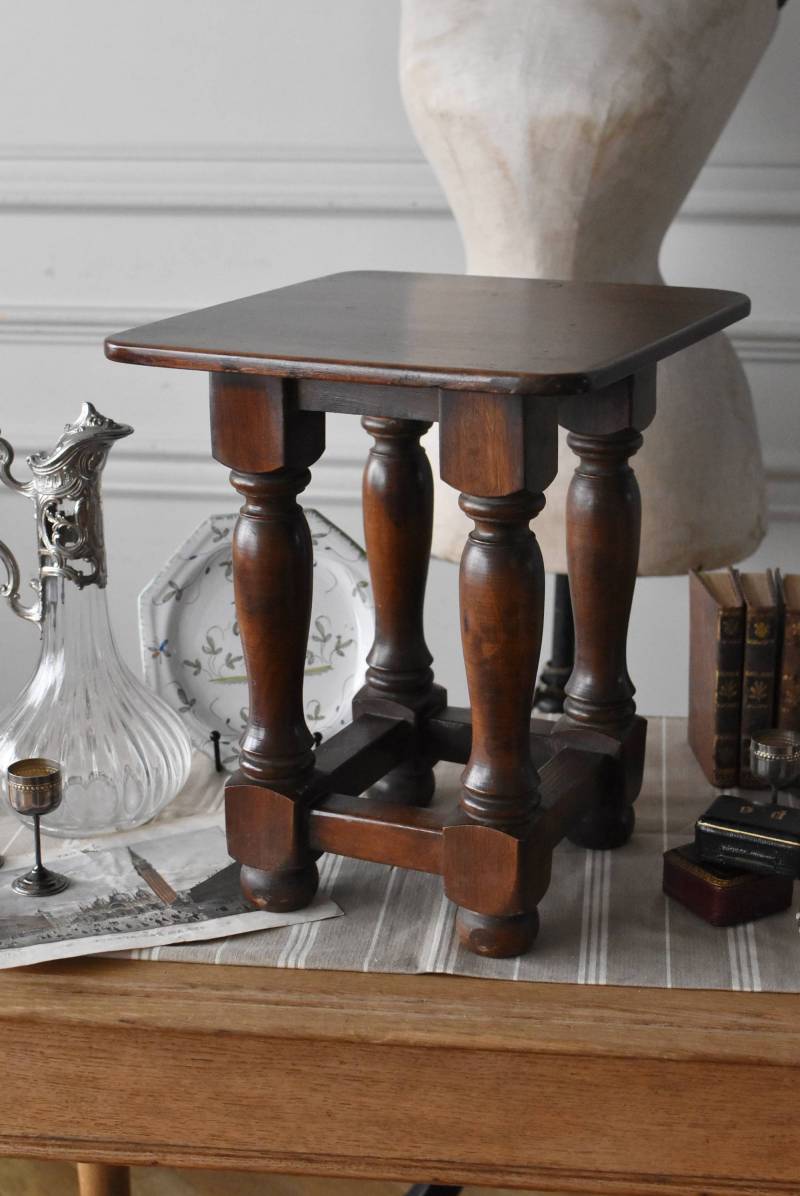 フランスのウッドスツール。 ぽってりとした丸みのある脚は、角張った貫で囲まれ安定感のある作りとなっています。くびれのあるしなやかな形状が優しげな雰囲気を演出してくれ、お部屋にそっと馴染んでくれそうな姿です。深みのあるブラウンカラーに滑らかな質感で程よい重厚感をもたらし、角に丸みをつけた丁寧な作りがぬくもりを感じさせてくれます。 花器やオブジェ、本などを置いてのディスプレイにも活躍し、お部屋のコーナーや卓上など幅広くご使用いただけます。それぞれでの販売となり若干の状態が異なりますが、同じデザインのウッドスツールがあり、シンメトリーに配置するのもおすすめです。 W 約32cm D 約30cm H 約36.5cm 脚 W約22.5cm×D約20cm