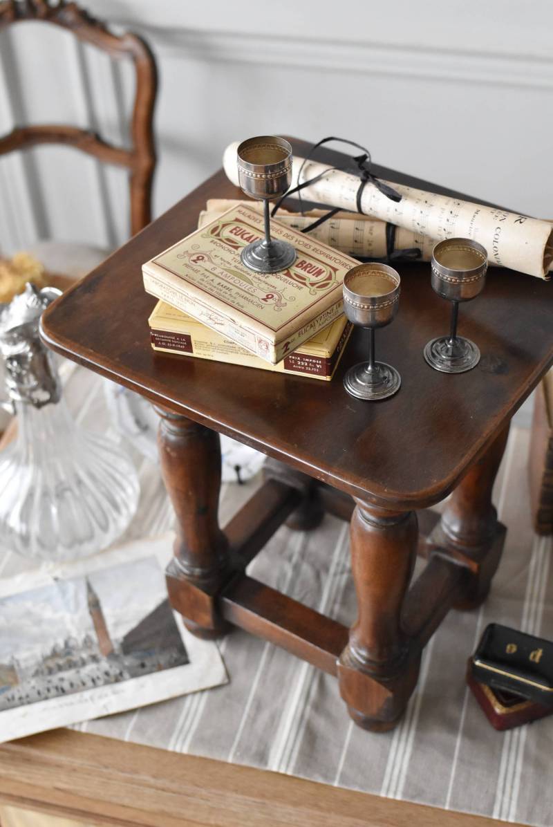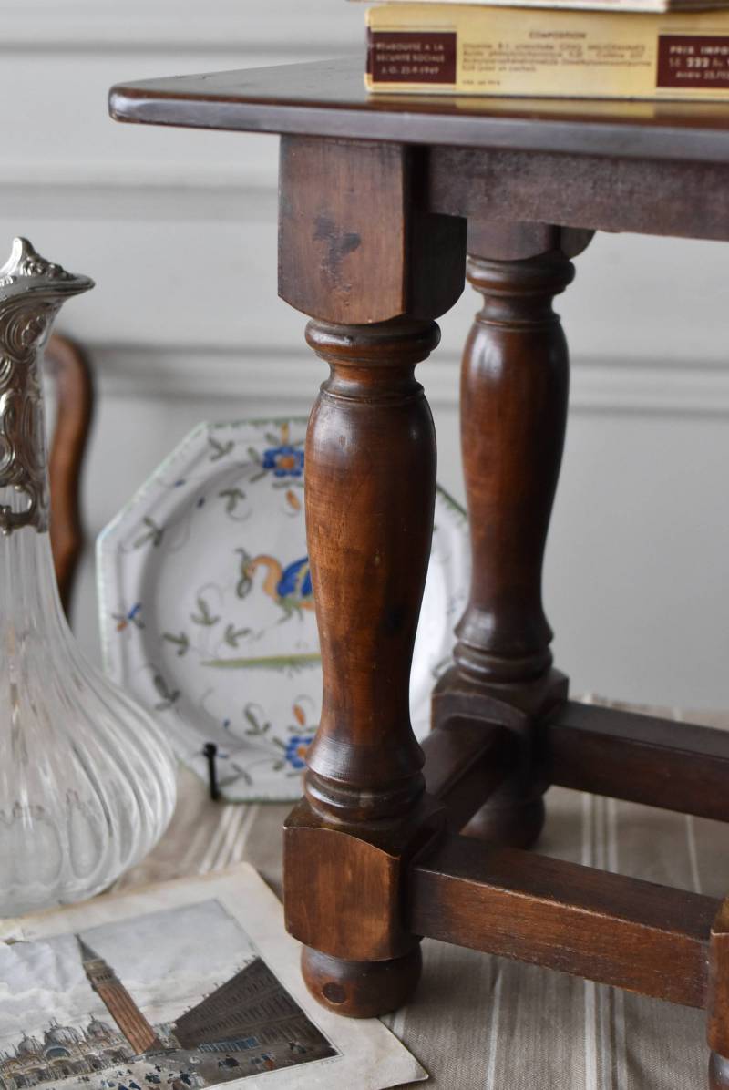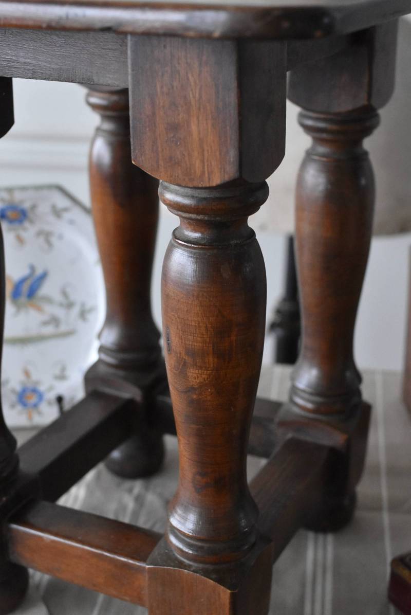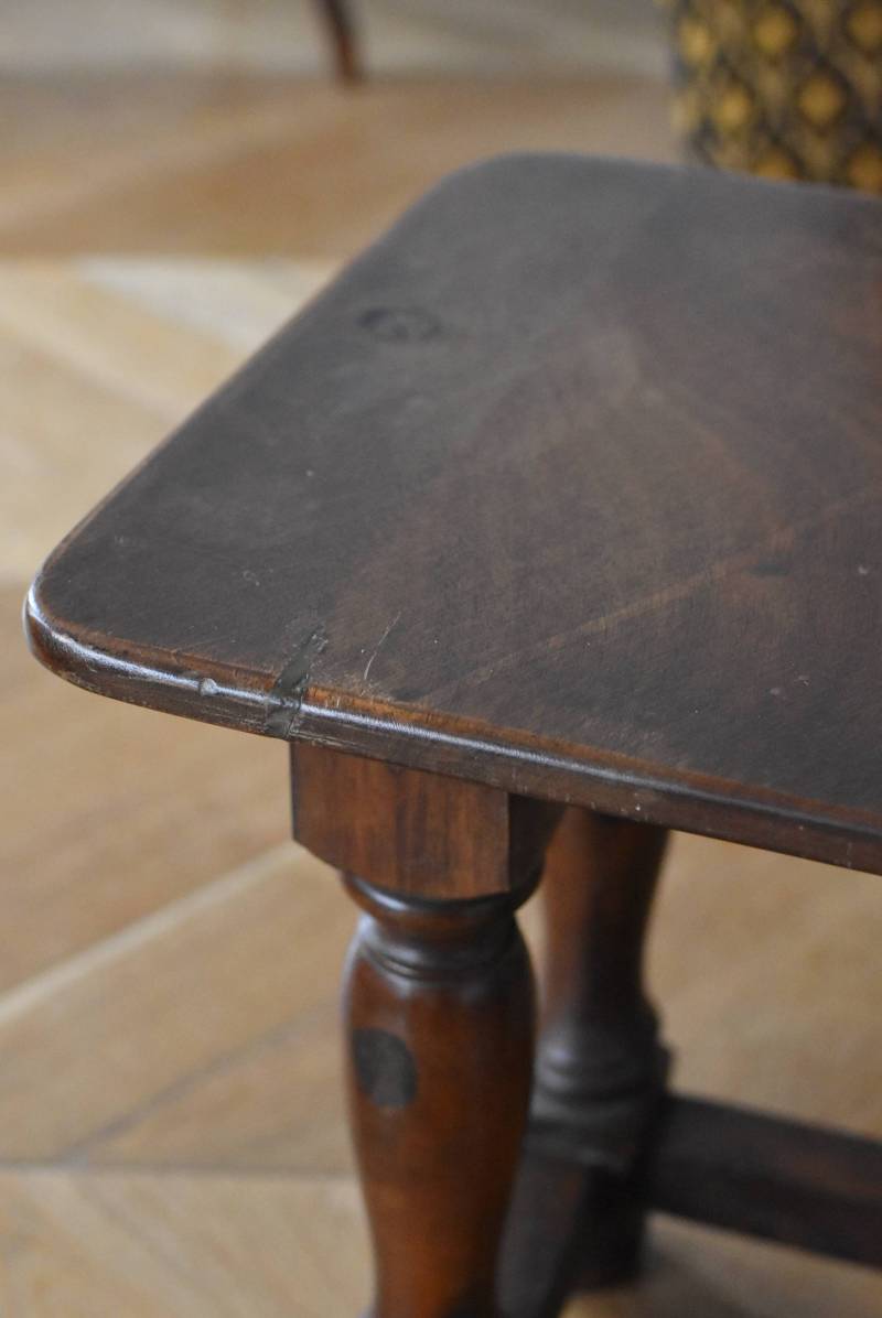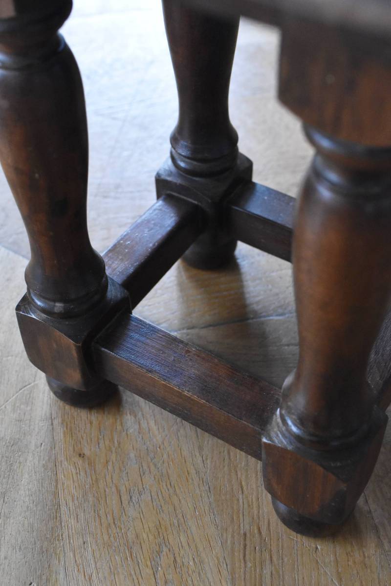 フランスのウッドスツール。 ぽってりとした丸みのある脚は、角張った貫で囲まれ安定感のある作りとなっています。くびれのあるしなやかな形状が優しげな雰囲気を演出してくれ、お部屋にそっと馴染んでくれそうな姿です。深みのあるブラウンカラーに滑らかな質感で程よい重厚感をもたらし、角に丸みをつけた丁寧な作りがぬくもりを感じさせてくれます。 花器やオブジェ、本などを置いてのディスプレイにも活躍し、お部屋のコーナーや卓上など幅広くご使用いただけます。それぞれでの販売となり若干の状態が異なりますが、同じデザインのウッドスツールがあり、シンメトリーに配置するのもおすすめです。 W 約32cm D 約30cm H 約36.5cm 脚 W約22.5cm×D約20cm