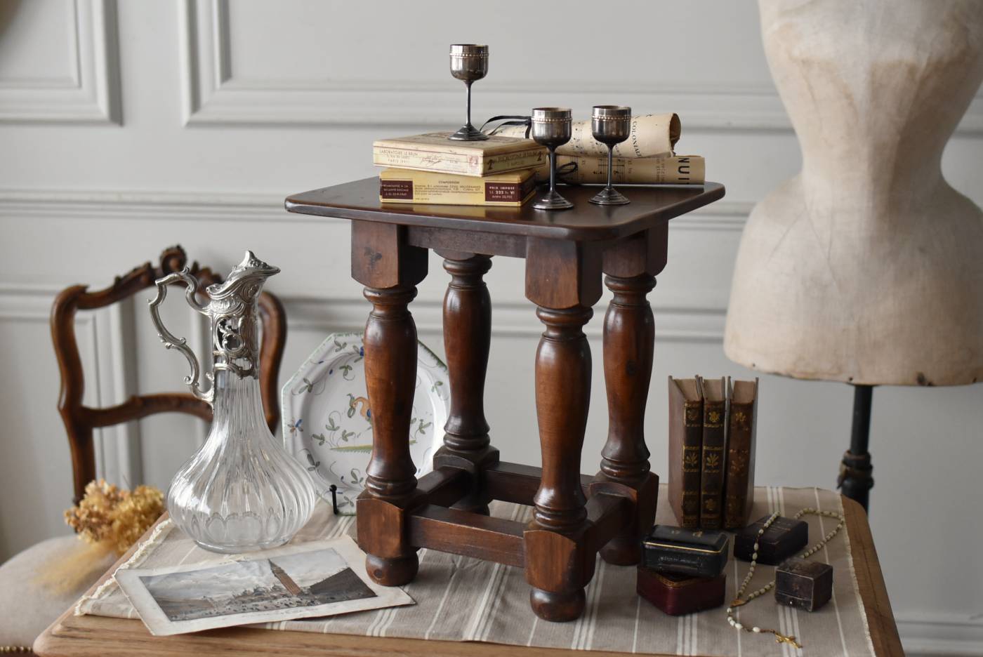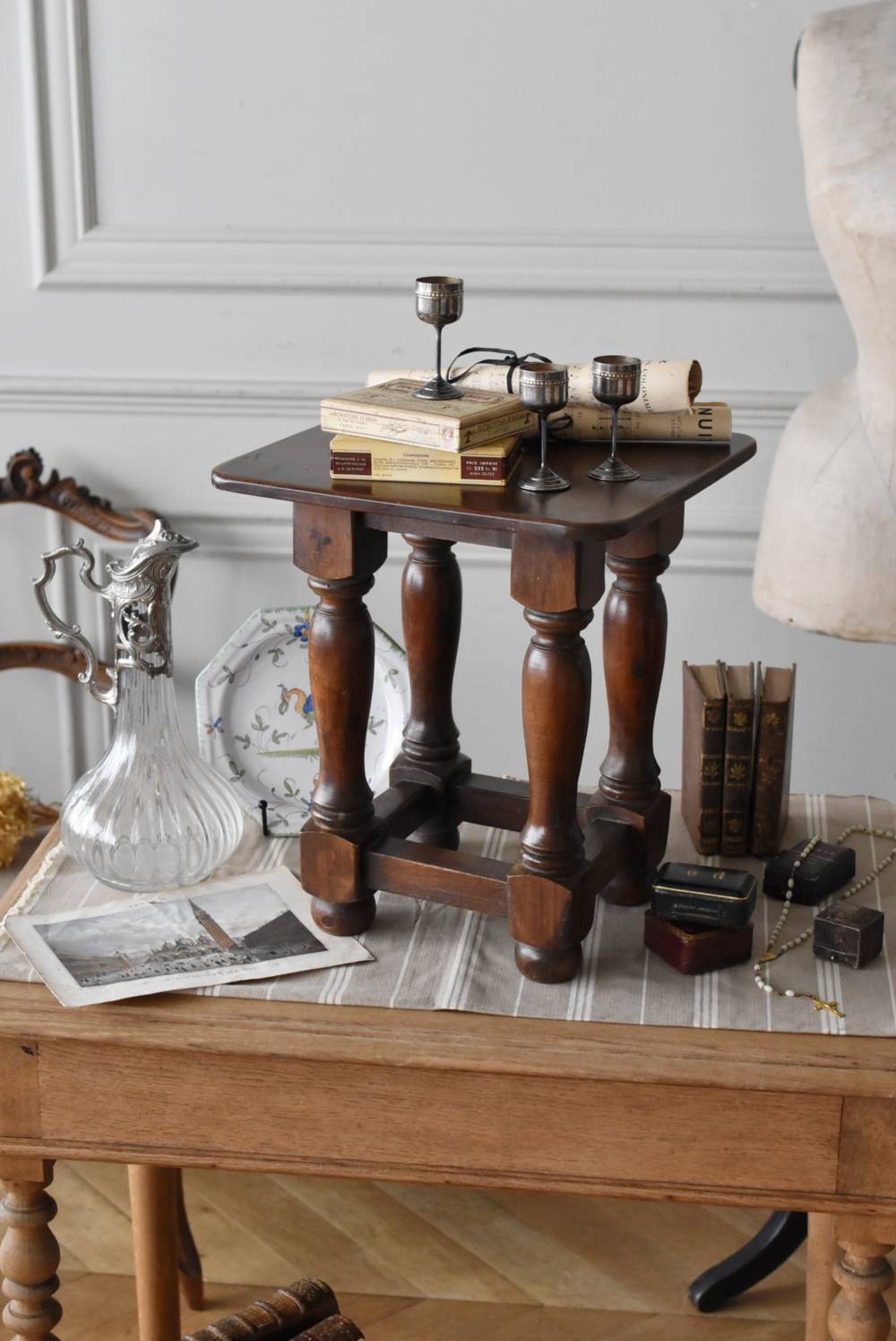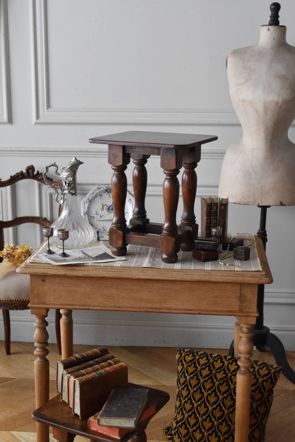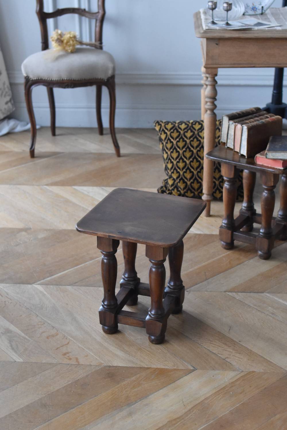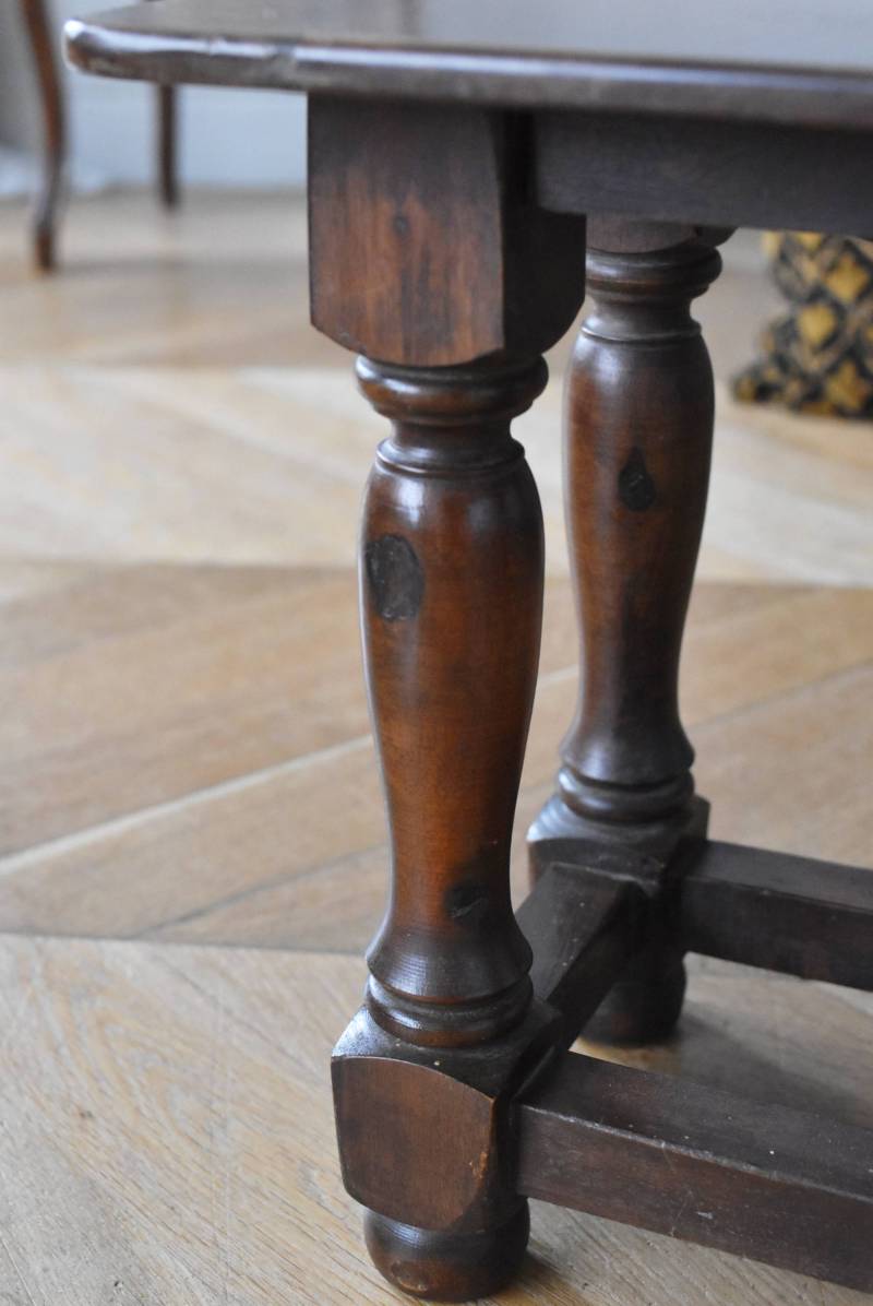 フランスのウッドスツール。 ぽってりとした丸みのある脚は、角張った貫で囲まれ安定感のある作りとなっています。くびれのあるしなやかな形状が優しげな雰囲気を演出してくれ、お部屋にそっと馴染んでくれそうな姿です。深みのあるブラウンカラーに滑らかな質感で程よい重厚感をもたらし、角に丸みをつけた丁寧な作りがぬくもりを感じさせてくれます。 花器やオブジェ、本などを置いてのディスプレイにも活躍し、お部屋のコーナーや卓上など幅広くご使用いただけます。それぞれでの販売となり若干の状態が異なりますが、同じデザインのウッドスツールがあり、シンメトリーに配置するのもおすすめです。 W 約32cm D 約30cm H 約36.5cm 脚 W約22.5cm×D約20cm