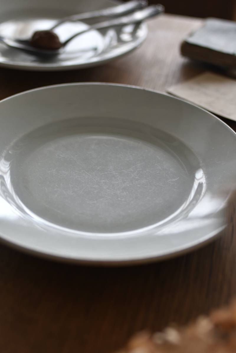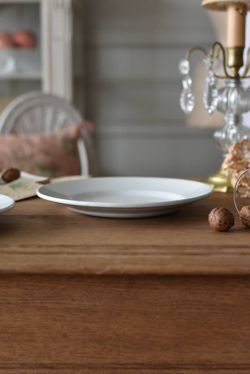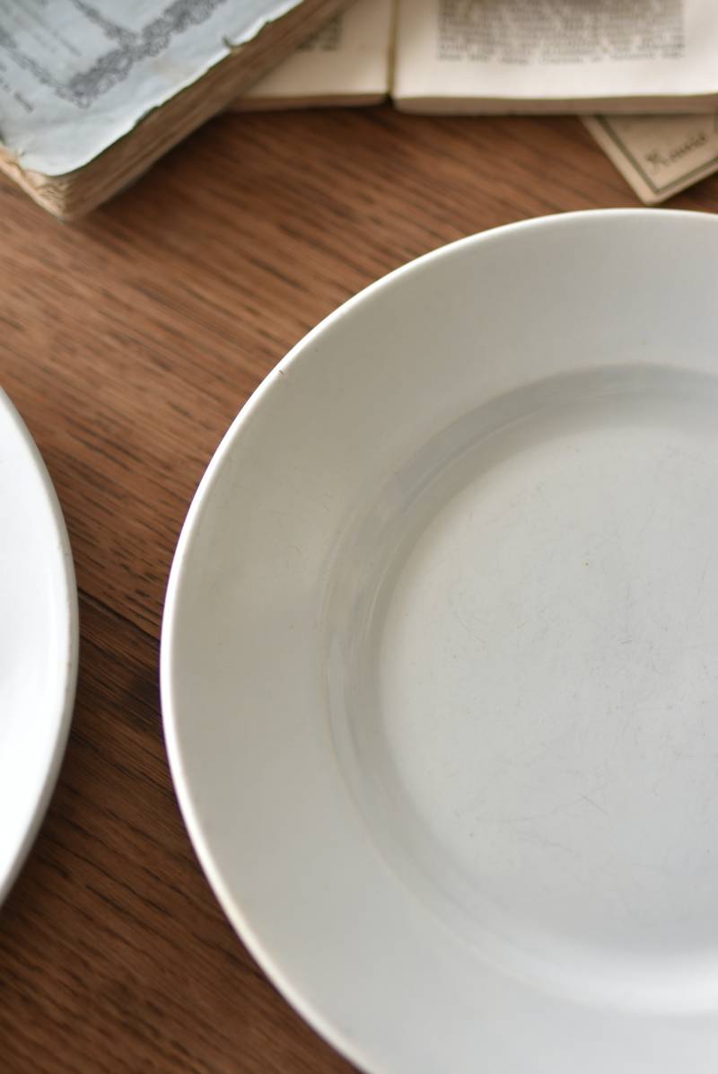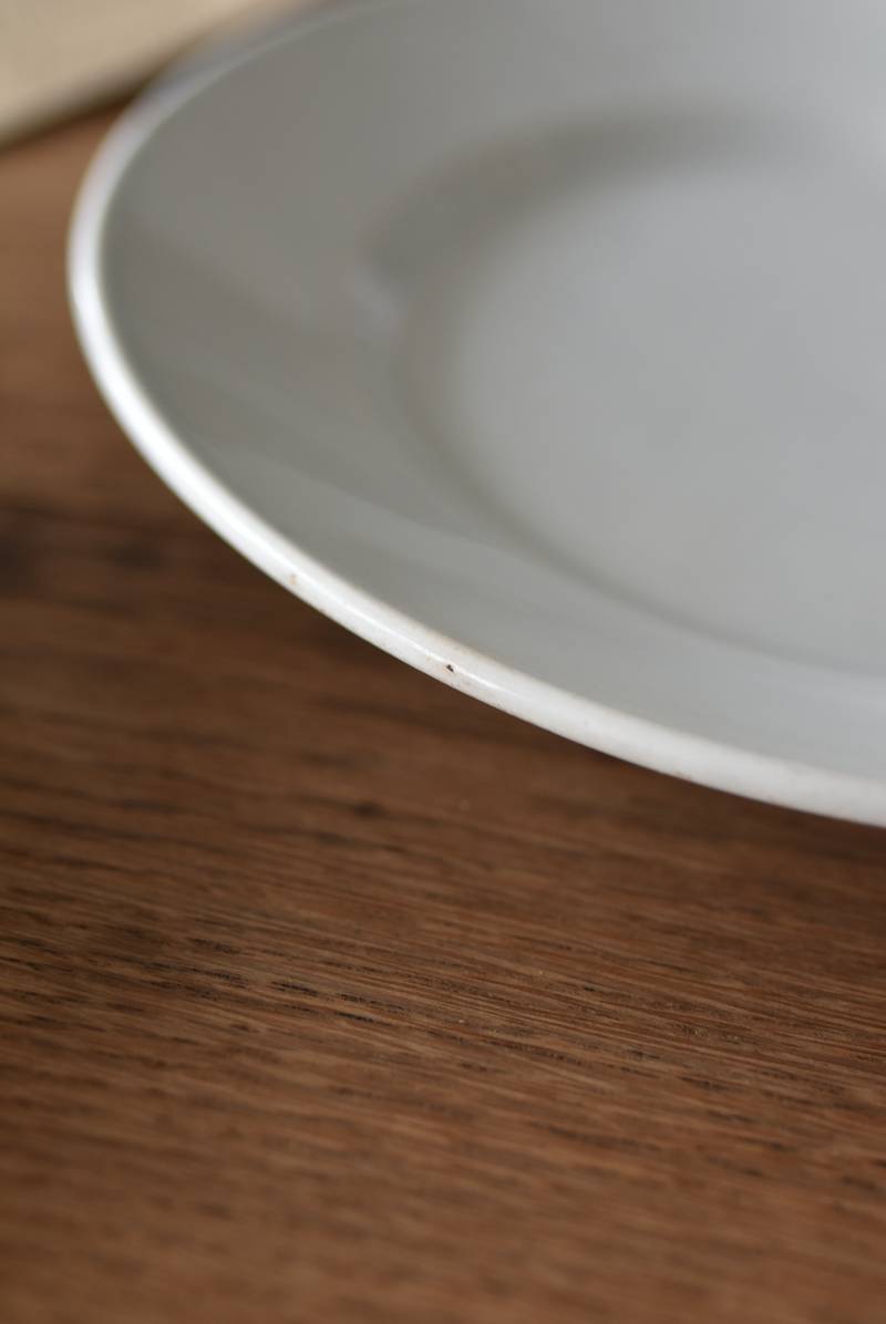 フランス・Creil et Montereau(クレイユ エ モントロー)の平皿。 ほんのり青みがかったような独特の白釉が特徴で、柔らかな光沢と使い込まれた陶器の質感が魅力的。余計な装飾を削ぎ落としたミニマルな姿で、やや幅広のリムが中央に乗せたアイテムを額縁のように引き立ててくれるデザインです。 裏面には”Creil et Montereau”Barluet & Cie(バリュエ社)の刻印がしっかりと刻まれた一品に。 同じデザインのラウンドプレートと揃えてのお使いも素敵で、食卓に静かな品格を添えてくれる上品な装いのアイテムです。 直径 約21cm H 約2.8cm 見込み 約12.5cm