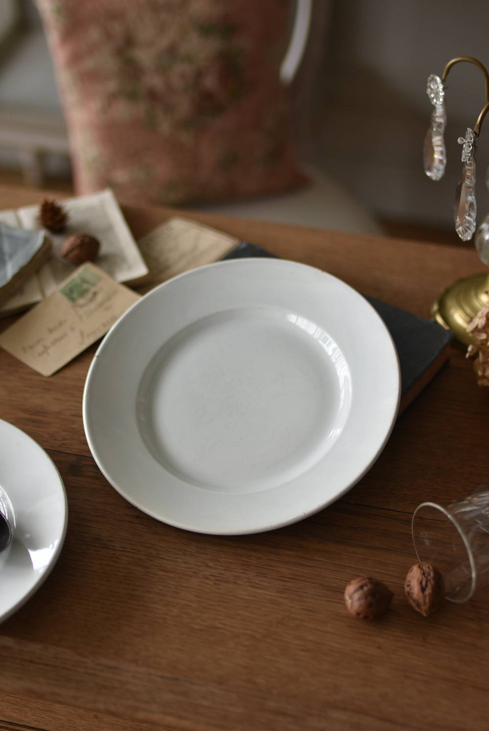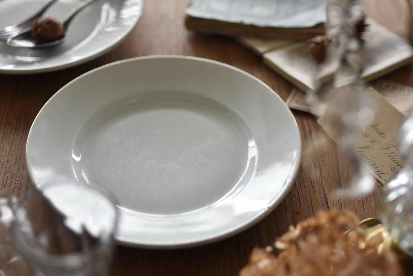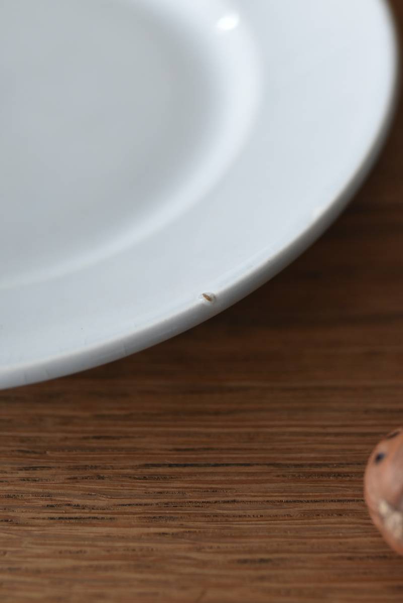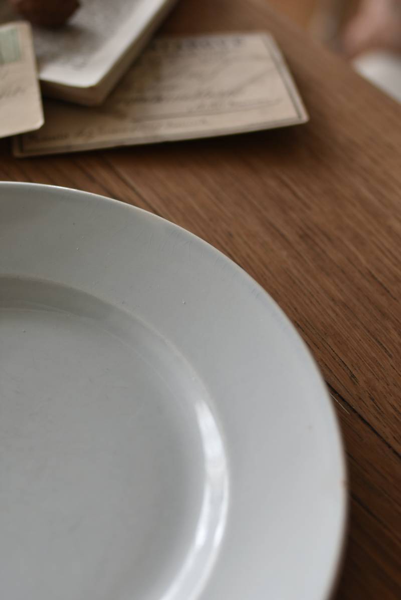 フランス・Creil et Montereau(クレイユ エ モントロー)の平皿。 ほんのり青みがかったような独特の白釉が特徴で、柔らかな光沢と使い込まれた陶器の質感が魅力的。余計な装飾を削ぎ落としたミニマルな姿で、やや幅広のリムが中央に乗せたアイテムを額縁のように引き立ててくれるデザインです。 裏面には”Creil et Montereau”Barluet & Cie(バリュエ社)の刻印がしっかりと刻まれた一品に。 同じデザインのラウンドプレートと揃えてのお使いも素敵で、食卓に静かな品格を添えてくれる上品な装いのアイテムです。 直径 約21cm H 約2.8cm 見込み 約12.5cm