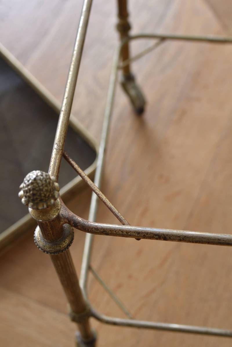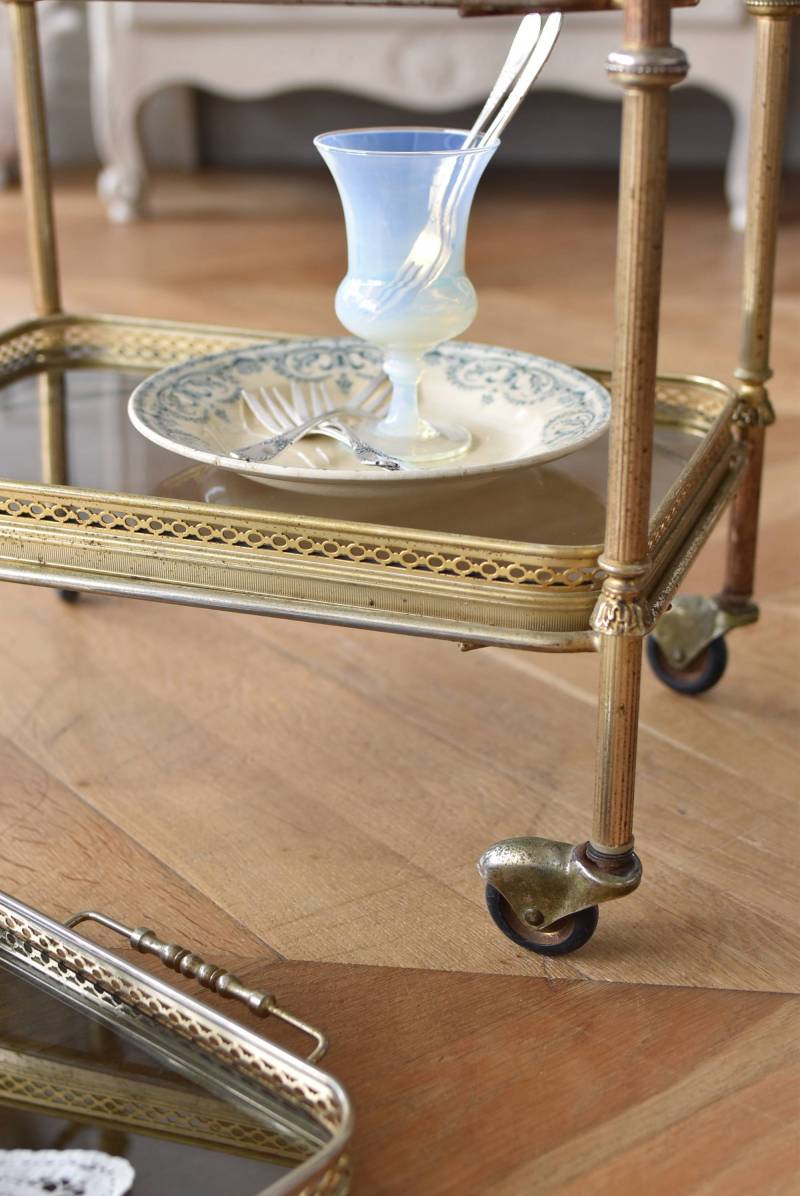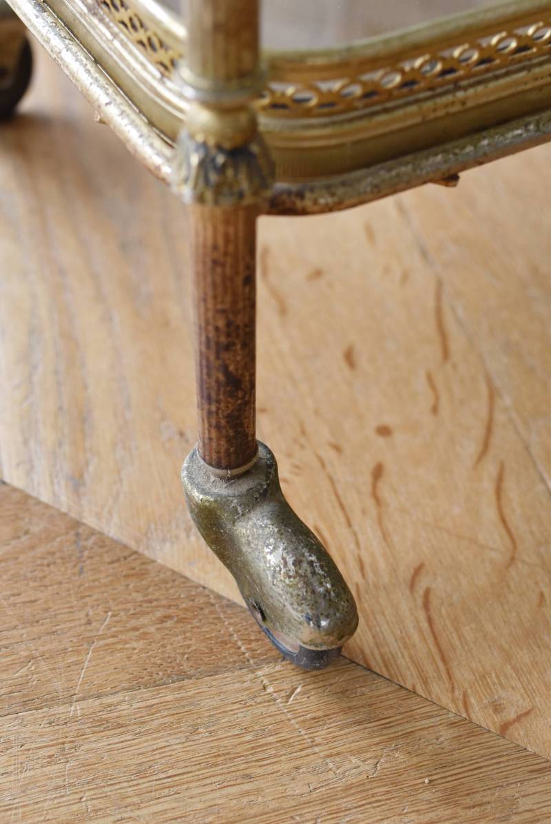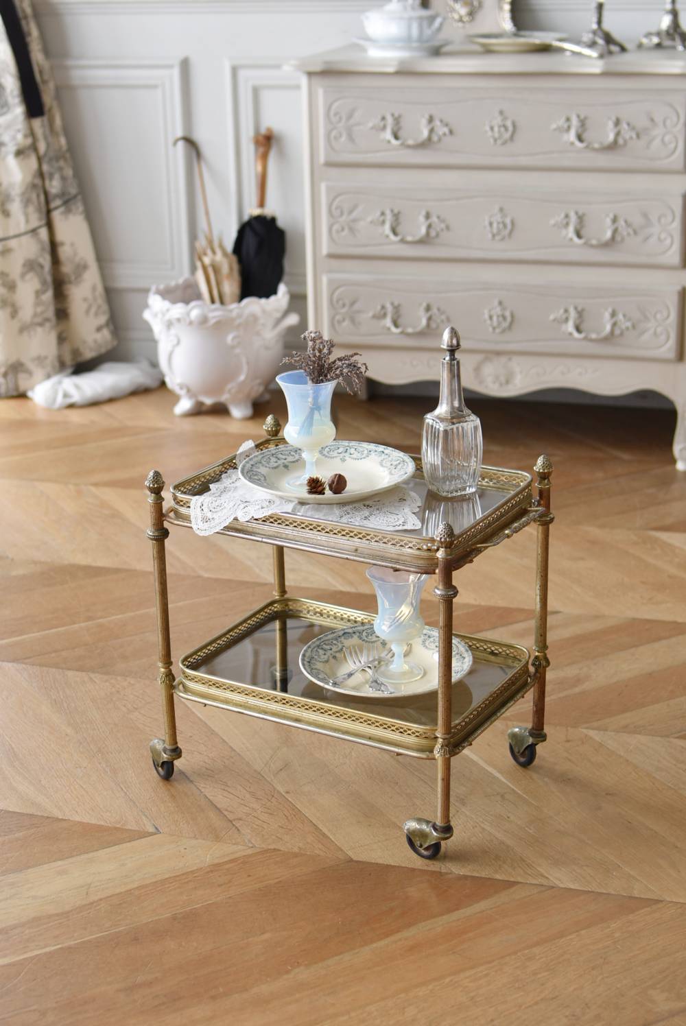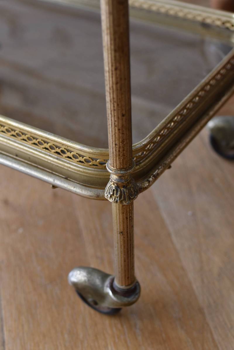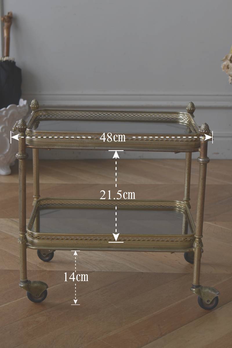 現在もスムーズに動いてくれるキャスターがついた愛くるしい姿は卓上に置いてもバランスが良く、ディスプレイしても存在感を放ってくれます。トレイ側面までもくり抜かれた幾何学的模様に目を惹き、経年によるくすんだゴールドカラーが個性的ながらも上品な雰囲気を演出してくれます。 W 約48cm