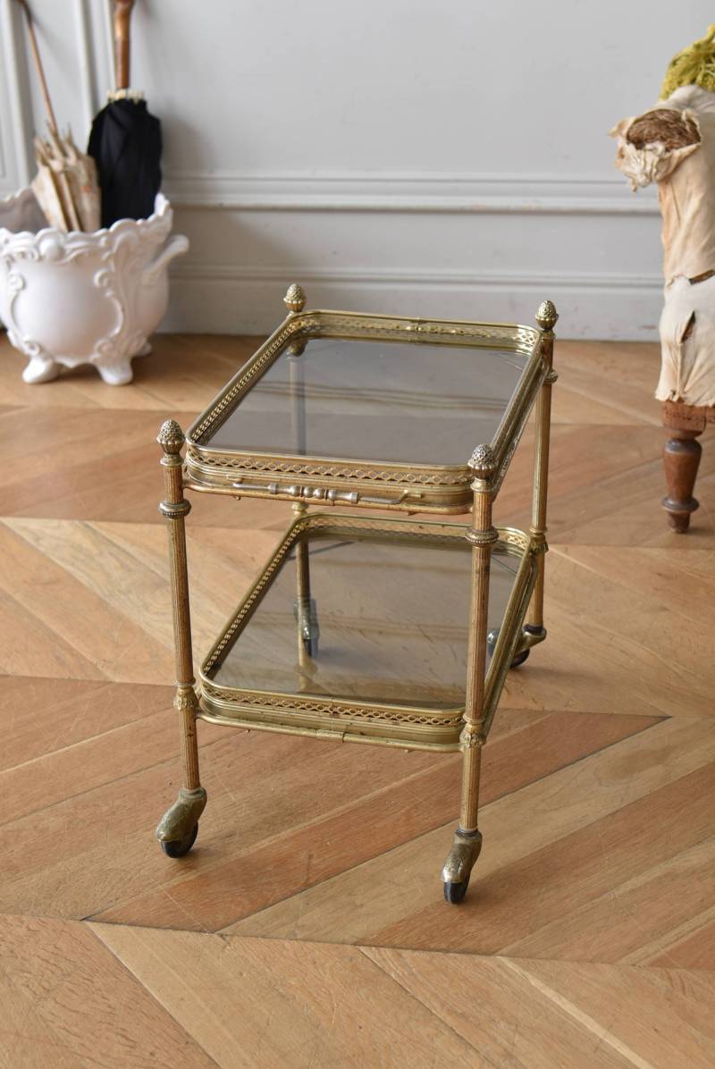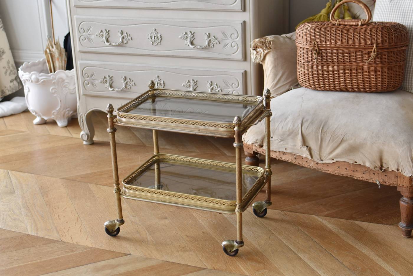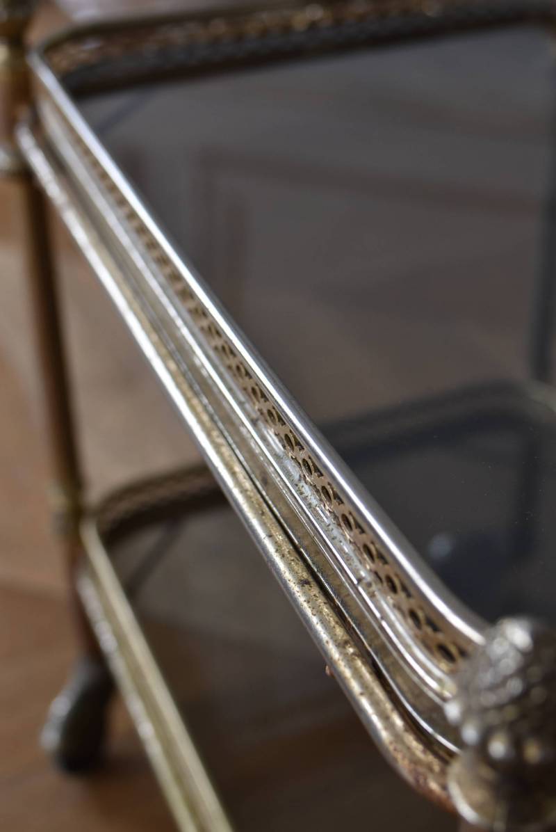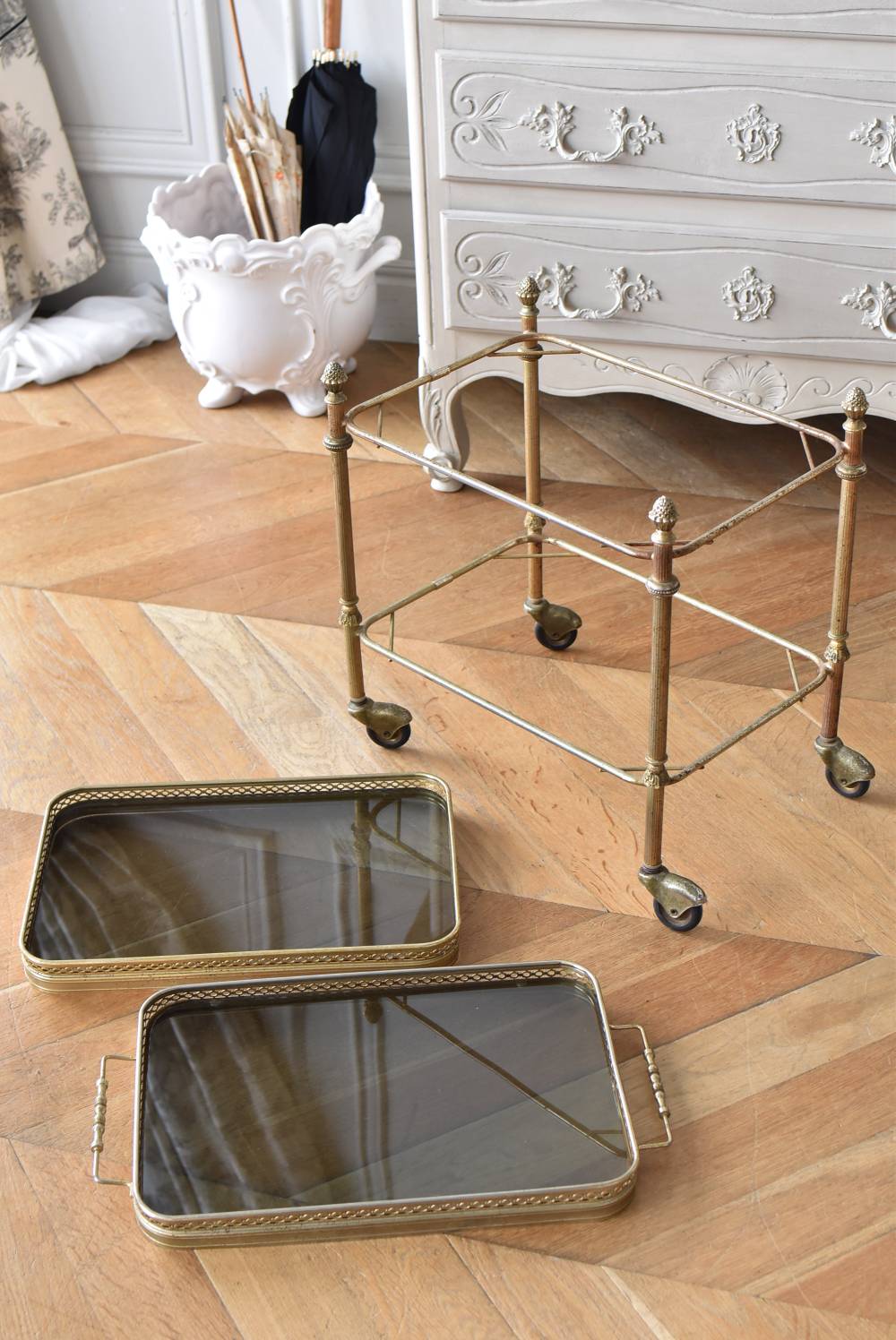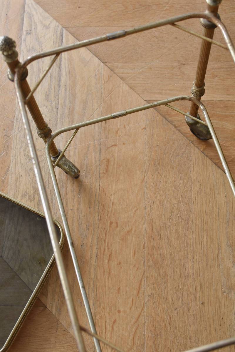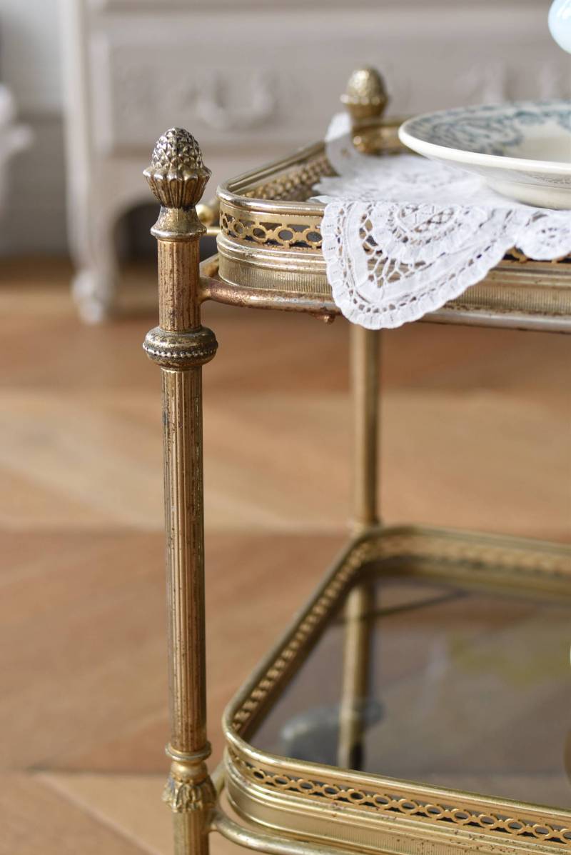 現在もスムーズに動いてくれるキャスターがついた愛くるしい姿は卓上に置いてもバランスが良く、ディスプレイしても存在感を放ってくれます。トレイ側面までもくり抜かれた幾何学的模様に目を惹き、経年によるくすんだゴールドカラーが個性的ながらも上品な雰囲気を演出してくれます。 W 約48cm