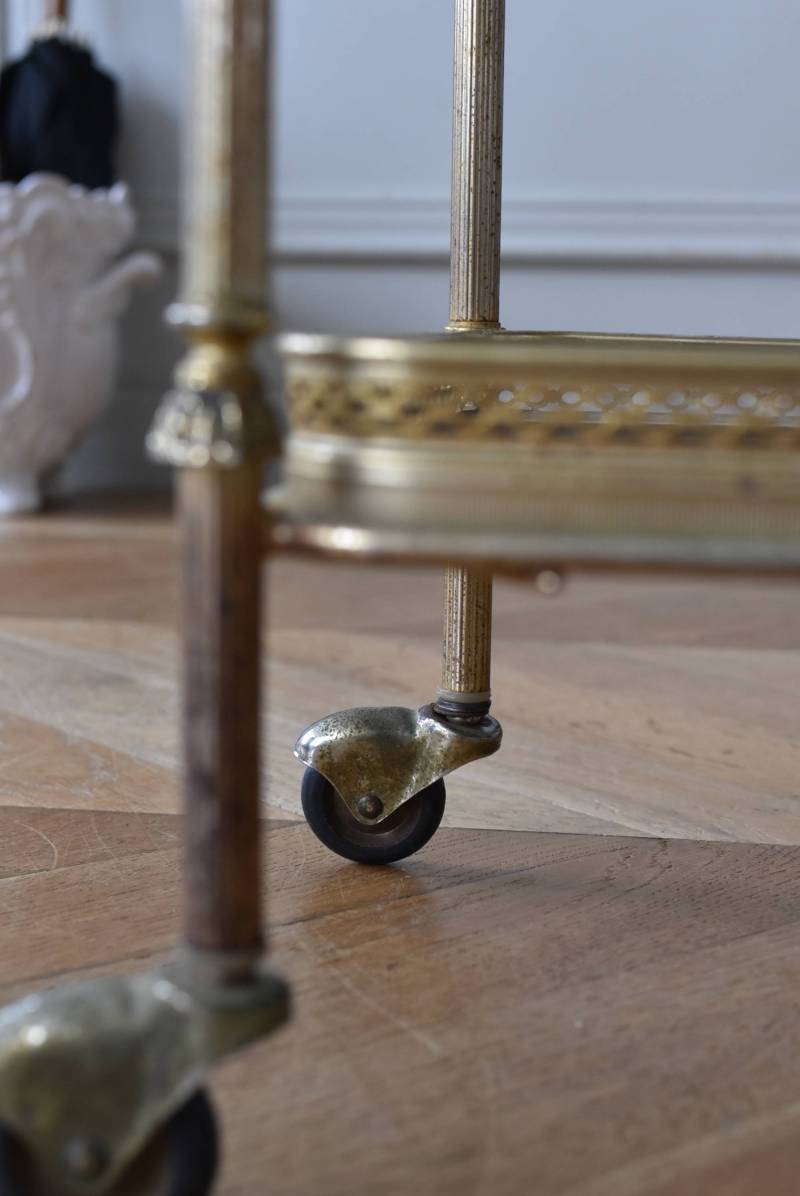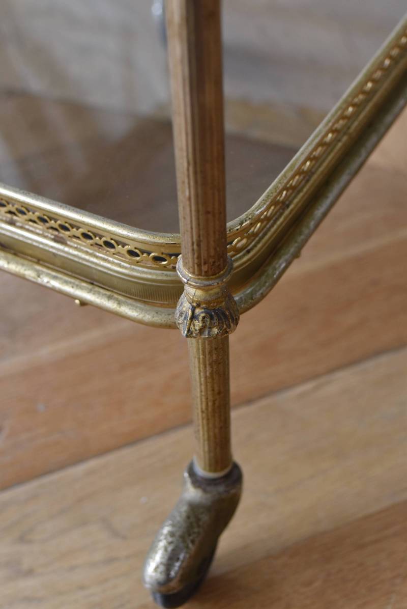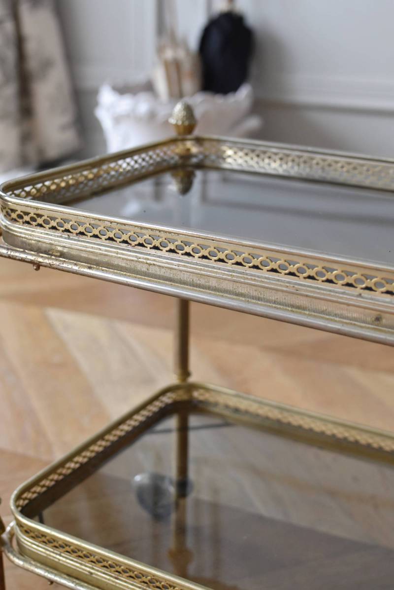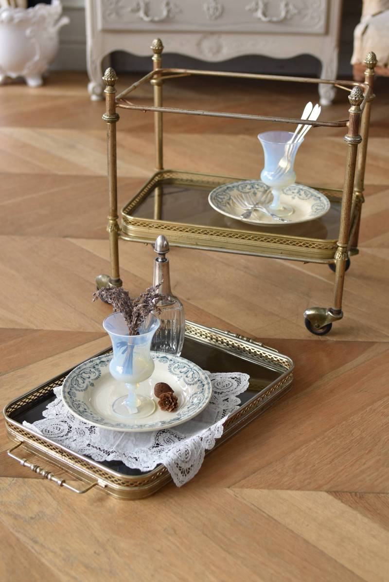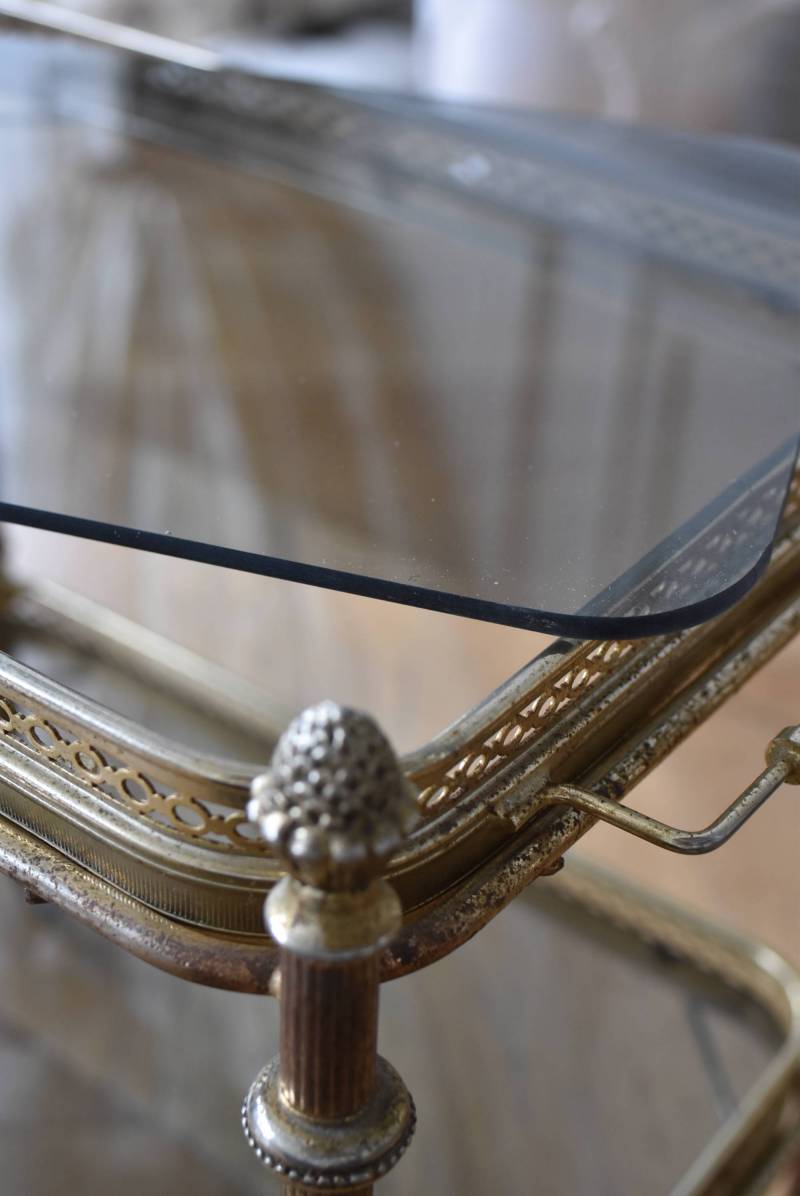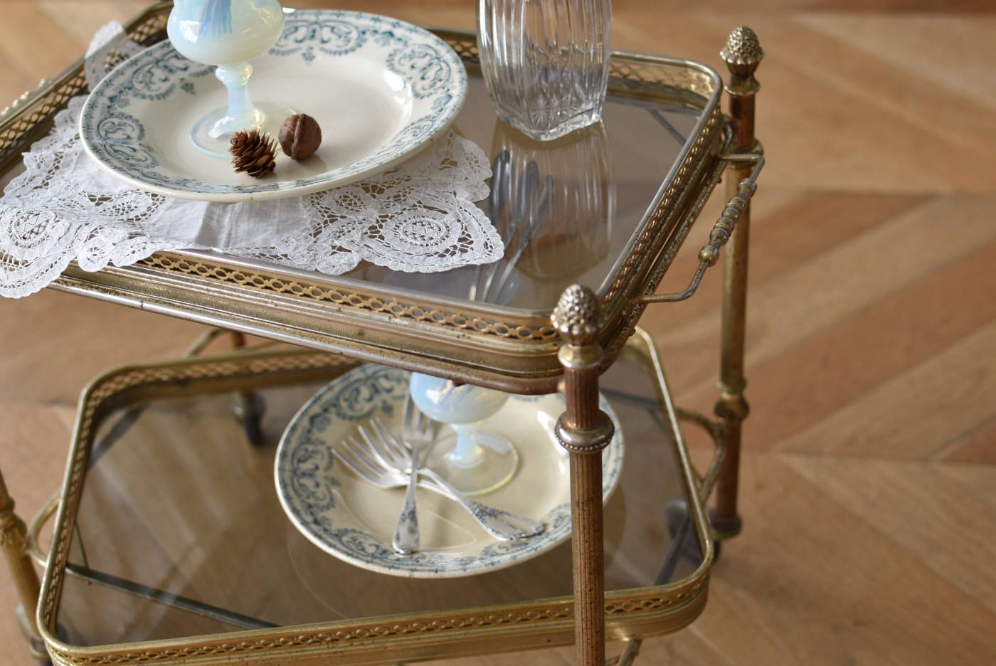 現在もスムーズに動いてくれるキャスターがついた愛くるしい姿は卓上に置いてもバランスが良く、ディスプレイしても存在感を放ってくれます。トレイ側面までもくり抜かれた幾何学的模様に目を惹き、経年によるくすんだゴールドカラーが個性的ながらも上品な雰囲気を演出してくれます。 W 約48cm