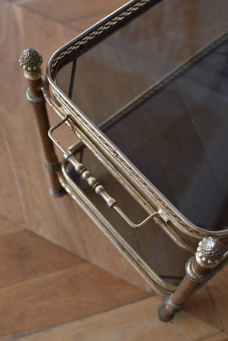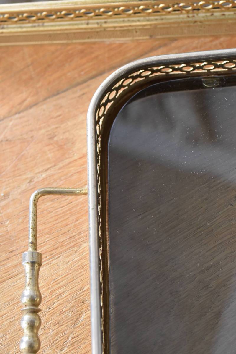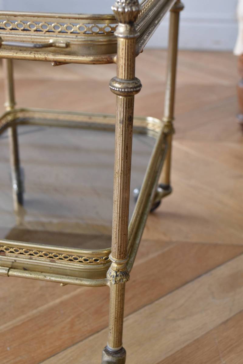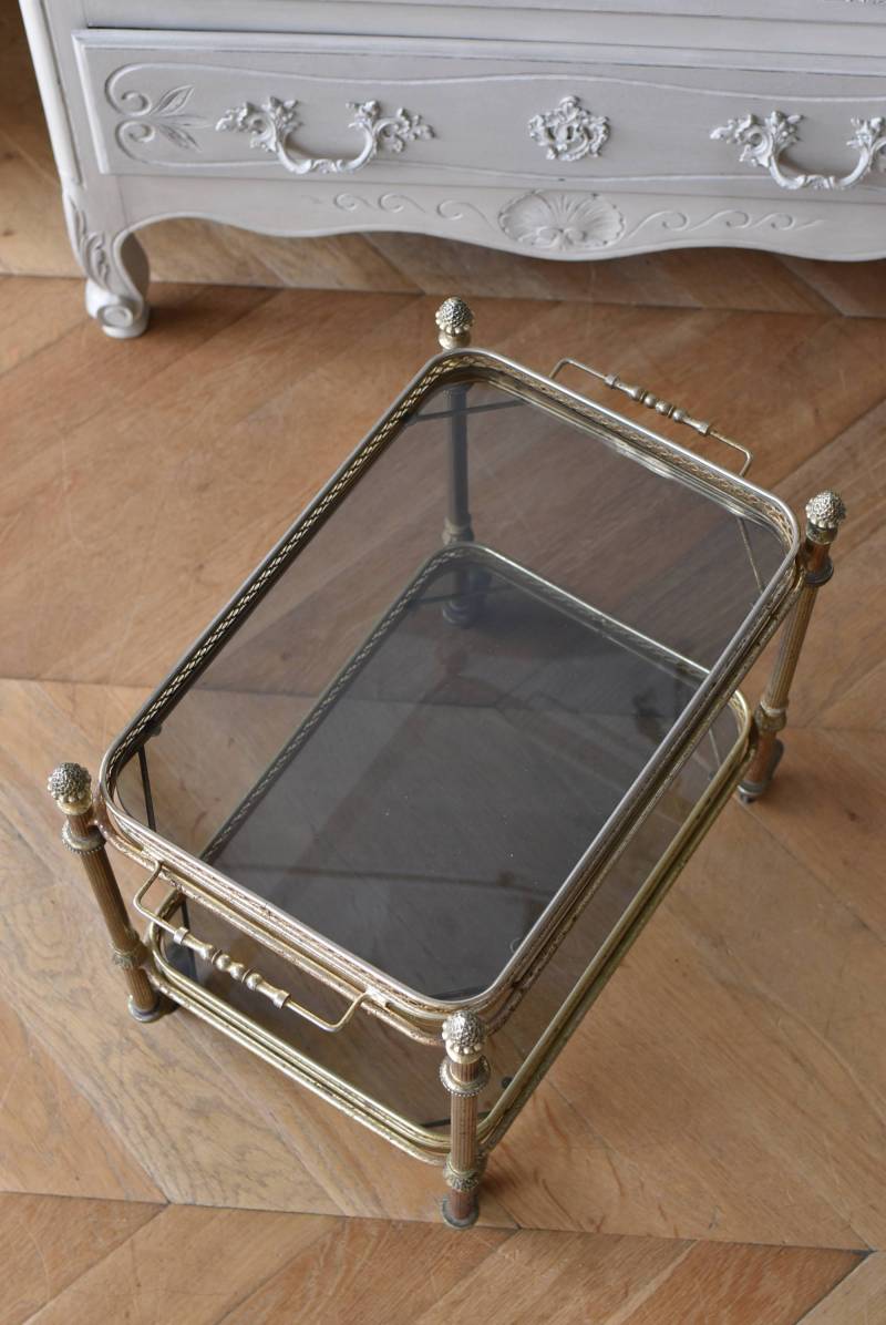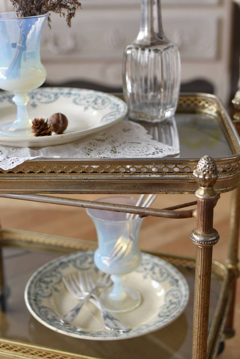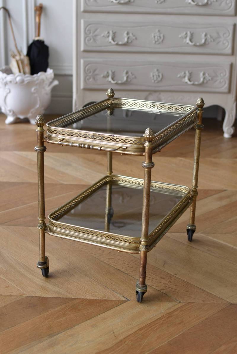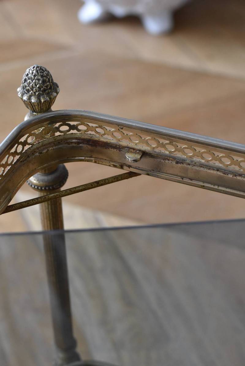 現在もスムーズに動いてくれるキャスターがついた愛くるしい姿は卓上に置いてもバランスが良く、ディスプレイしても存在感を放ってくれます。トレイ側面までもくり抜かれた幾何学的模様に目を惹き、経年によるくすんだゴールドカラーが個性的ながらも上品な雰囲気を演出してくれます。 W 約48cm