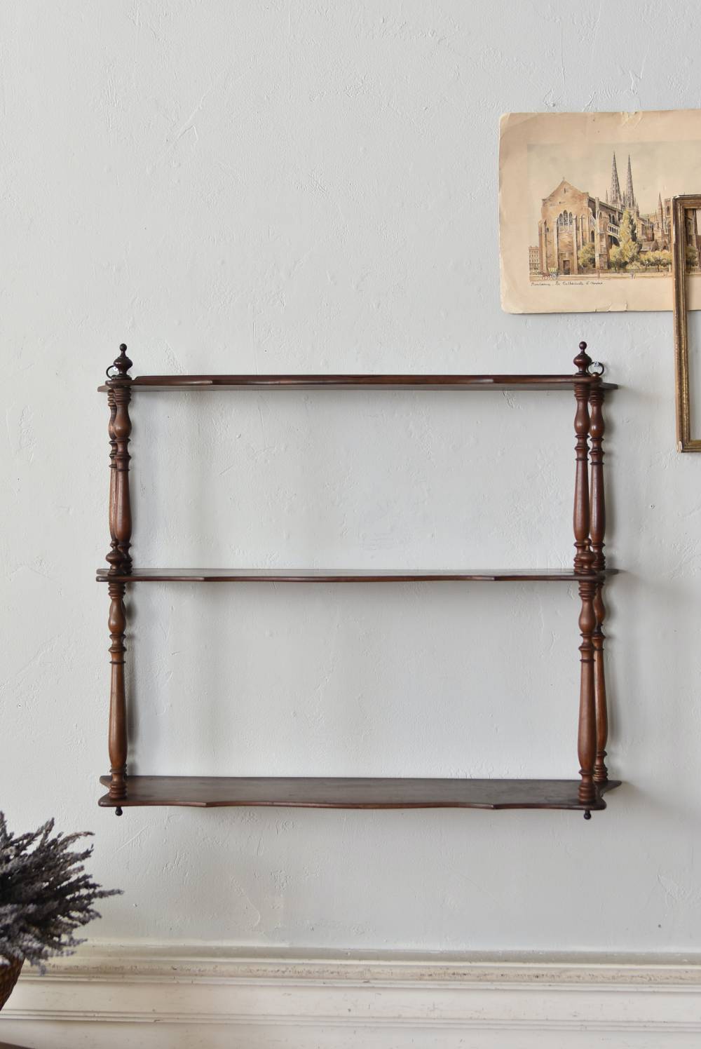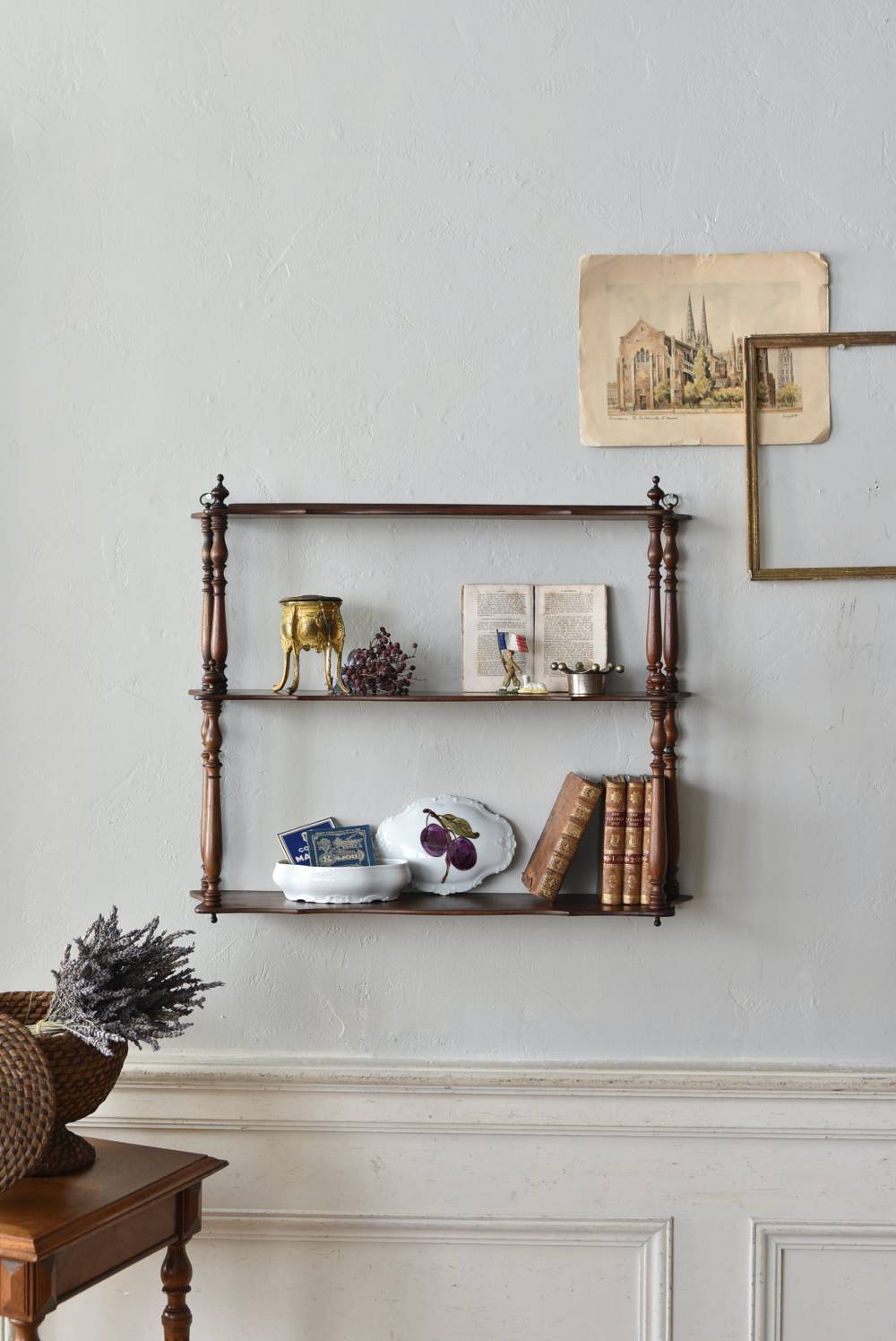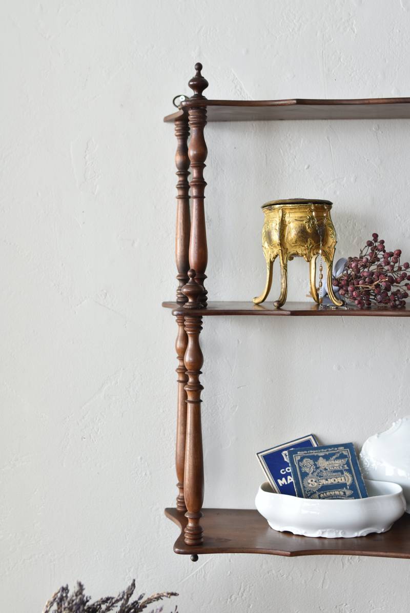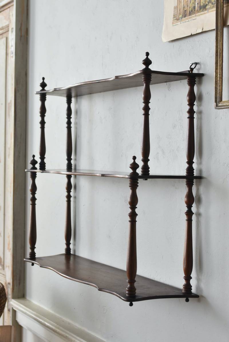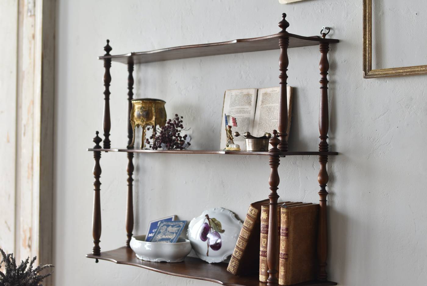 落ち着きあるシックな装いのフレンチウォールシェルフ。 こっくりとした深みのあるブラウンの木材で作られ、滑らかな曲線を描く棚板ラインが優美な佇まい。ぽこぽことした立体的なターニング加工が施された支柱が特徴的で、独自の存在感がある繊細なデザインが魅力の一つとなっています。背面上部に取り付けられたリング型の金具で壁に掛け、壁面に奥行きをプラスしてくれる一品に。 お気に入りの雑貨や古書などを並べて壁面ディスプレイを楽しめるクラシカルな印象のアイテムです。 W 約64cm D 約16.7cm H 約54cm 棚板間隔(上から) 約21.8cm/約24.5cm 重量 約1.8kg
