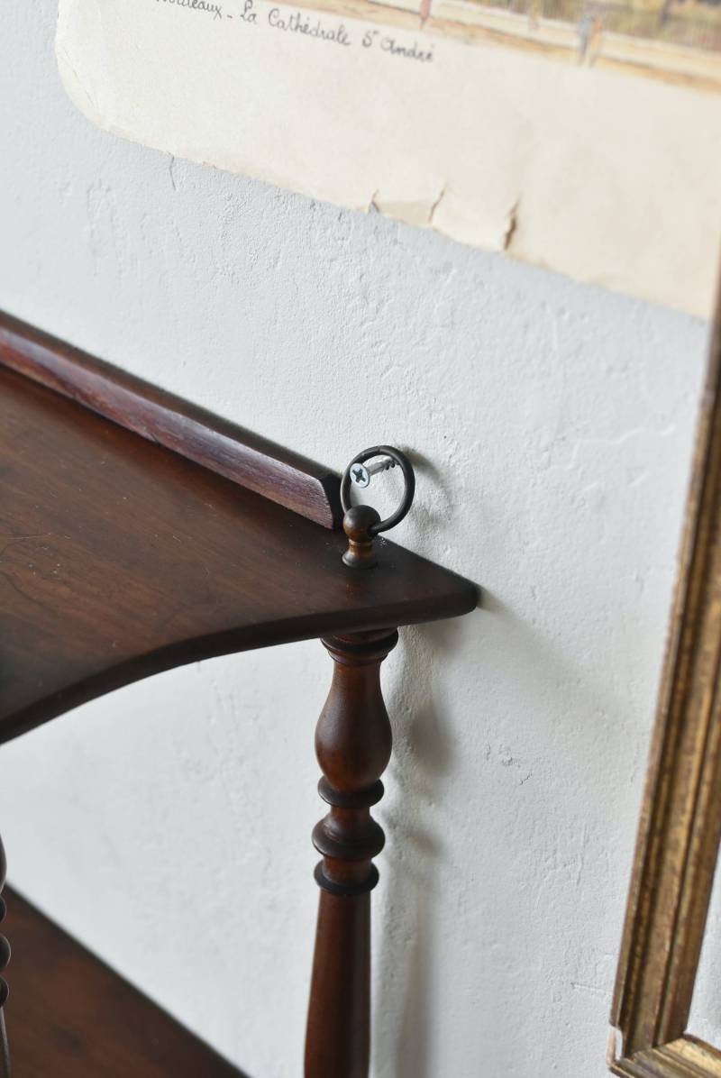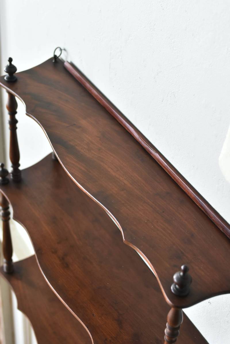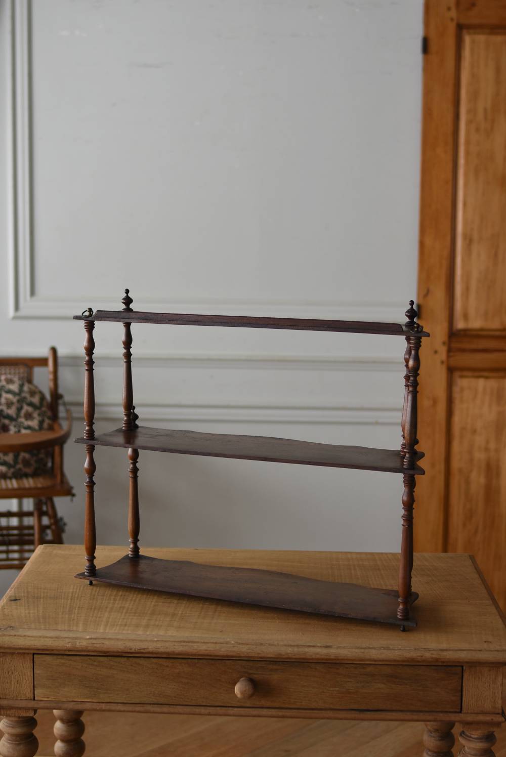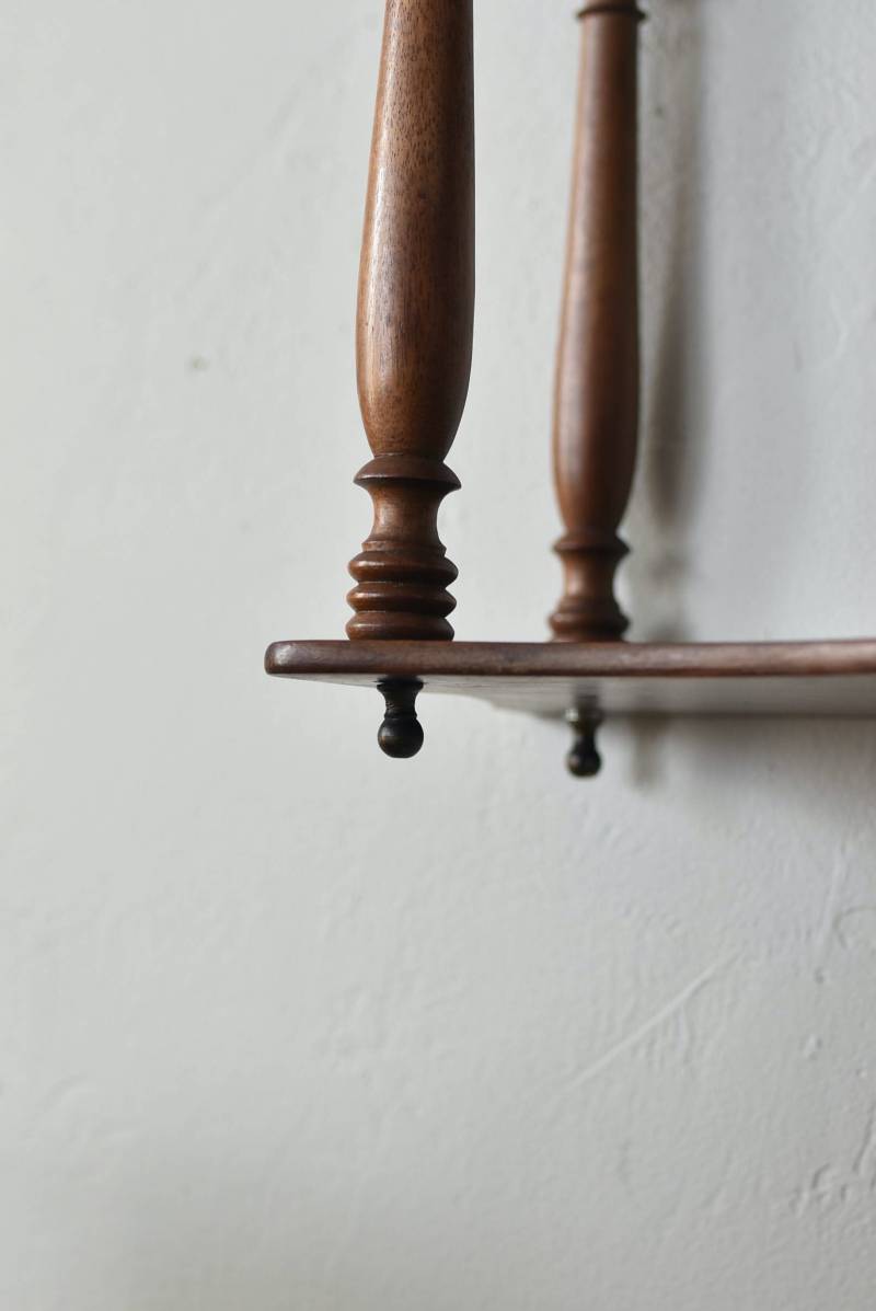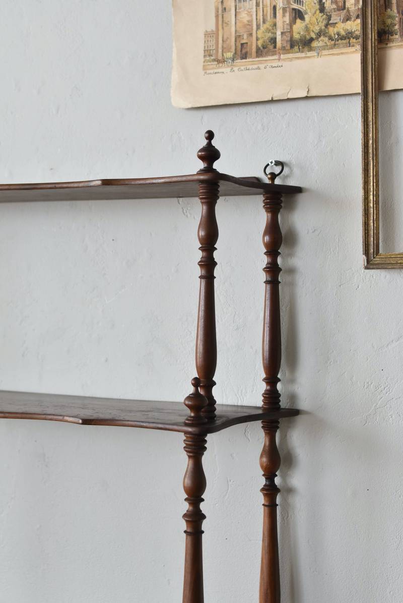 落ち着きあるシックな装いのフレンチウォールシェルフ。 こっくりとした深みのあるブラウンの木材で作られ、滑らかな曲線を描く棚板ラインが優美な佇まい。ぽこぽことした立体的なターニング加工が施された支柱が特徴的で、独自の存在感がある繊細なデザインが魅力の一つとなっています。背面上部に取り付けられたリング型の金具で壁に掛け、壁面に奥行きをプラスしてくれる一品に。 お気に入りの雑貨や古書などを並べて壁面ディスプレイを楽しめるクラシカルな印象のアイテムです。 W 約64cm D 約16.7cm H 約54cm 棚板間隔(上から) 約21.8cm/約24.5cm 重量 約1.8kg