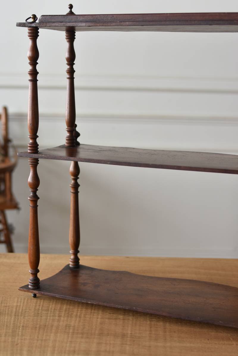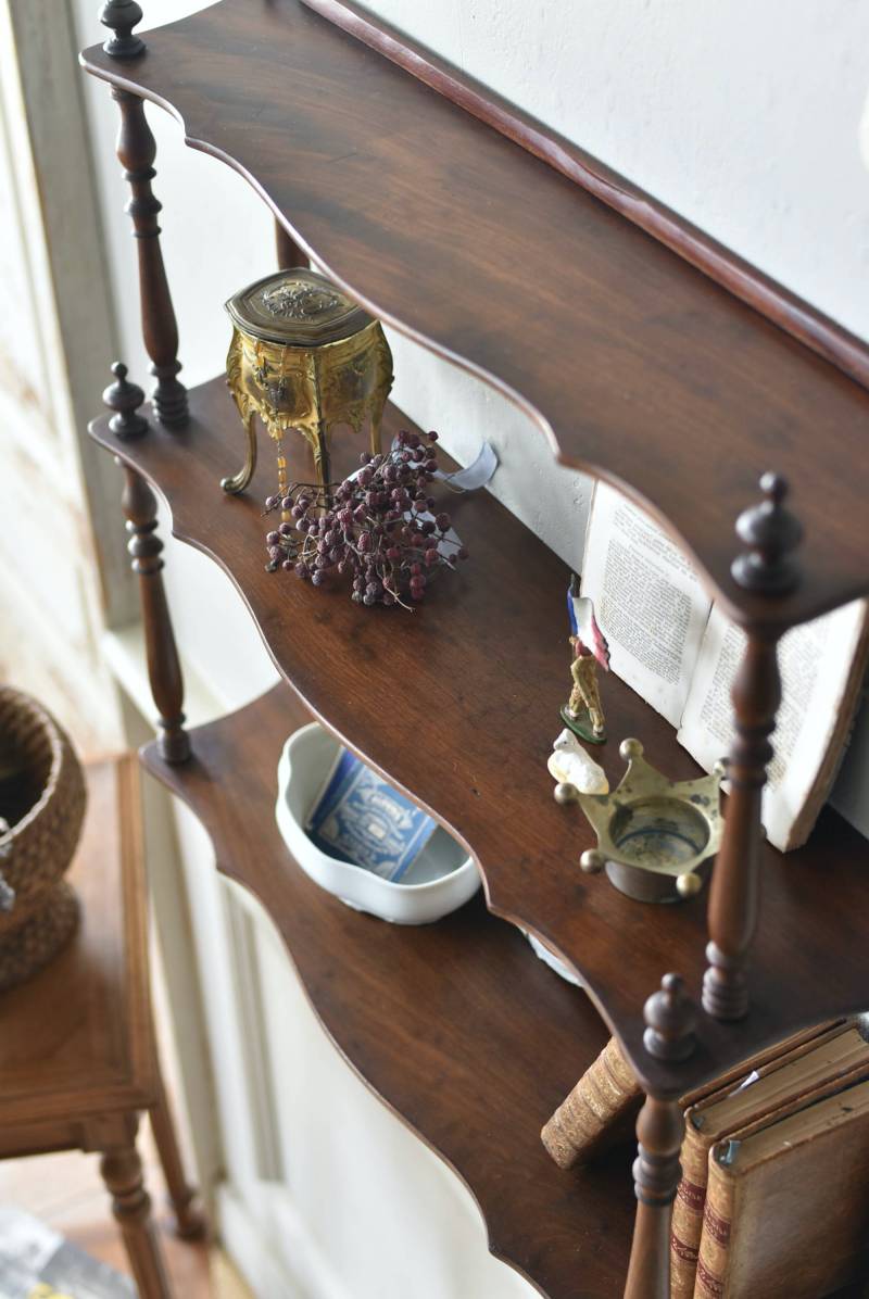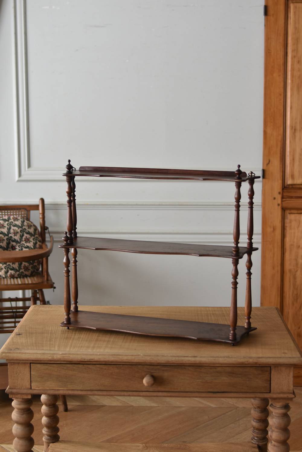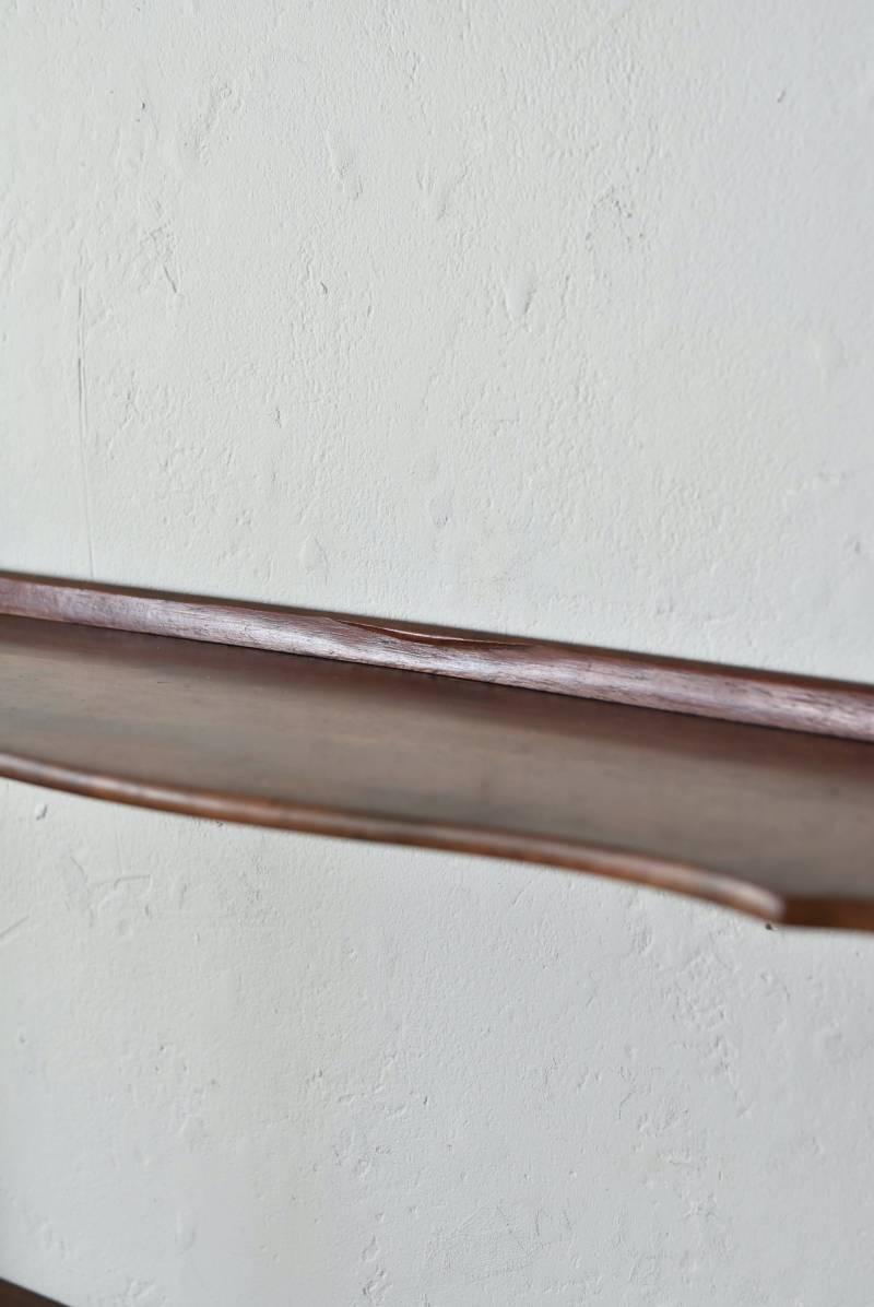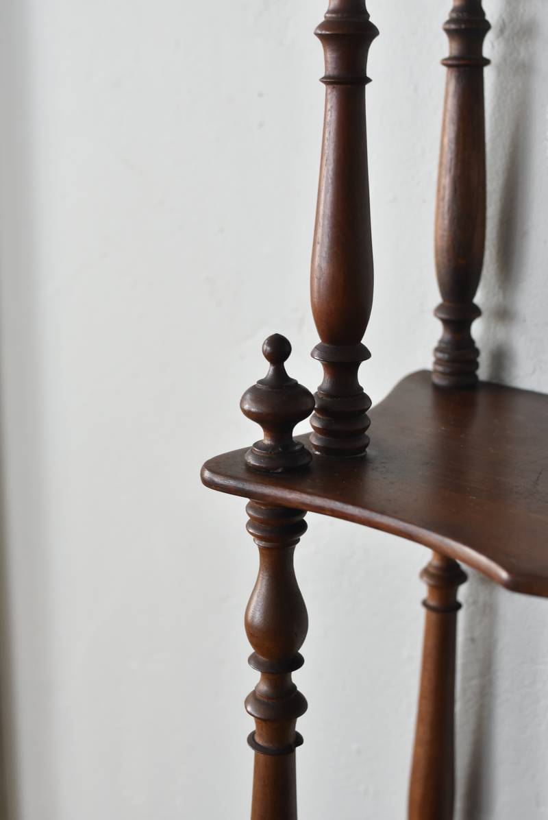 落ち着きあるシックな装いのフレンチウォールシェルフ。 こっくりとした深みのあるブラウンの木材で作られ、滑らかな曲線を描く棚板ラインが優美な佇まい。ぽこぽことした立体的なターニング加工が施された支柱が特徴的で、独自の存在感がある繊細なデザインが魅力の一つとなっています。背面上部に取り付けられたリング型の金具で壁に掛け、壁面に奥行きをプラスしてくれる一品に。 お気に入りの雑貨や古書などを並べて壁面ディスプレイを楽しめるクラシカルな印象のアイテムです。 W 約64cm D 約16.7cm H 約54cm 棚板間隔(上から) 約21.8cm/約24.5cm 重量 約1.8kg
