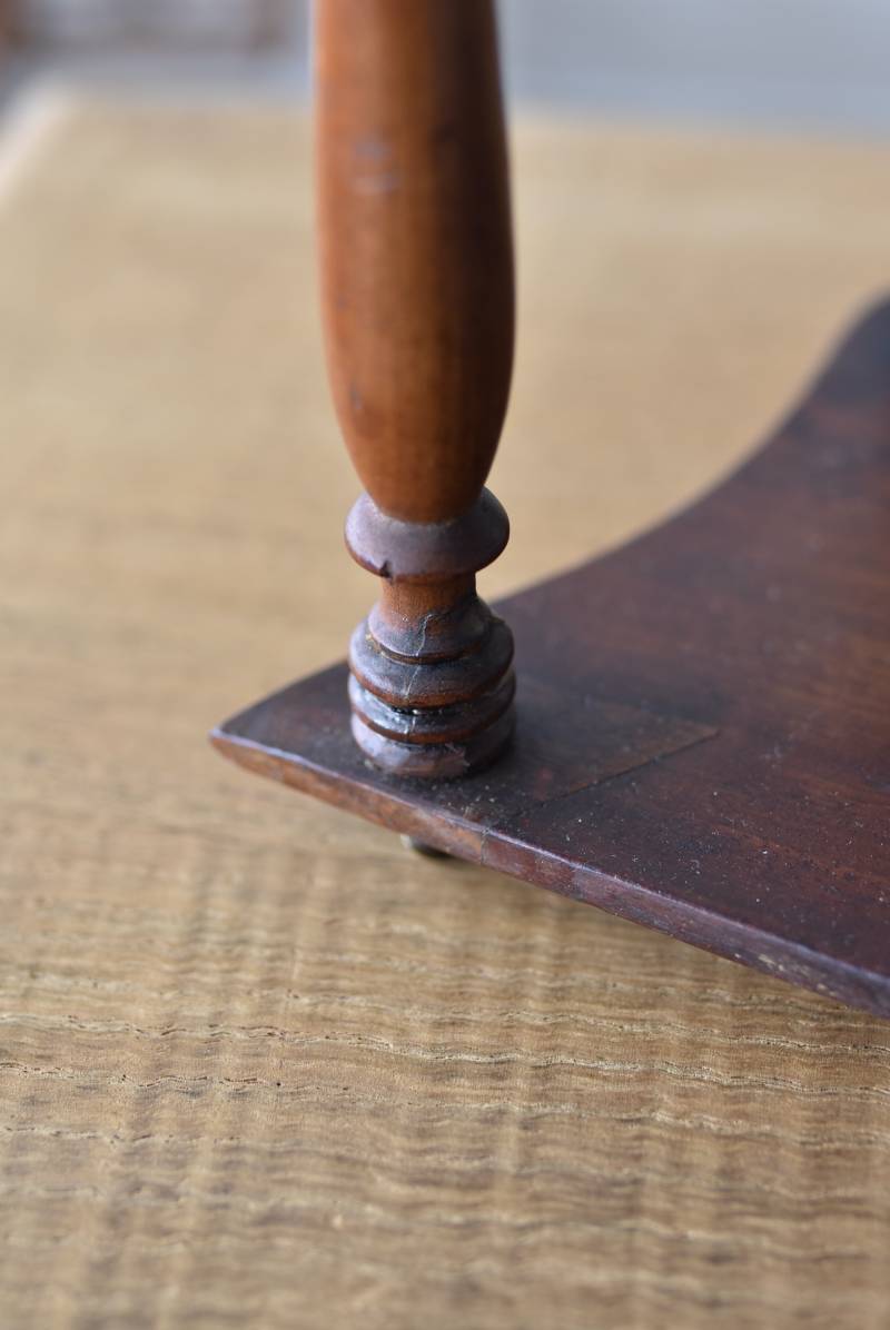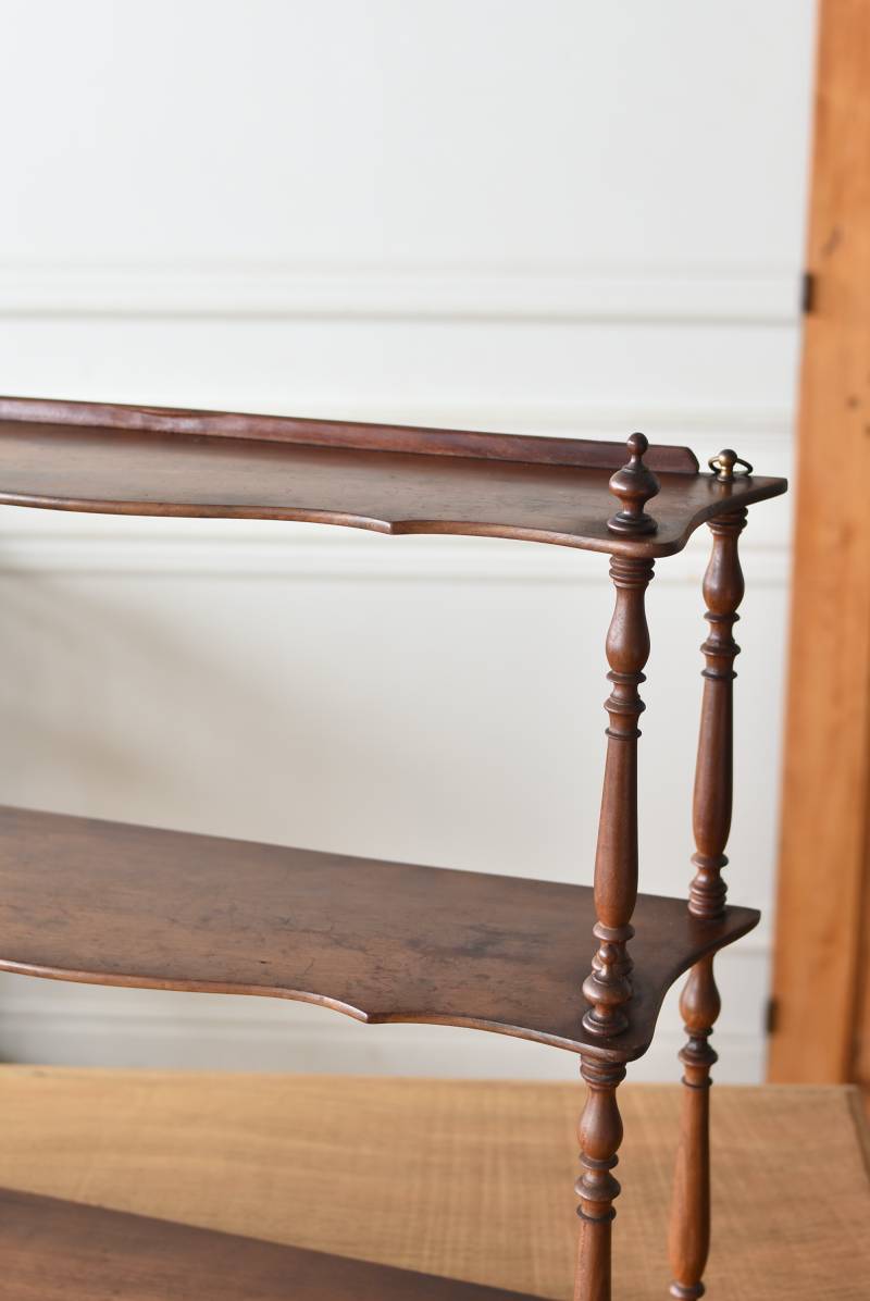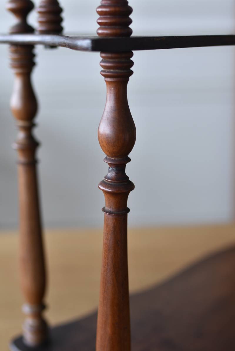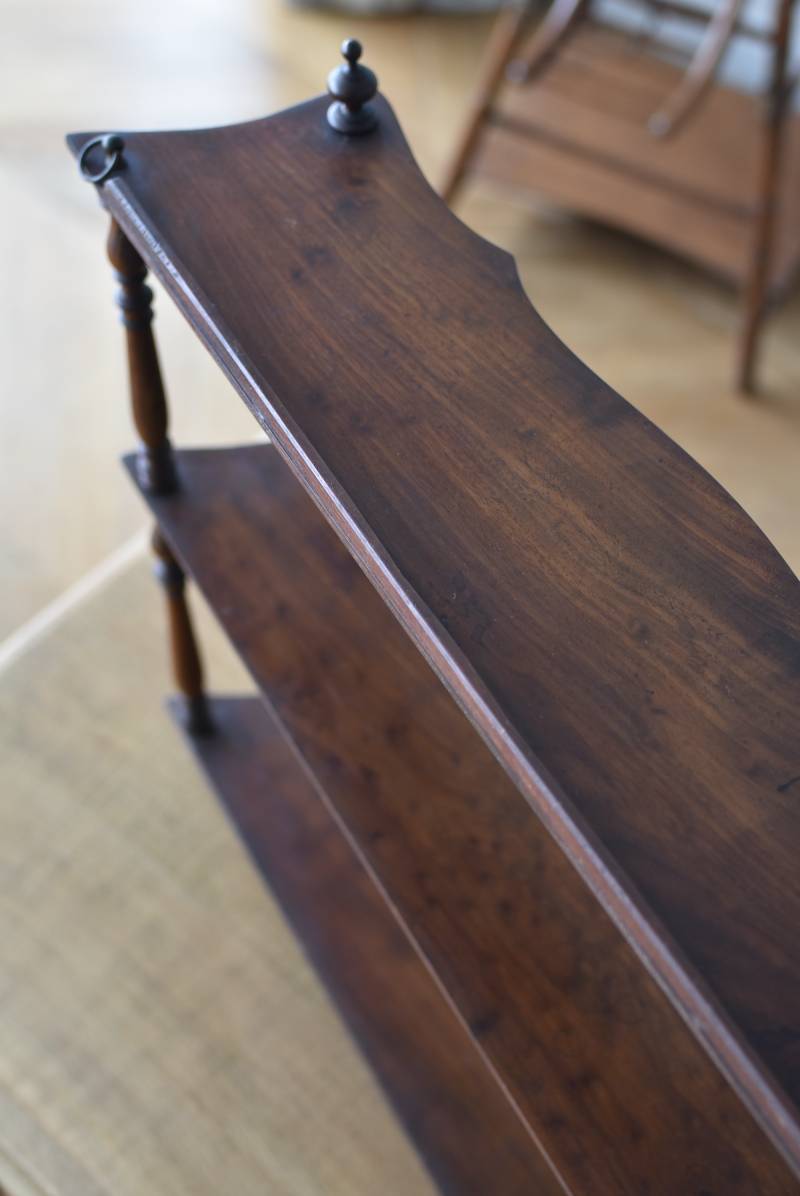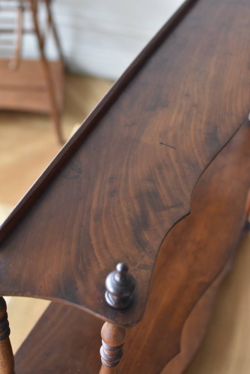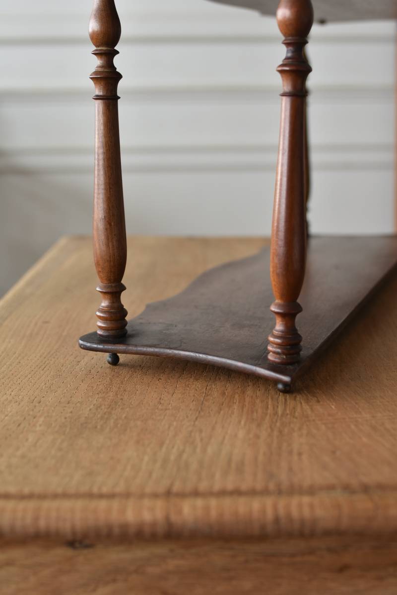 落ち着きあるシックな装いのフレンチウォールシェルフ。 こっくりとした深みのあるブラウンの木材で作られ、滑らかな曲線を描く棚板ラインが優美な佇まい。ぽこぽことした立体的なターニング加工が施された支柱が特徴的で、独自の存在感がある繊細なデザインが魅力の一つとなっています。背面上部に取り付けられたリング型の金具で壁に掛け、壁面に奥行きをプラスしてくれる一品に。 お気に入りの雑貨や古書などを並べて壁面ディスプレイを楽しめるクラシカルな印象のアイテムです。 W 約64cm D 約16.7cm H 約54cm 棚板間隔(上から) 約21.8cm/約24.5cm 重量 約1.8kg