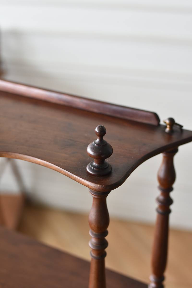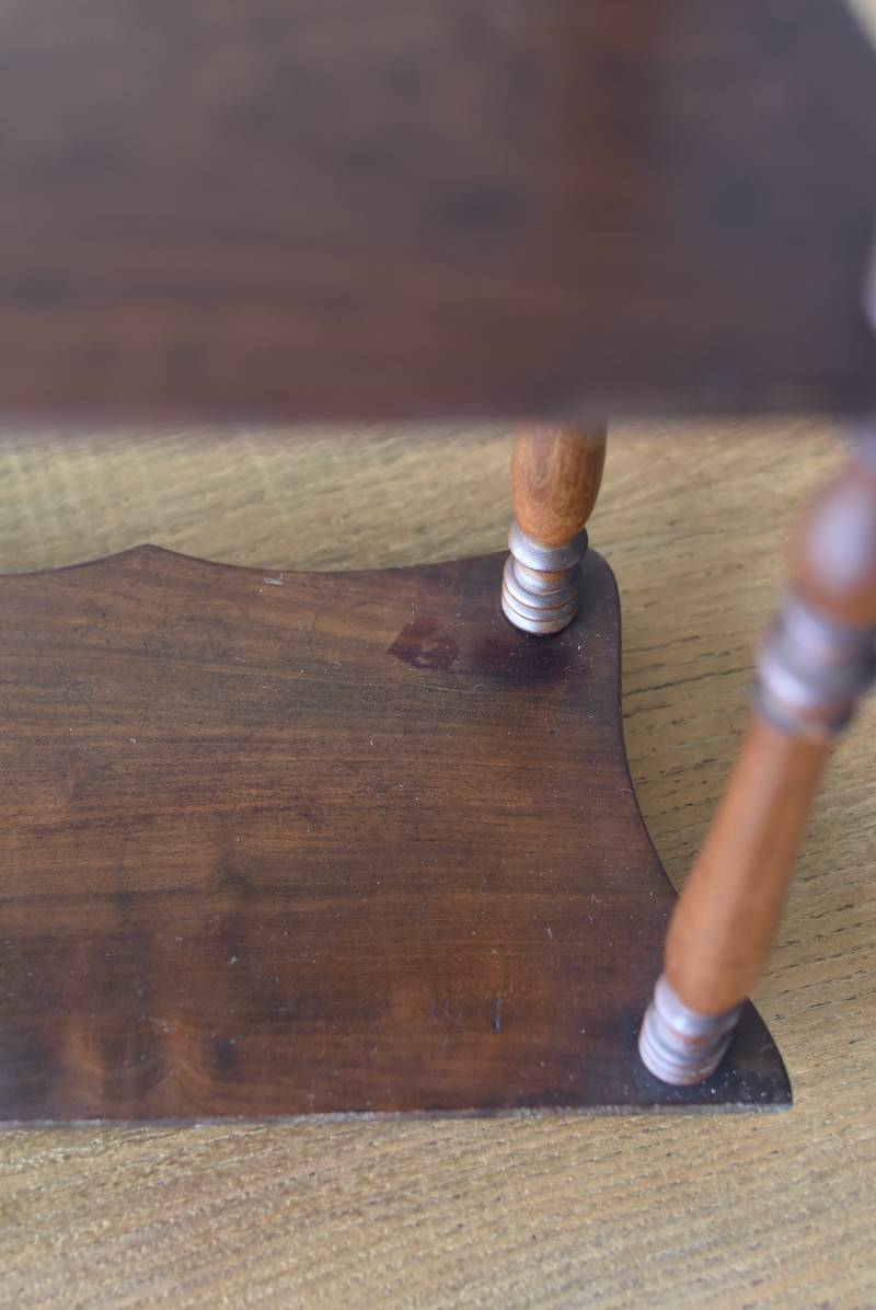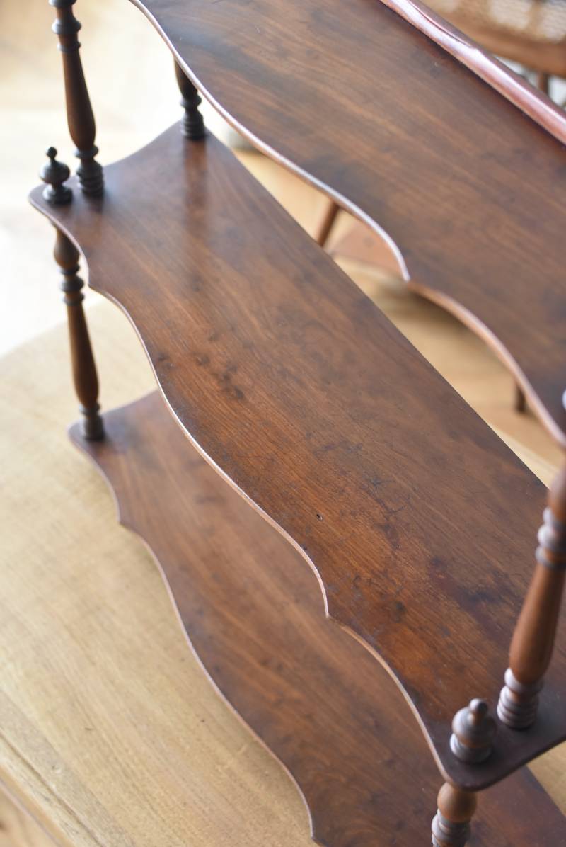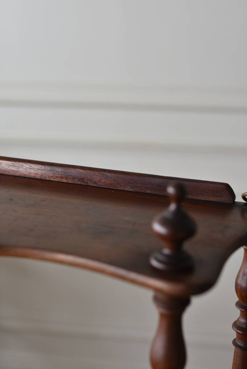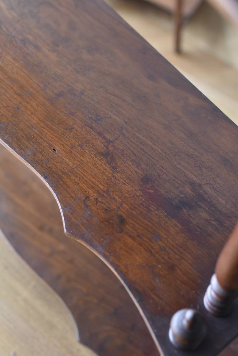 落ち着きあるシックな装いのフレンチウォールシェルフ。 こっくりとした深みのあるブラウンの木材で作られ、滑らかな曲線を描く棚板ラインが優美な佇まい。ぽこぽことした立体的なターニング加工が施された支柱が特徴的で、独自の存在感がある繊細なデザインが魅力の一つとなっています。背面上部に取り付けられたリング型の金具で壁に掛け、壁面に奥行きをプラスしてくれる一品に。 お気に入りの雑貨や古書などを並べて壁面ディスプレイを楽しめるクラシカルな印象のアイテムです。 W 約64cm D 約16.7cm H 約54cm 棚板間隔(上から) 約21.8cm/約24.5cm 重量 約1.8kg
