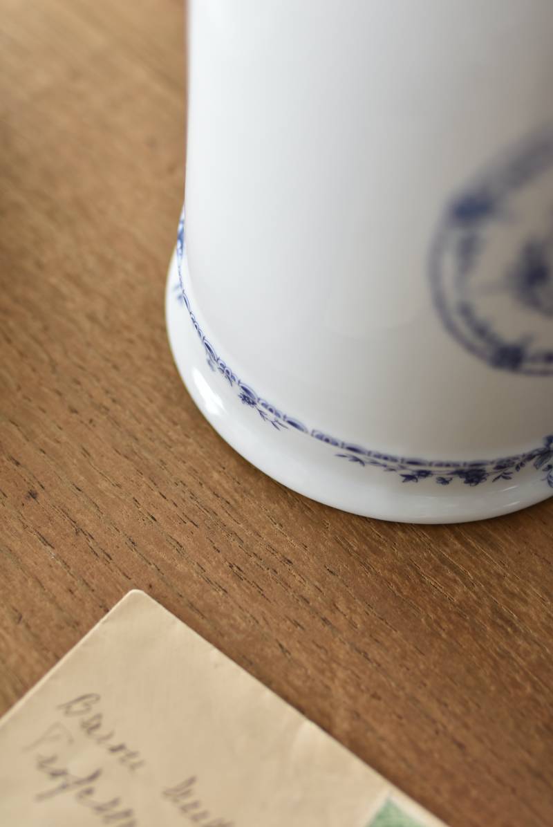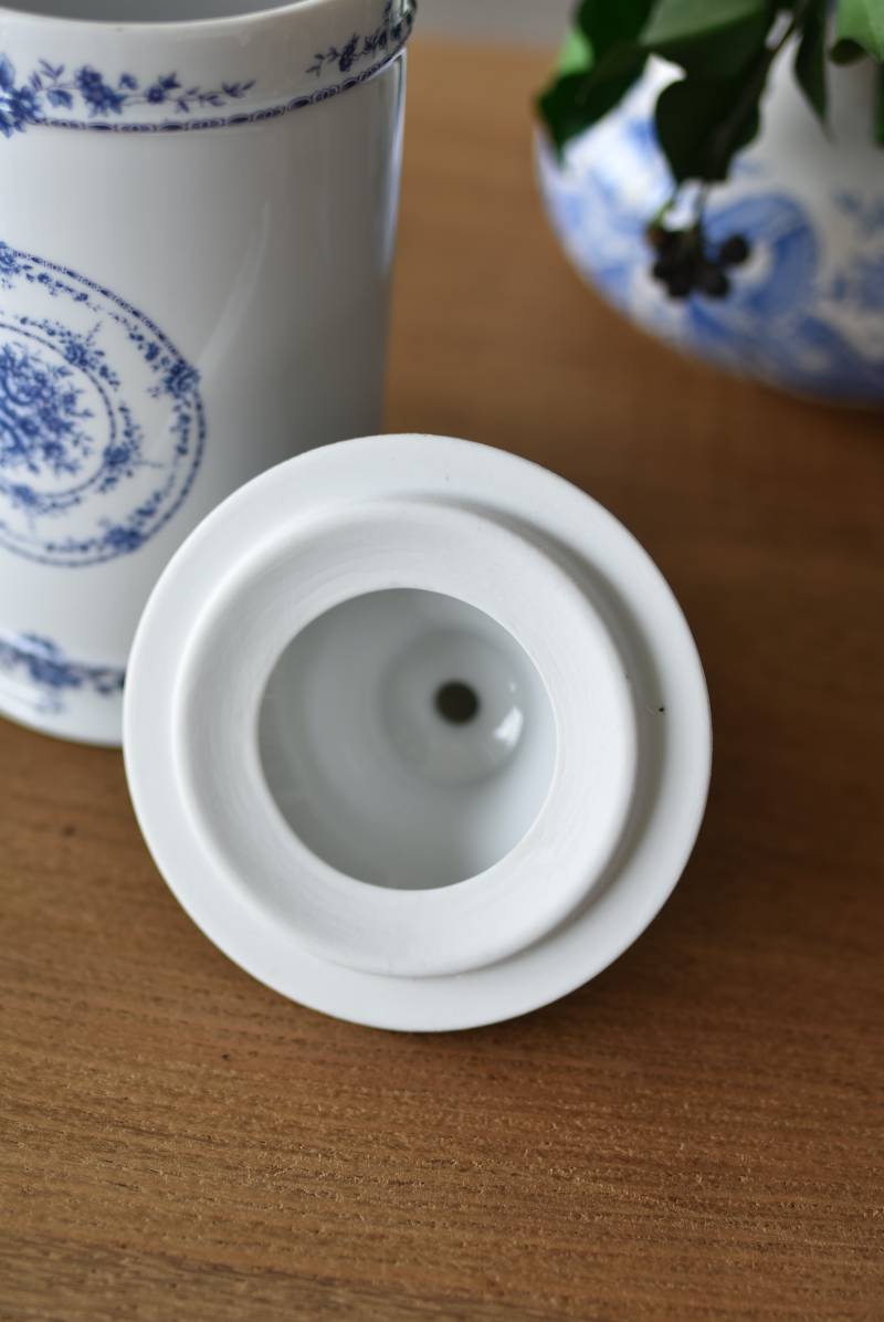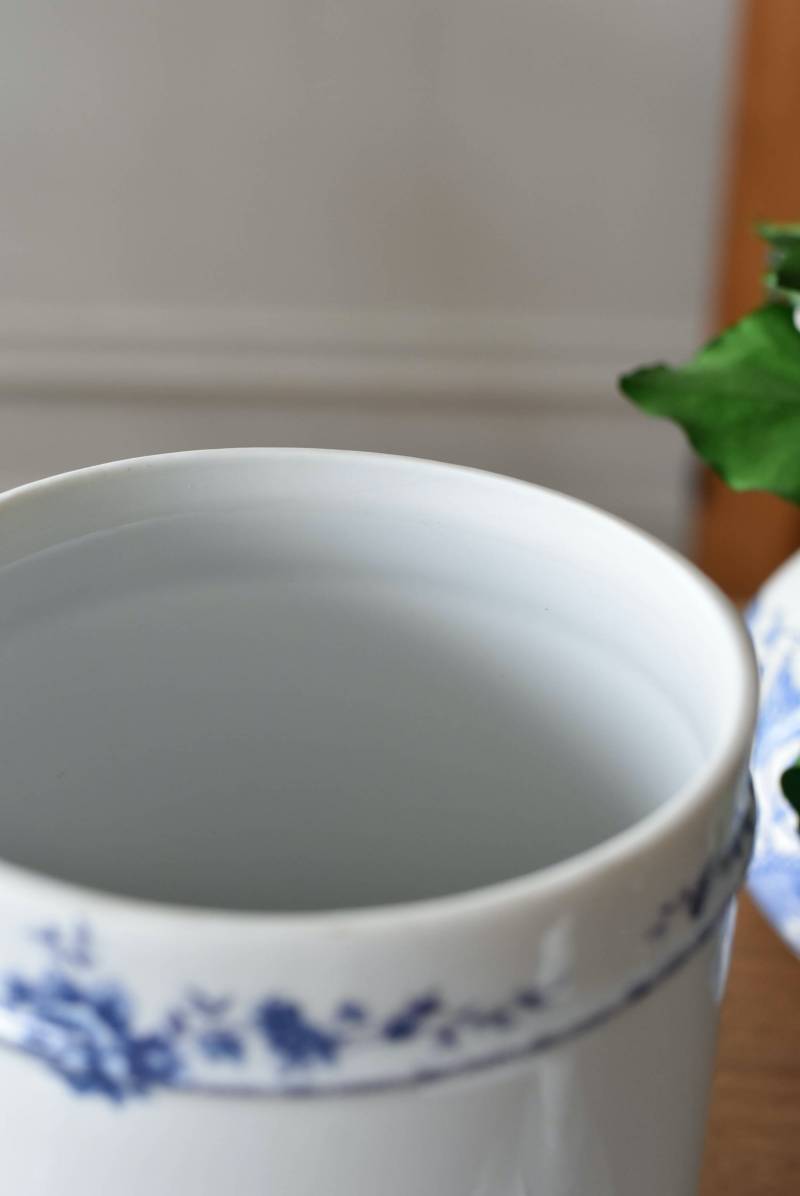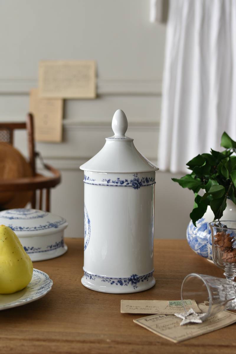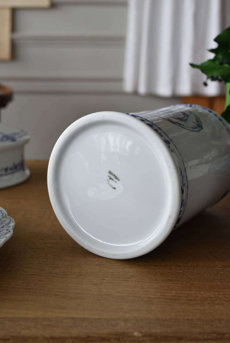 フランス・Limoges(リモージュ)のアンティークポット。 透き通るような白磁に澄んだブルーの模様が清楚で上品な印象の佇まい。艶やかな質感のボディはすらりとした高さのあるシルエットで、表面にあしらわれた繊細なお花の絵柄がエレガントな空間にも映える可憐なデザインとなっています。底裏には"Limoges"france"としっかりバックスタンプも押されている一品に。 大きすぎない程よいサイズ感で卓上ディスプレイとしても飾りやすく、スティックタイプのインセンスなどの長さのあるアイテムを収納するポットとしても活躍してくれるアイテムです。同じシリーズの小物入れと揃えてのご使用もおすすめです。 直径 約11.5cm H 約25cm 深さ 約16.5cm 口径 約9.5cm